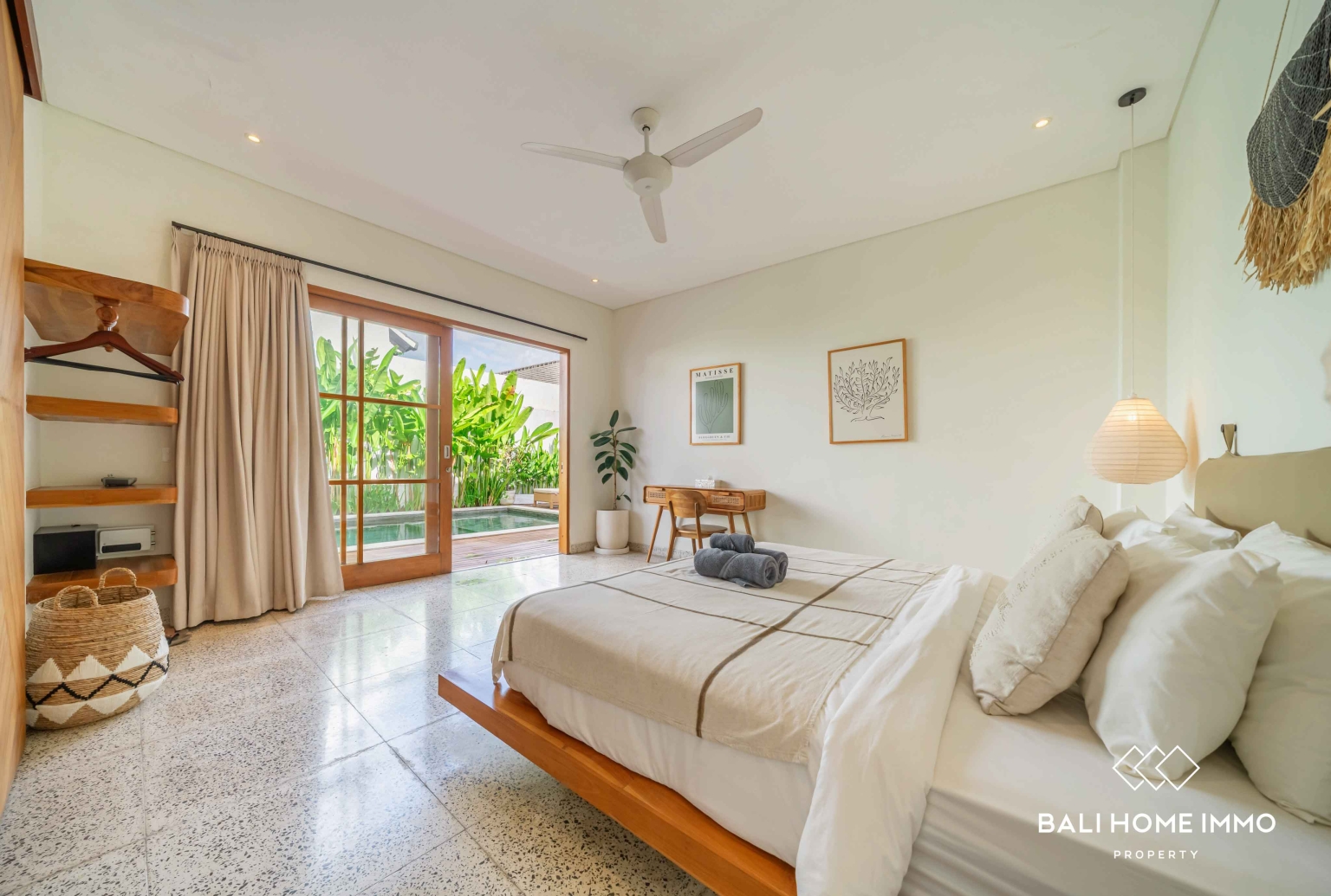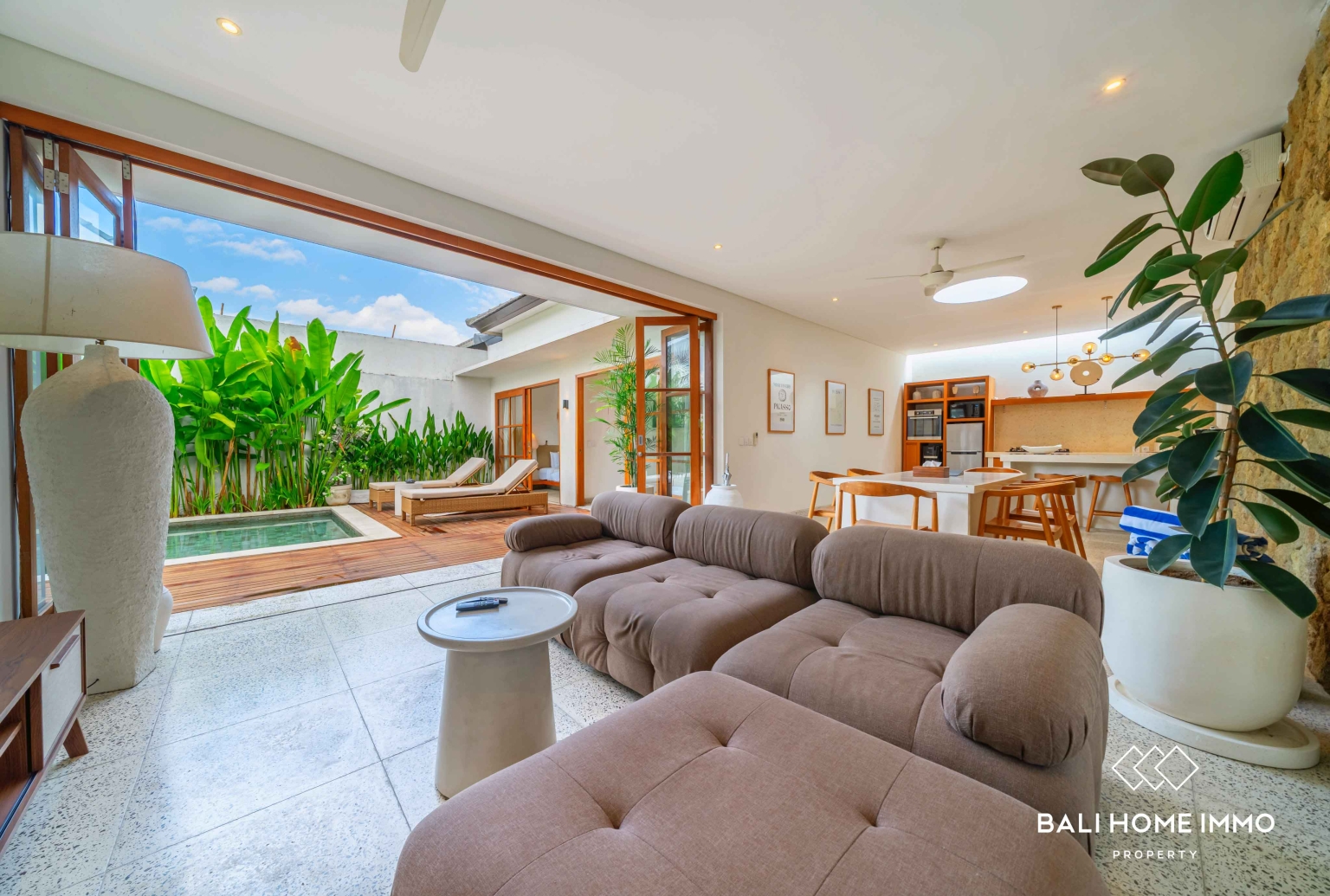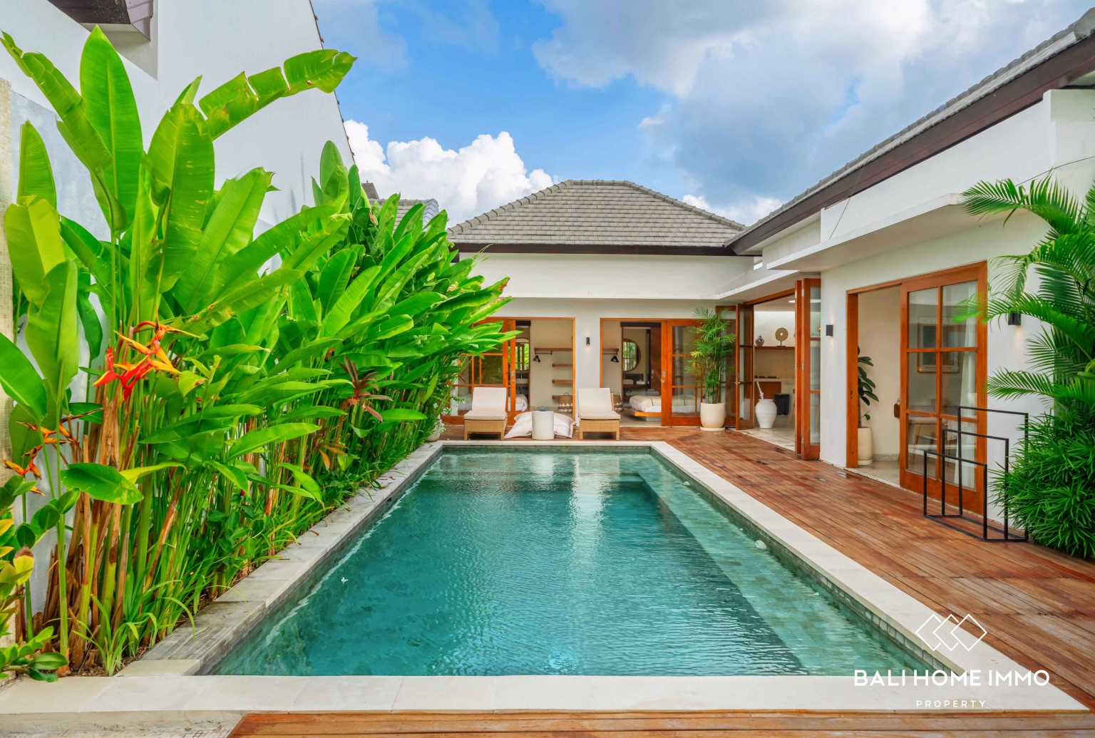 En sortant, vous découvrirez une magnifique piscine privée entourée d'une vaste terrasse. Cet espace extérieur généreux est idéal pour profiter du soleil généreux de Bali. Vous y trouverez suffisamment de place pour installer des transats, un salon de jardin, ou tout simplement vous détendre avec un livre pendant que les enfants s'amusent dans la piscine. La terrasse spacieuse se prête également parfaitement à l'organisation de réunions informelles entre amis ou à de paisibles après-midi en famille dans votre propre havre de paix tropical.