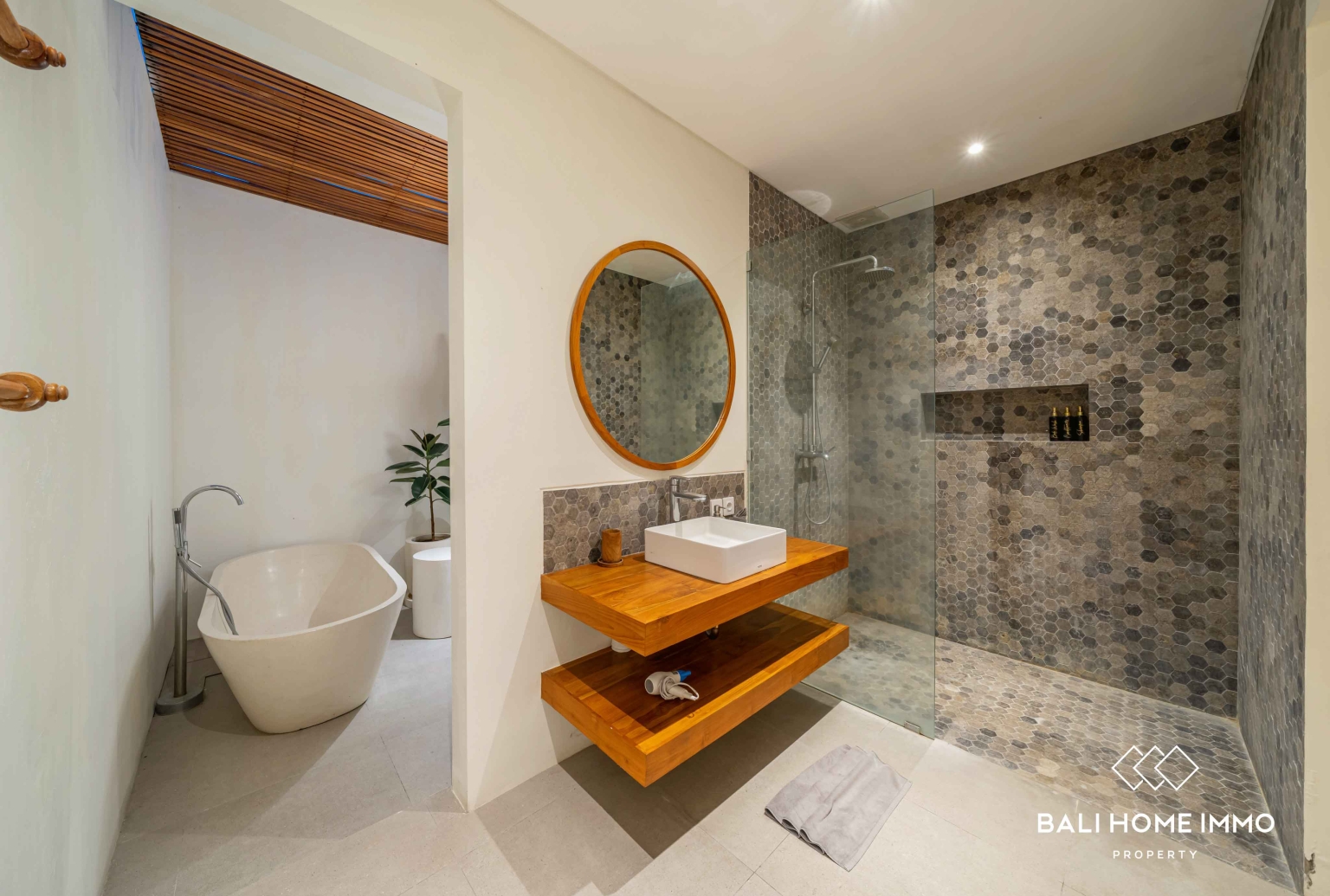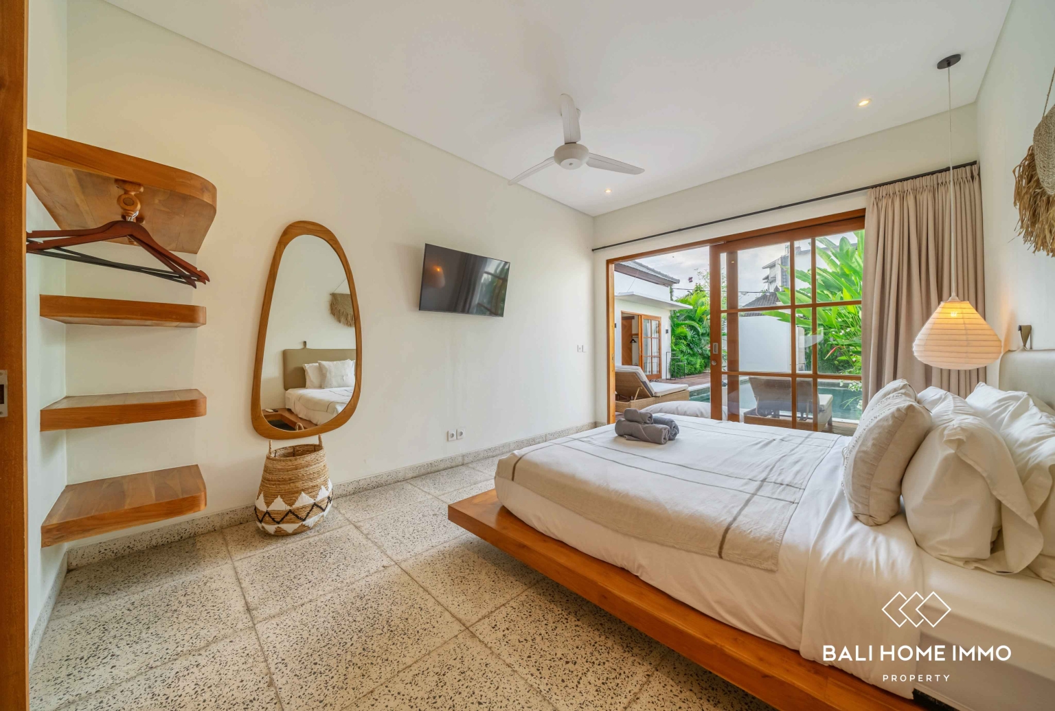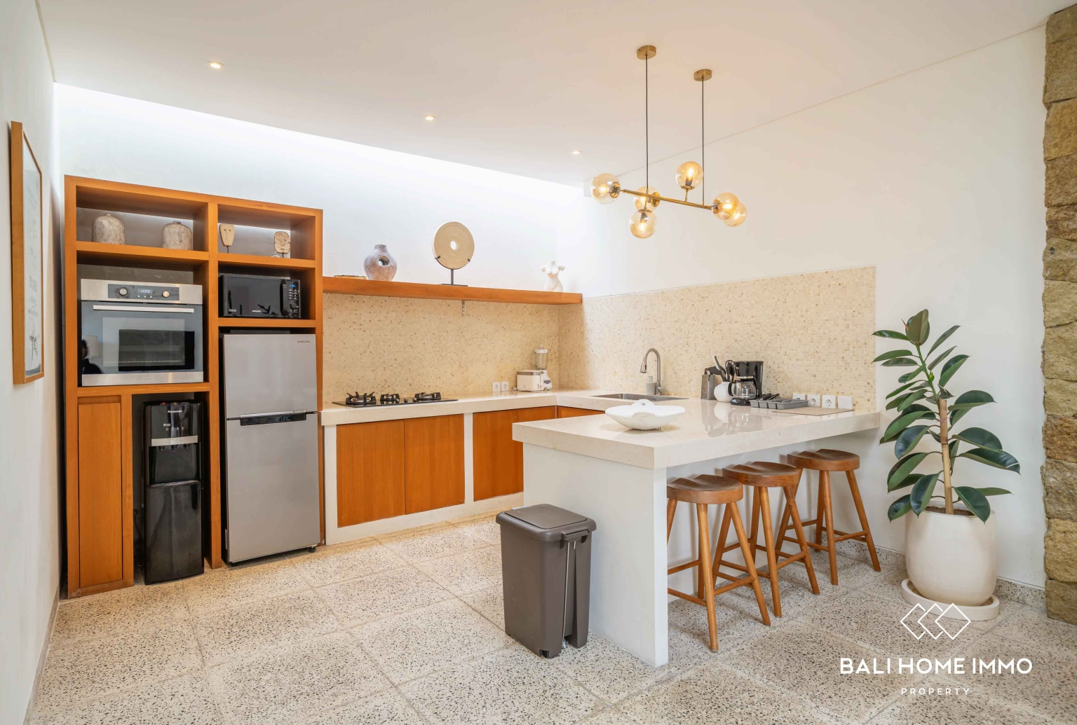 En sortant, vous découvrirez une magnifique piscine privée entourée d'une vaste terrasse. Cet espace extérieur généreux est idéal pour profiter du soleil généreux de Bali. Vous y trouverez suffisamment de place pour installer des transats, un salon de jardin, ou tout simplement vous détendre avec un livre pendant que les enfants s'amusent dans la piscine. La terrasse spacieuse se prête également parfaitement à l'organisation de réunions informelles entre amis ou à de paisibles après-midi en famille dans votre propre havre de paix tropical.