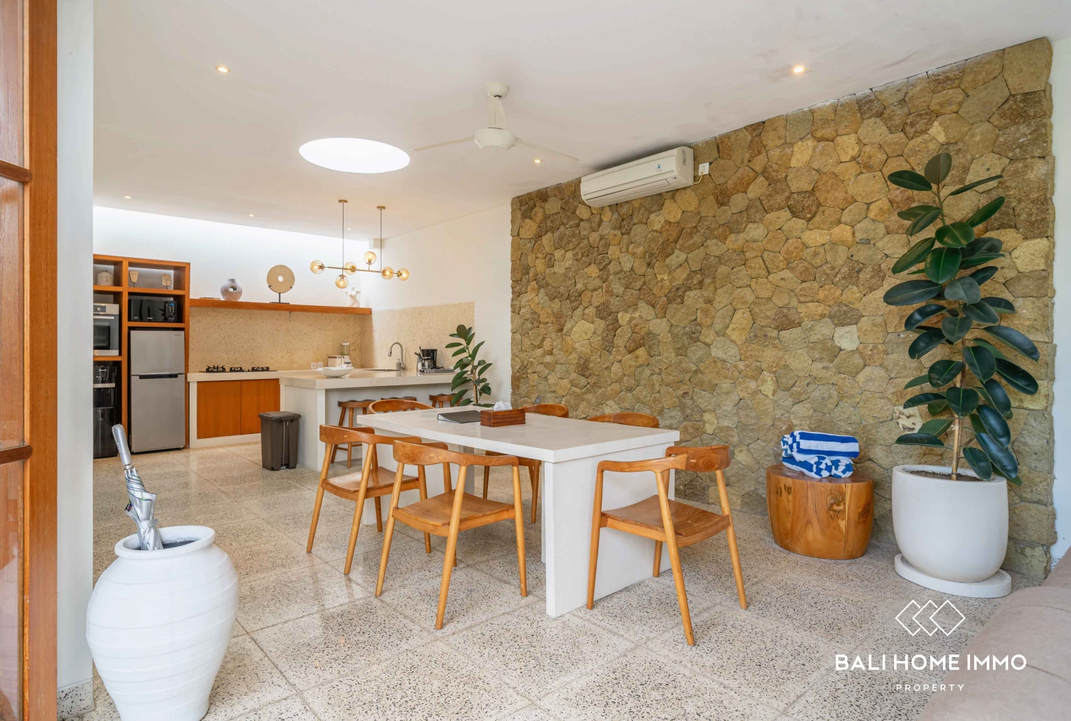 Au cœur de la maison se trouve le salon et la cuisine ouverts, offrant un espace convivial et fonctionnel où la famille peut se réunir tout au long de la journée. L'agencement fermé offre confort et praticité, notamment pour les familles avec enfants, permettant de profiter de l'espace dans un environnement frais et sécurisé. Que ce soit pour préparer les repas dans la cuisine, partager un dîner en famille ou se détendre sur le canapé après une longue journée, cet espace devient le centre névralgique de la vie quotidienne dans la villa.