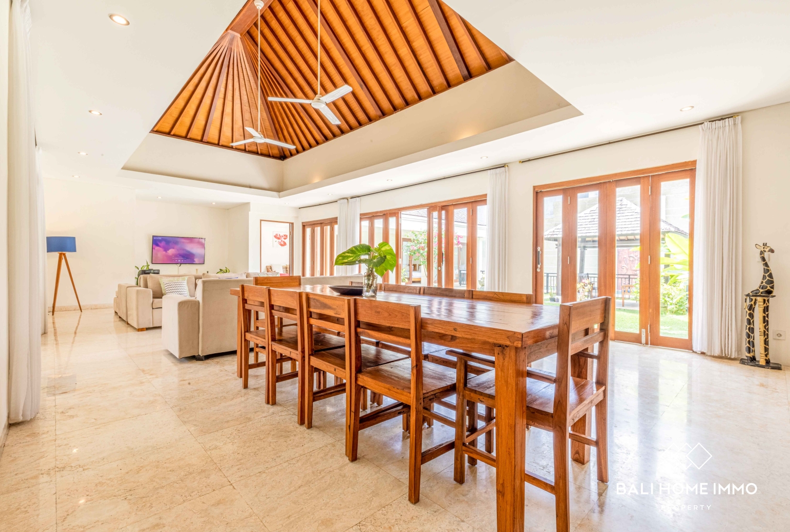 À l'extérieur, un vaste jardin et une piscine privée vous accueillent, offrant un espace généreux pour se détendre, organiser des réceptions ou simplement se prélasser sous le soleil balinais. L'espace extérieur renforce la sensation d'ouverture, conférant à la villa une véritable ambiance tropicale tout en préservant l'intimité.