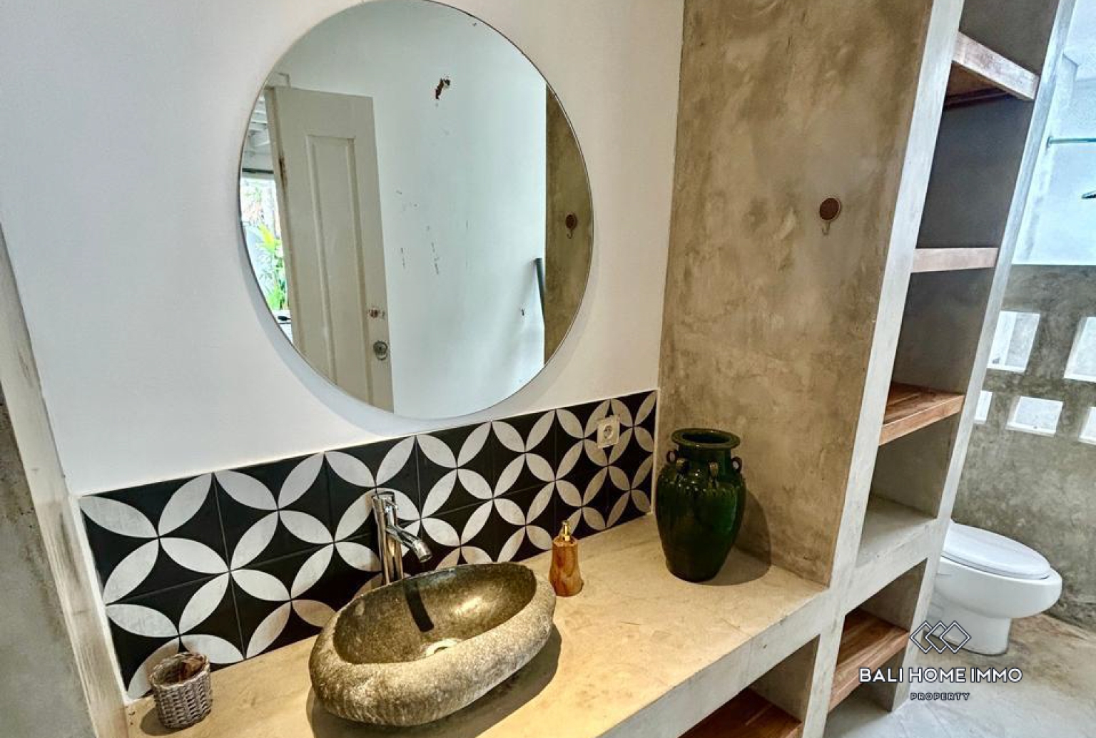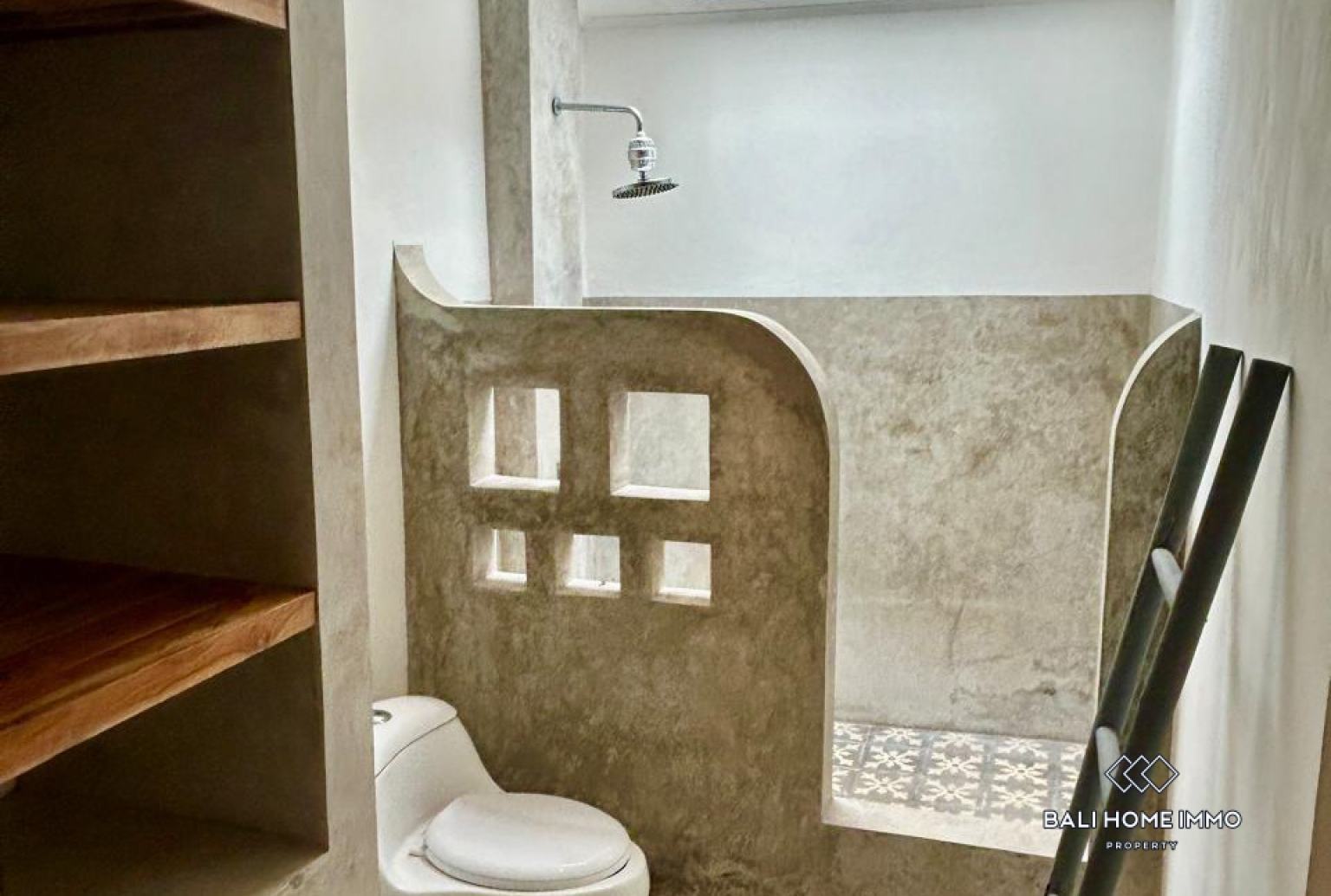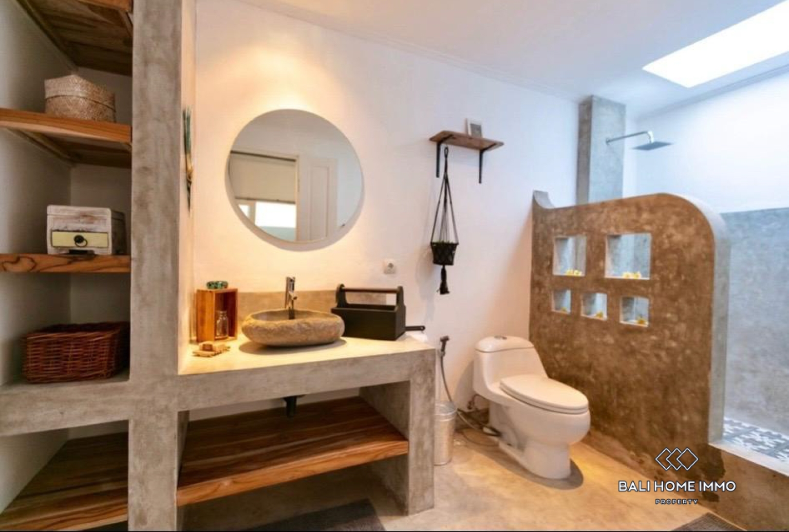La chambre principale dispose d'un lit en teck magnifiquement conçu et d'une mezzanine pouvant être aménagée en espace de couchage confortable pour les enfants ou en bureau fonctionnel. La deuxième chambre, tout aussi spacieuse et baignée de lumière naturelle, est idéale pour accueillir des invités ou une famille. La villa comprend une salle d'eau élégante aux finitions en béton poli, ainsi qu'un espace de rangement dédié pour ranger soigneusement effets personnels, planches de surf ou équipements de plein air. À l'avant de la propriété, un abri voiture ouvert permet de garer jusqu'à quatre scooters ou une petite voiture.