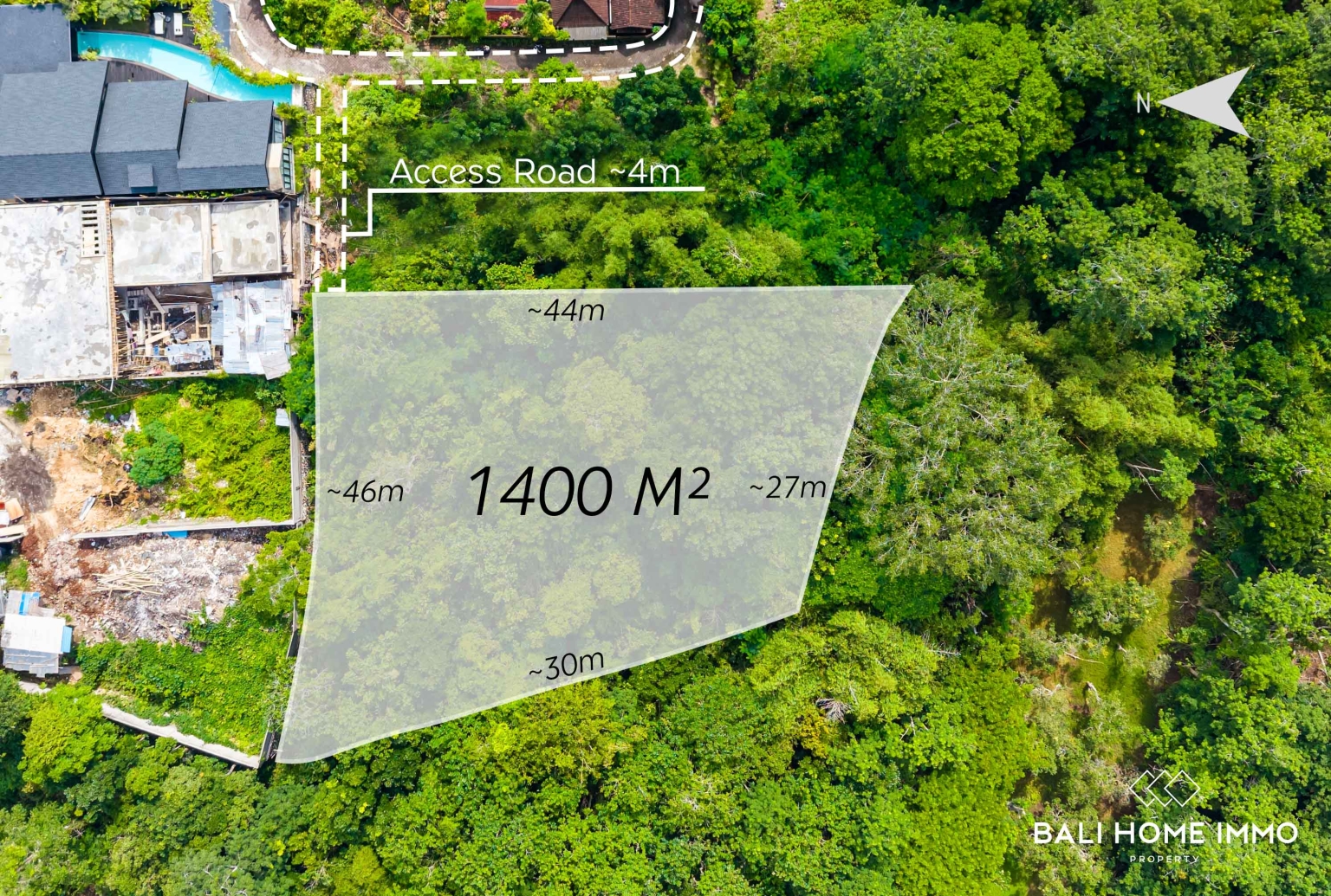 D'une superficie totale de 1 400 m², ce terrain se situe en zone résidentielle et se prête parfaitement à la construction de villas individuelles, d'un complexe de villas, voire d'un petit hôtel, sous réserve des réglementations locales. Son relief légèrement en pente permet des conceptions architecturales créatives et des constructions surélevées qui optimisent la vue magnifique sur la jungle. Le terrain est prêt à construire, ce qui représente un gain de temps et réduit les coûts de préparation pour tout projet futur.