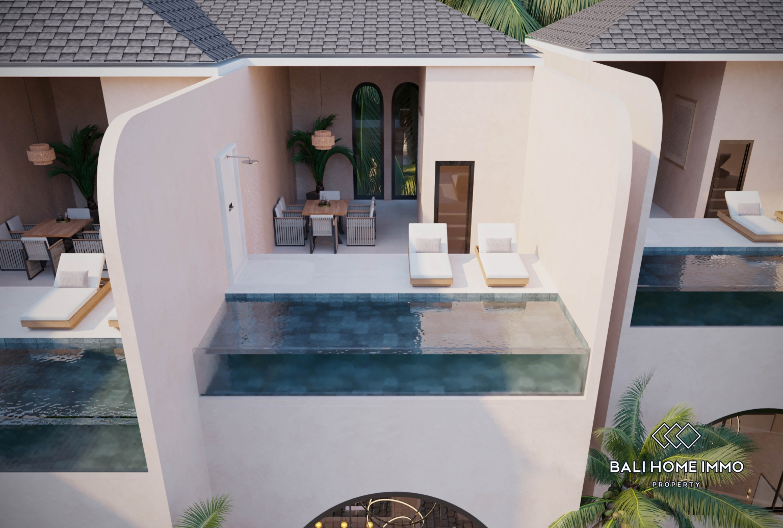 Le joyau du complexe est une superbe piscine à débordement et un espace lounge sur le toit, offrant une vue imprenable sur la jungle. Surplombant la végétation environnante, cet espace social partagé devient un véritable havre de paix, idéal pour une séance de yoga au lever du soleil, un moment de détente au coucher du soleil ou des soirées sous les étoiles. La vue offre un cadre naturel paisible, rare dans la zone de Pecatu, de plus en plus urbanisée, ce qui renforce l'attrait du projet et son potentiel locatif.