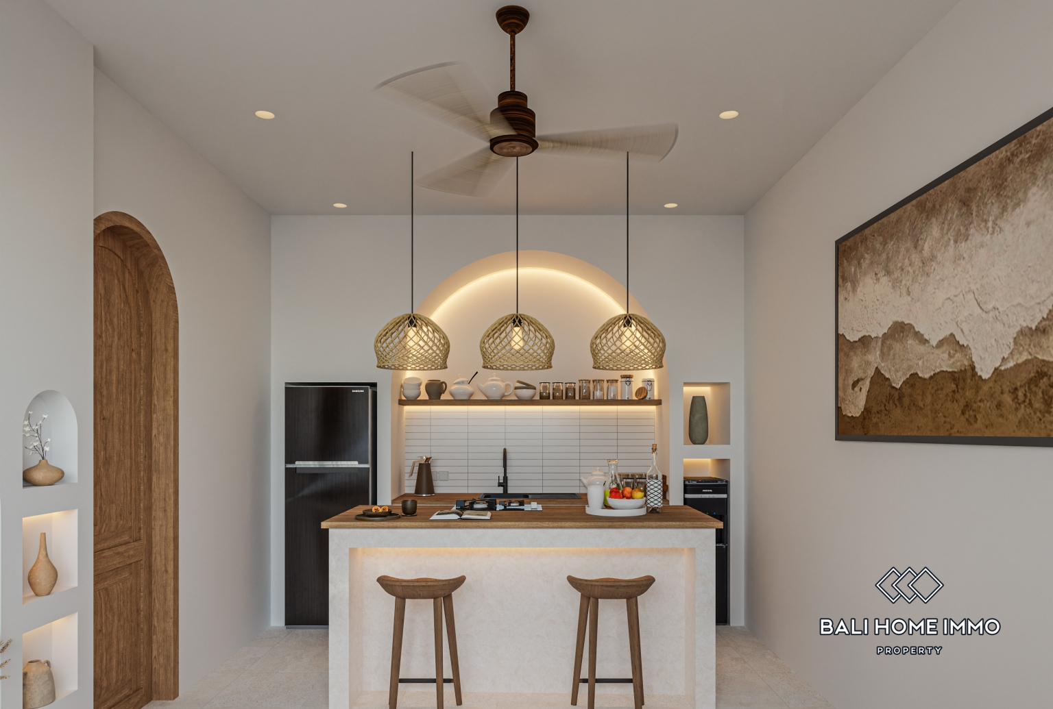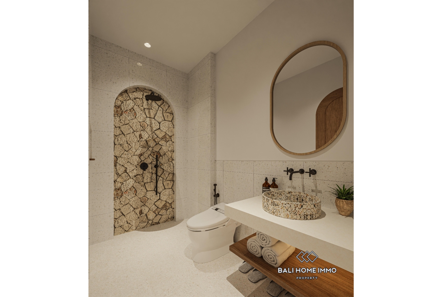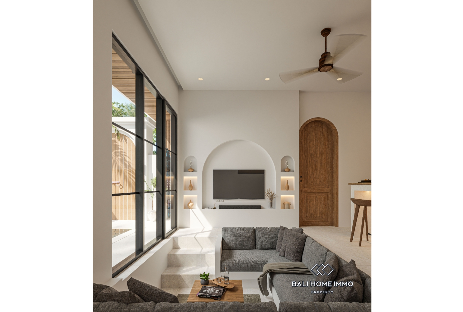 À l'intérieur, des arches douces et des formes intégrées créent un espace à la fois ancré et fluide. La lumière naturelle se diffuse à travers des textures feutrées et des surfaces chaleureuses, conférant à l'intérieur une impression d'espace et de fluidité. Chaque élément est pensé avec précision et sobriété, offrant un confort optimal grâce à une architecture réfléchie et harmonieuse. Il en résulte un espace de vie serein, équilibré et naturellement accueillant.