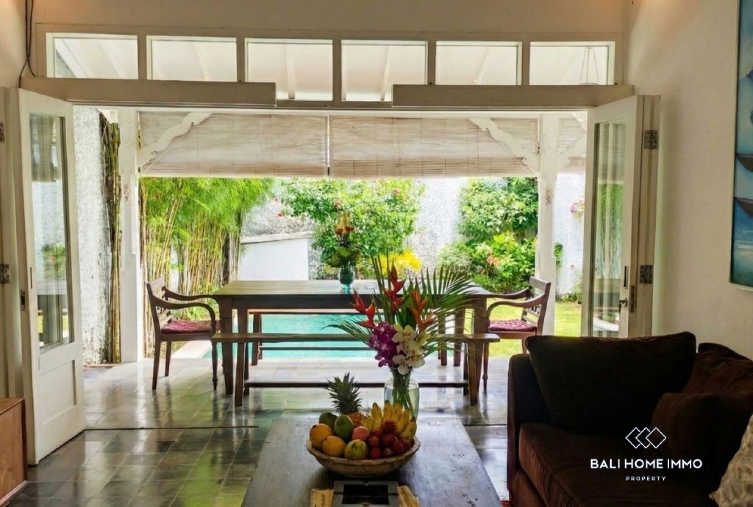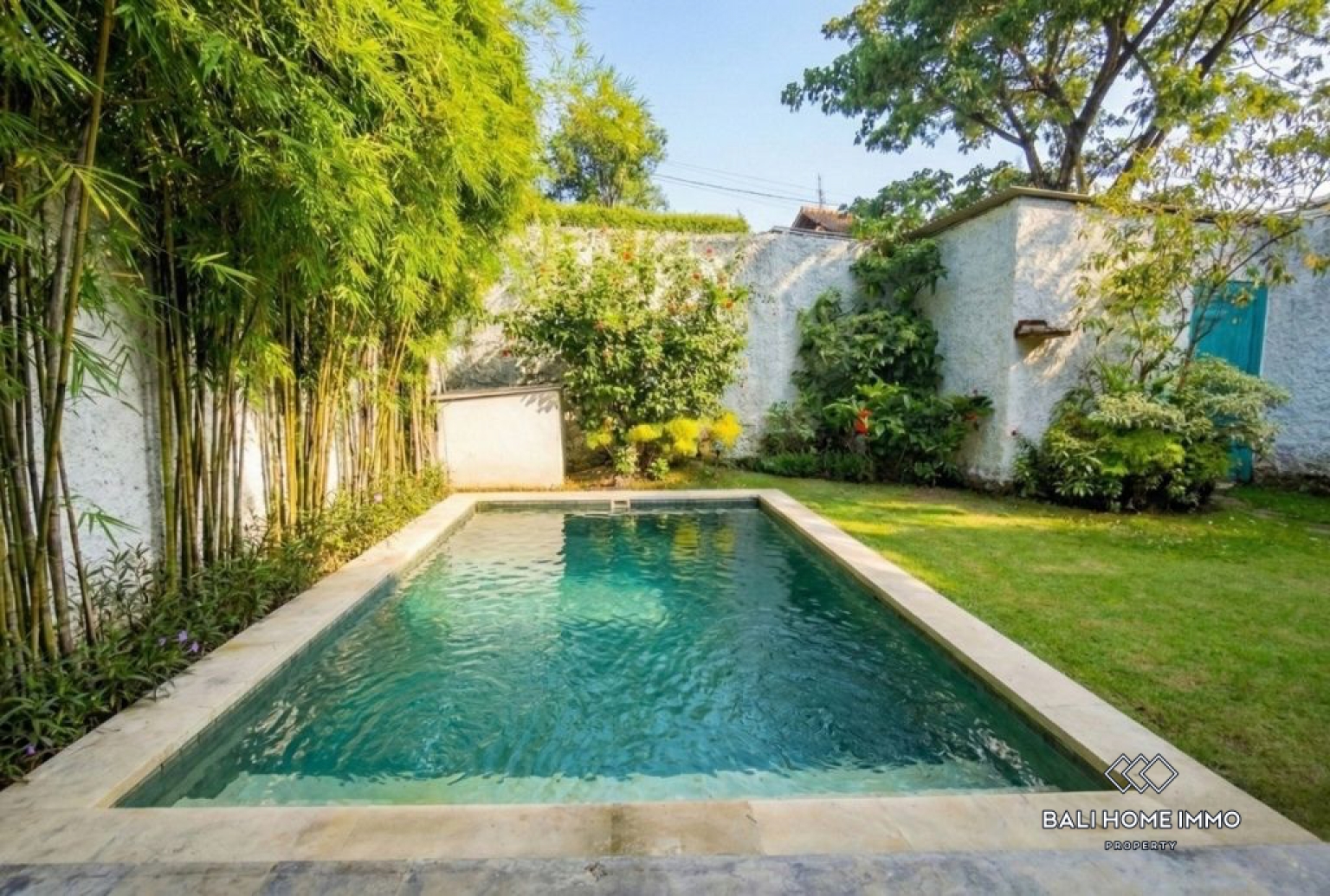 Menampilkan kolam renang berkilau di luar, memberikan latar belakang yang tenang untuk relaksasi dan kesenangan luar ruangan.