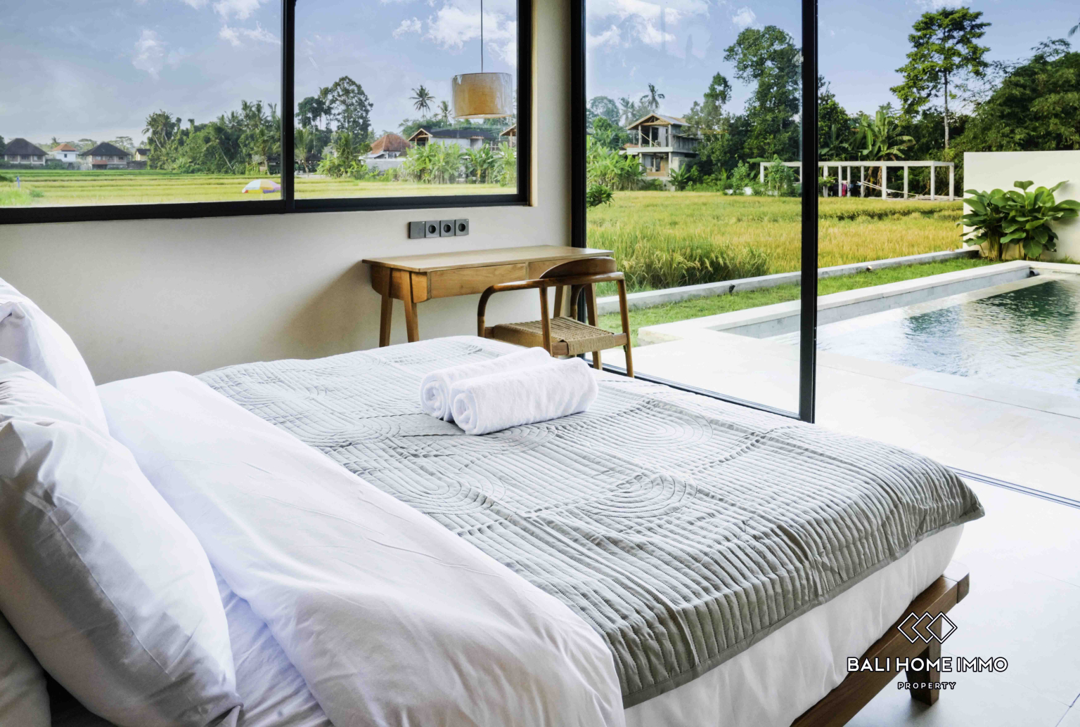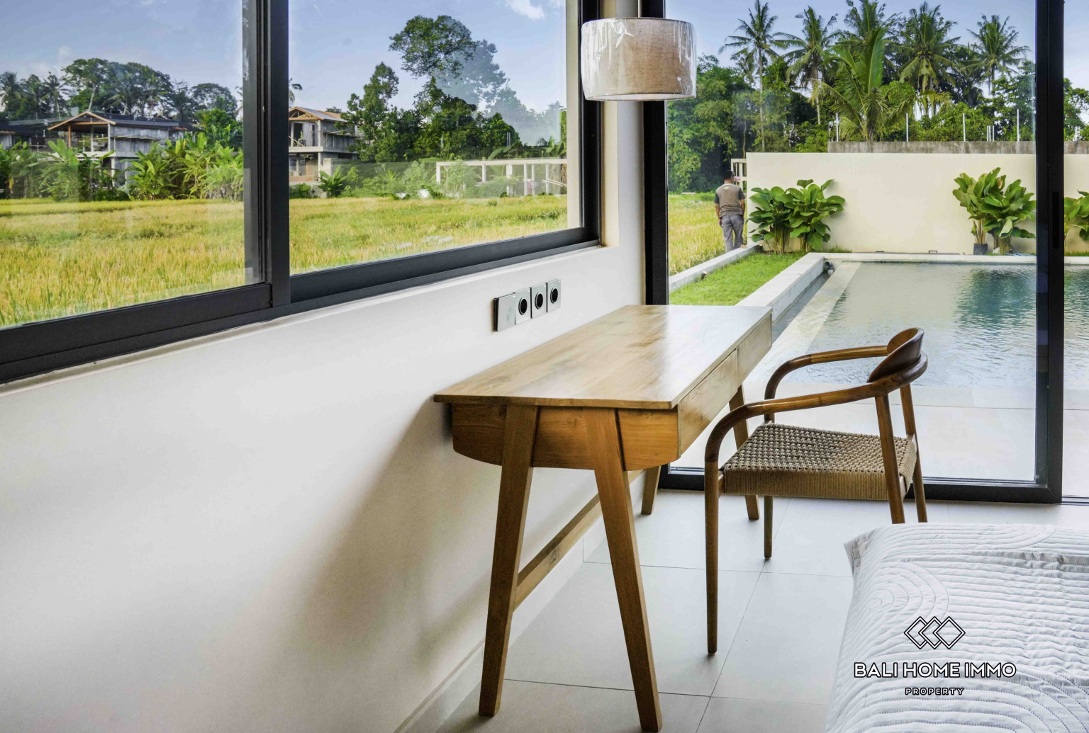 Di luar, kolam renang pribadi dan tanaman hijau tropis yang rimbun menciptakan oasis pribadi Andaโsempurna untuk berenang pagi, berjemur, atau malam yang tenang di bawah bintang-bintang. Pemandangan sawah yang tak terhalang menambah latar belakang yang menenangkan dan indah untuk rutinitas harian Anda.
