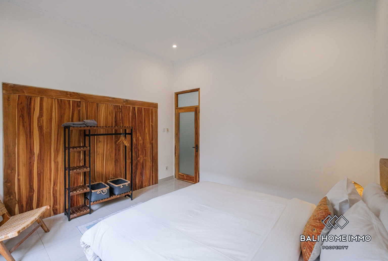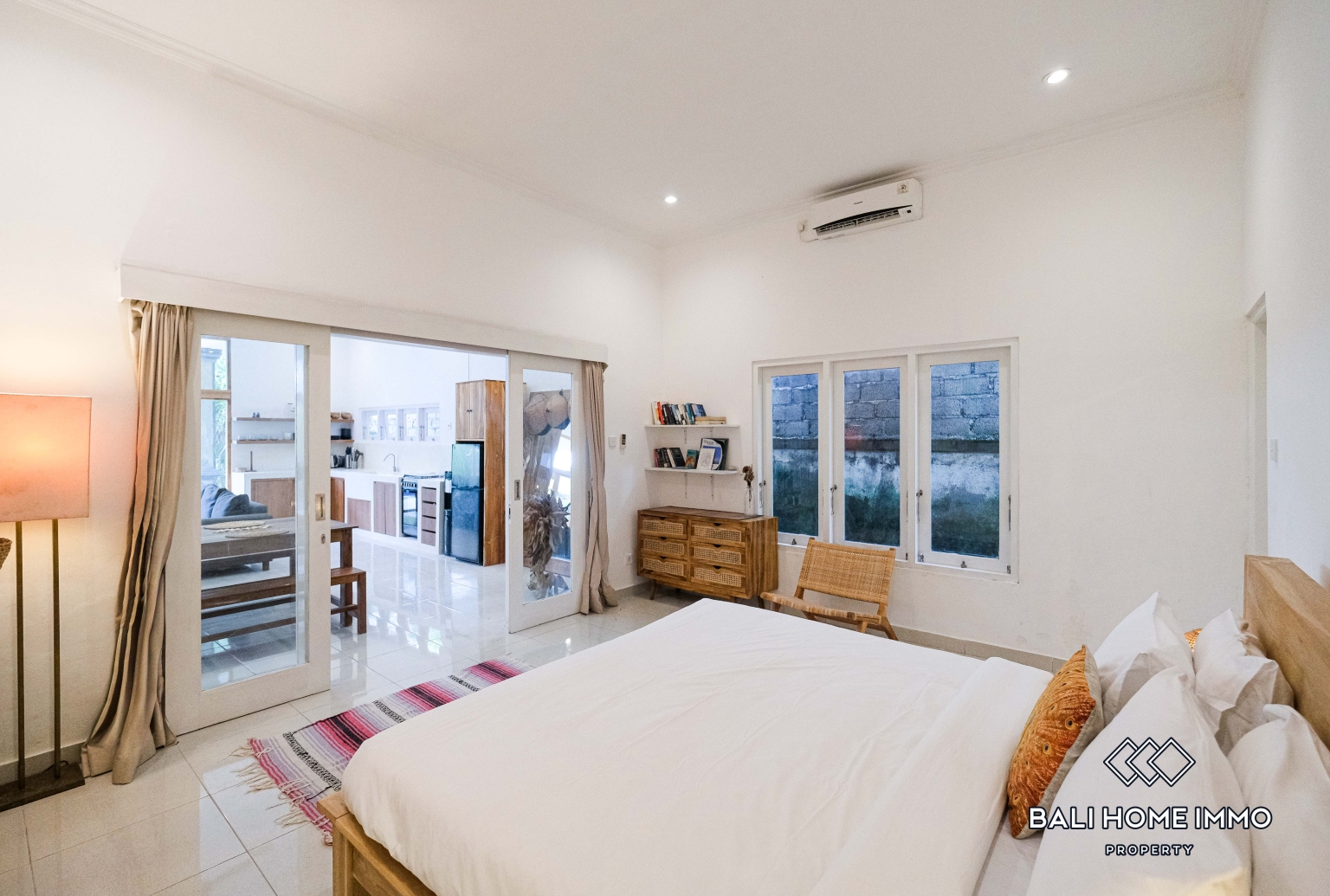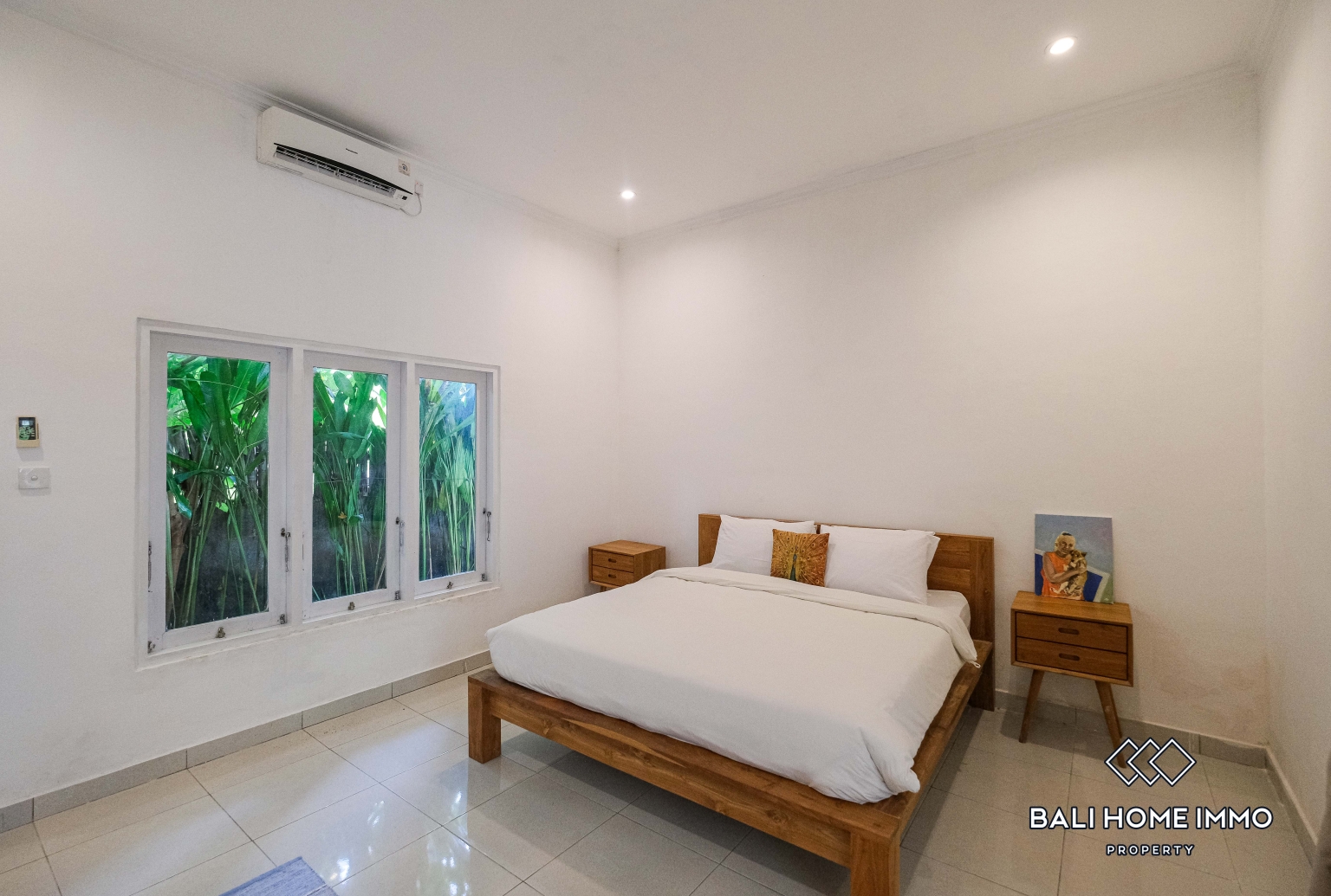 Di dalam, vila ini memiliki tiga kamar tidur berukuran baik, masing-masing dengan kamar mandi sendiri, menawarkan privasi dan kenyamanan bagi keluarga atau tamu. Ruang tamu tertutup ber-AC menyediakan ruang yang sejuk dan nyaman untuk bersantai, menjadikannya ideal untuk tinggal jangka panjang di iklim tropis Bali. Jendela-jendela besar mengundang banyak cahaya alami, memberikan suasana cerah dan menyegarkan di interior sepanjang hari.