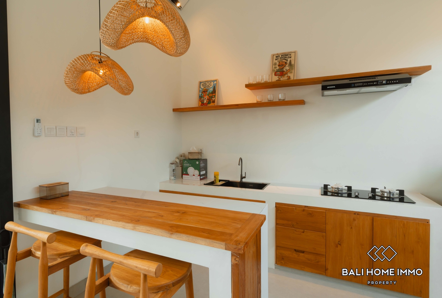 Ruang tamu tertutup mengalir tanpa batas ke dapur tertutup, membentuk ruang dalam ruangan yang praktis dan nyaman yang tetap sejuk sepanjang hari. Tata letaknya sempurna untuk rutinitas sehari-hari, menjamu tamu, atau bekerja dari rumah dalam lingkungan yang aman dan tenang.