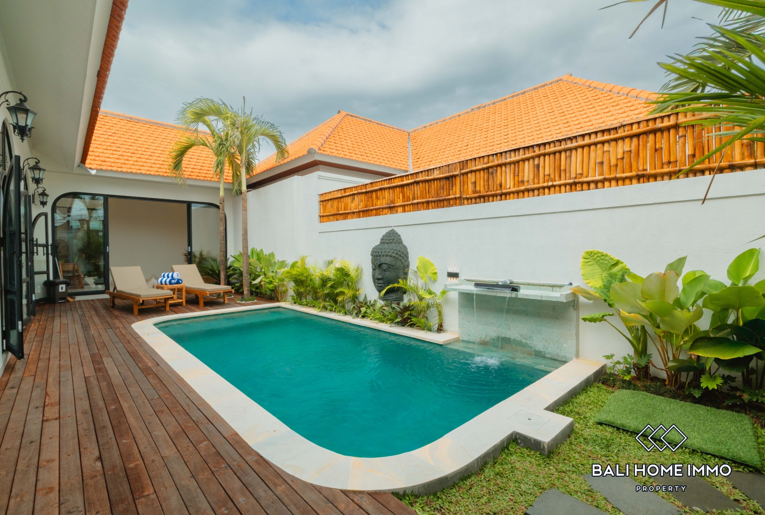 Di luar, kolam renang pribadi dilengkapi dengan dek kolam renang teras, menawarkan area luar ruangan yang nyaman untuk bersantai, menikmati matahari pagi, atau bersantai di malam hari. Ruang luar ruangan menambah keseimbangan yang menyegarkan pada desain interior modern vila.