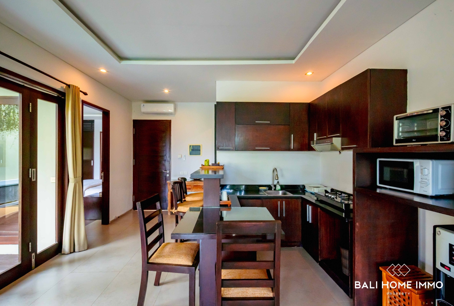 Vila ini memiliki ruang tamu tertutup, menciptakan ruang yang nyaman dan ber-AC untuk bersantai. Ruang tamu ini terhubung langsung dengan dapur dan ruang makan yang lengkap, sehingga praktis untuk kehidupan sehari-hari. Pintu kaca besar memungkinkan banyak cahaya alami masuk ke ruangan dan langsung terbuka ke kolam renang pribadi dan taman tropis kecil, meningkatkan suasana keseluruhan yang cerah dan menyegarkan.