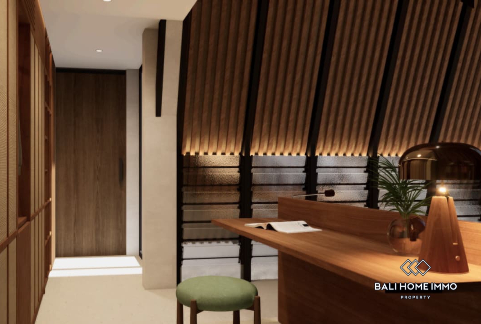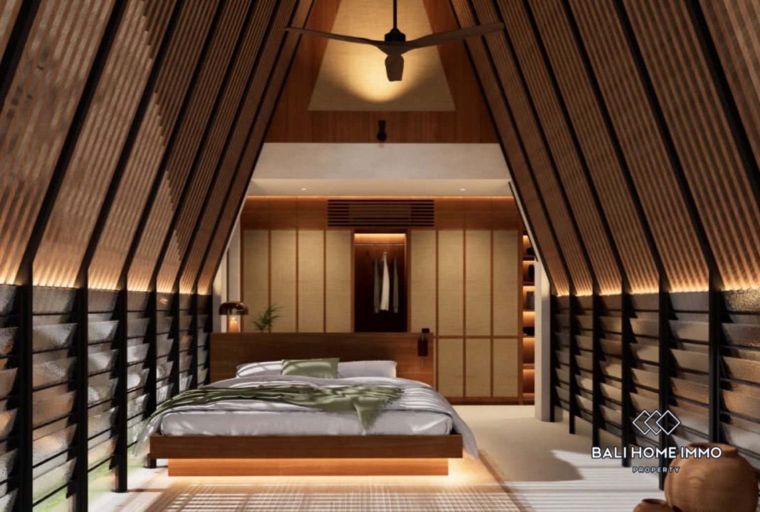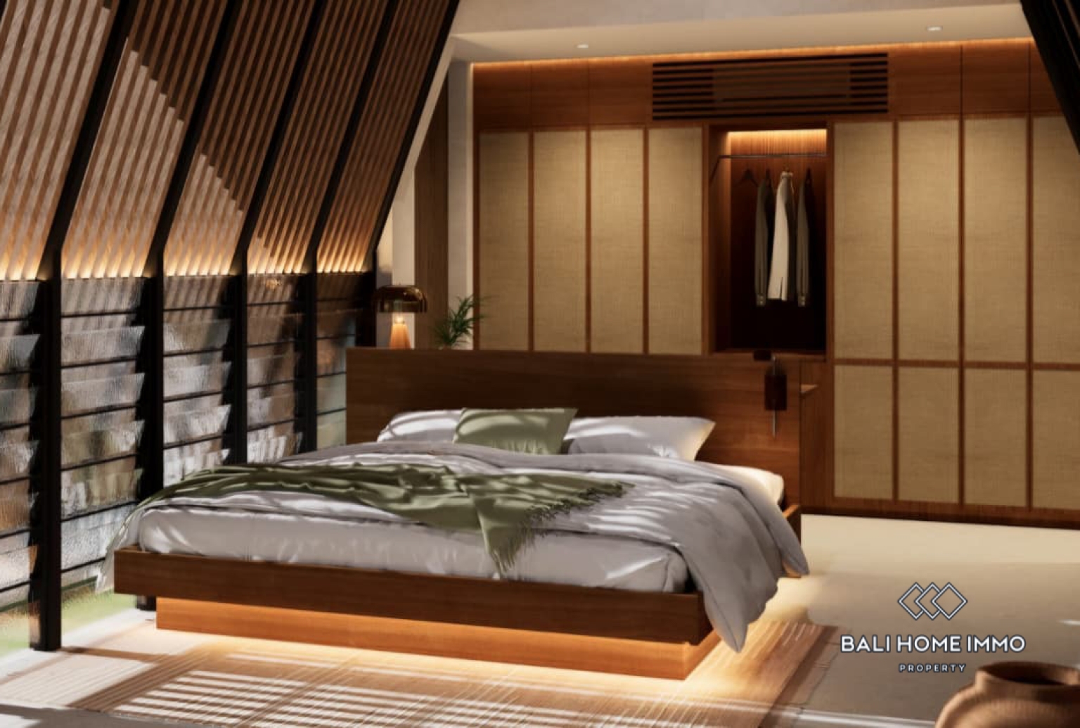 Vila ini memiliki kamar tidur yang nyaman, dilengkapi dengan ruang mezzanine serbaguna yang dapat berfungsi sebagai kamar tidur kedua, ruang kerja di rumah, atau area lounge kreatif. Interiornya mengusung suasana tropis yang hangat, memadukan tekstur alami dan warna-warna lembut untuk menciptakan suasana santai namun elegan. Bukaan besar mengundang cahaya alami dan aliran udara ke seluruh area ruang tamu, sementara tata letak terbuka terhubung dengan mulus ke bagian luar.
