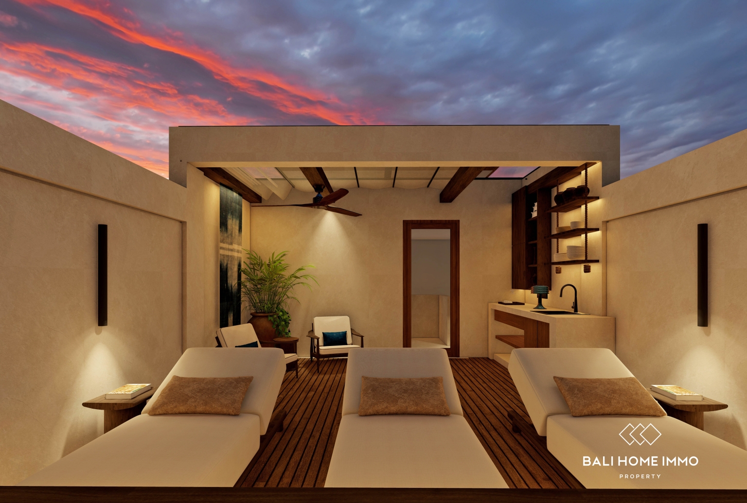 Salah satu fitur unggulan properti ini adalah teras atap pribadi, menawarkan ruang yang sempurna untuk bersantai, menjamu tamu, atau menikmati matahari terbenam Bali yang indah. Area atap dapat digunakan sebagai ruang santai, ruang makan luar ruangan, atau bahkan area kesehatan.