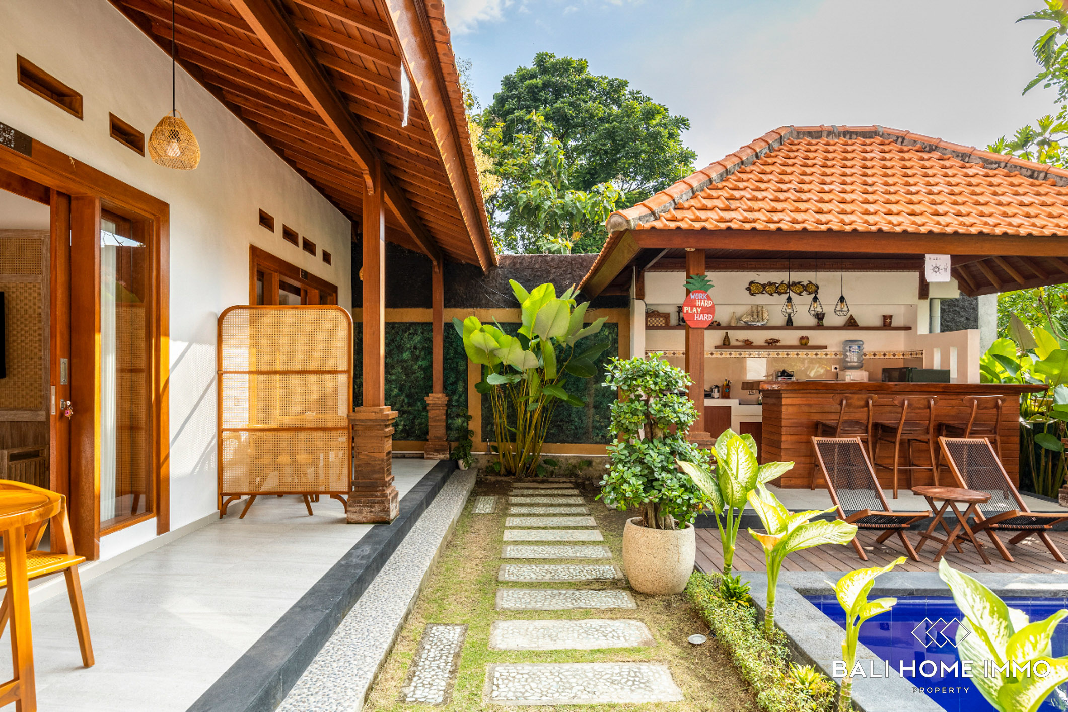The guesthouse features a private terrace that overlooks a lush garden and a swimming pool. The surrounding greenery and natural stone accents enhance the tropical charm, making it a perfect retreat in a residential area.