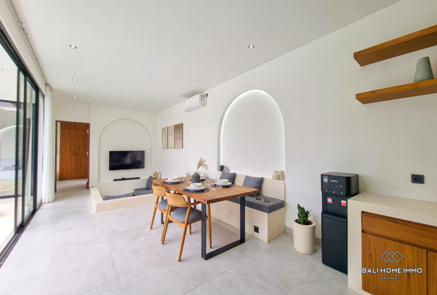 This brand-new two-bedroom villa blends modern tropical design with complete comfort and privacy. Each bedroom features its own beautifully appointed ensuite bathroom, creating a luxurious personal retreat for guests. The interiors are fully furnished with tasteful, contemporary pieces, while the enclosed living area offers a cozy space to relax, complete with a TV and seamless access to the kitchen. Large windows and clean architectural lines enhance the bright, airy ambiance of the home.