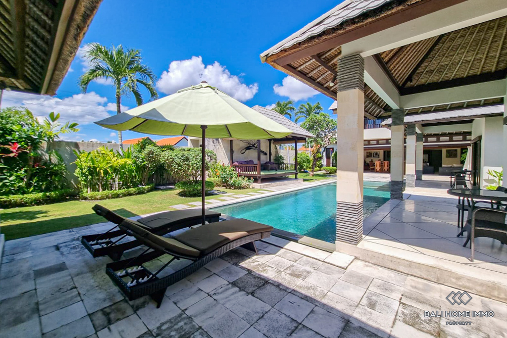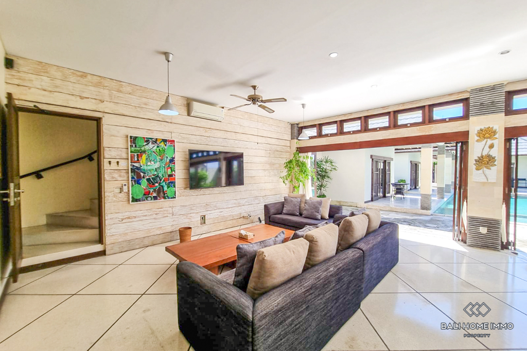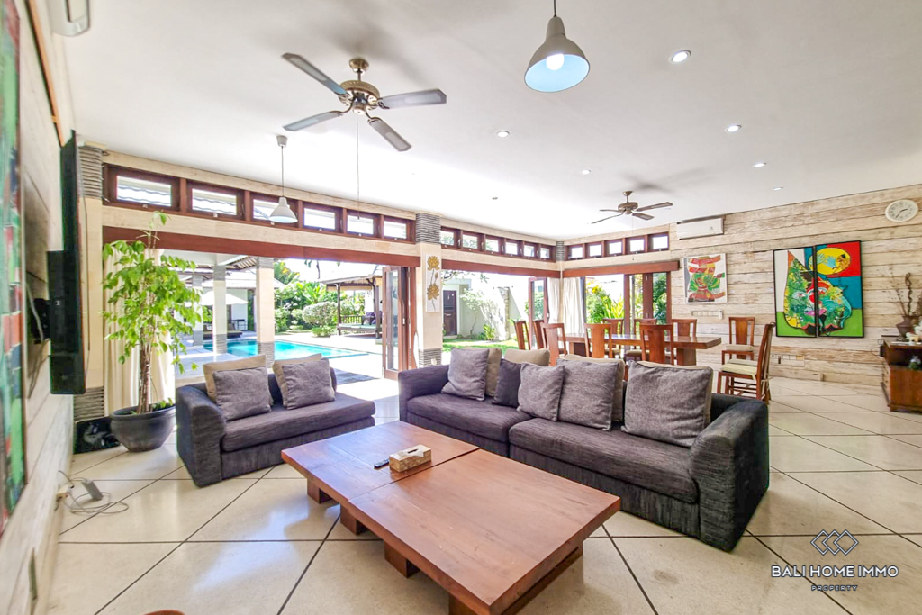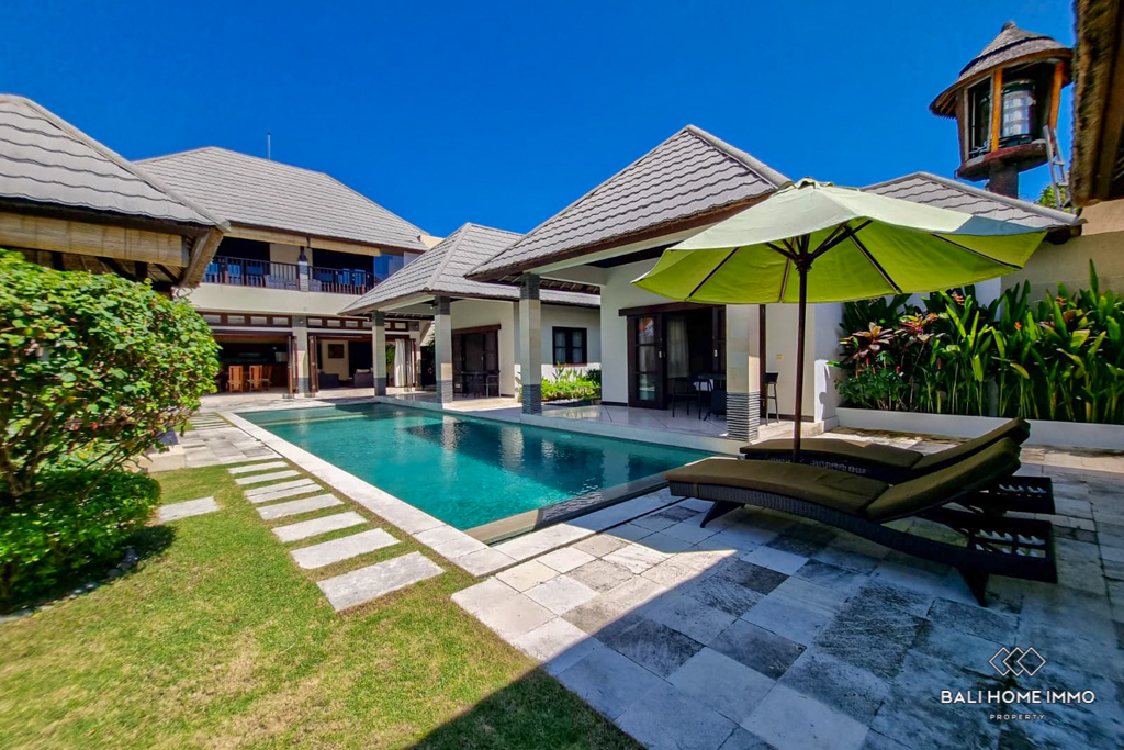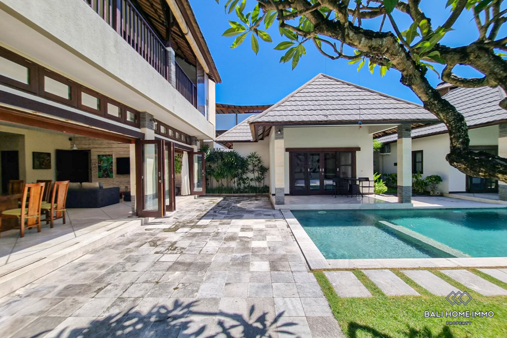 This charming five-bedroom villa in the sought-after Berawa area sits on a generous 700 sqm land with a spacious 508 sqm two-level building. Designed with a blend of traditional and tropical architecture, the villa exudes warmth and character. Three of the bedrooms are in separate buildings, each with its own ensuite bathroom, offering privacy and tranquility, while the other two bedrooms are on the second floor, sharing a well-appointed bathroom. Fully furnished with tasteful decor, the villa features an enclosed living area that provides comfort and seclusion while still maintaining a connection to the lush garden and large swimming pool, perfect for relaxing or entertaining. ย