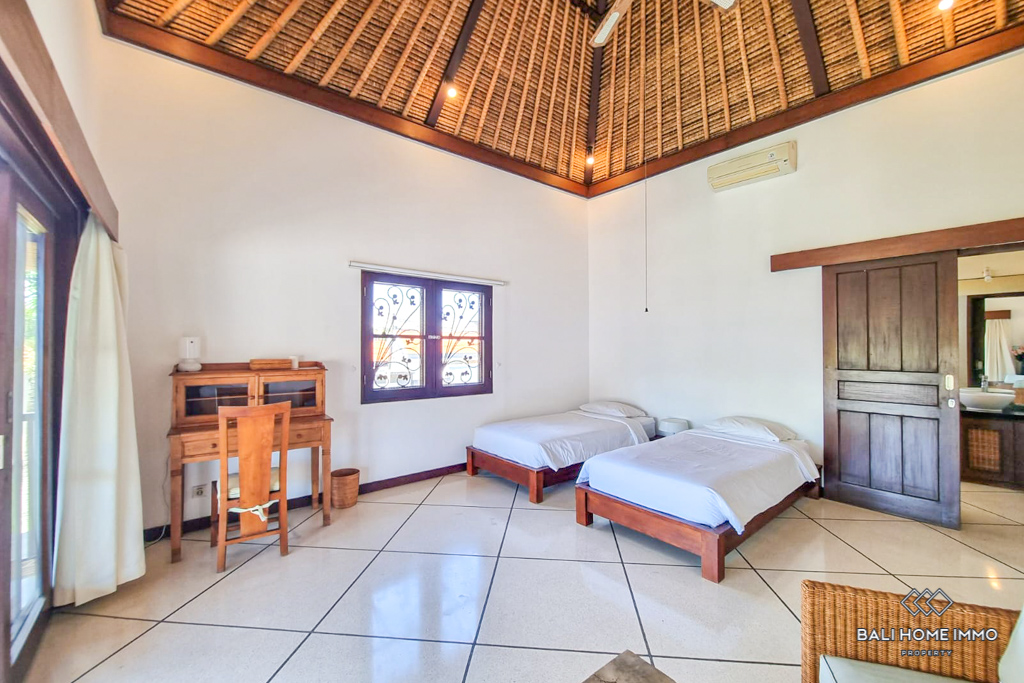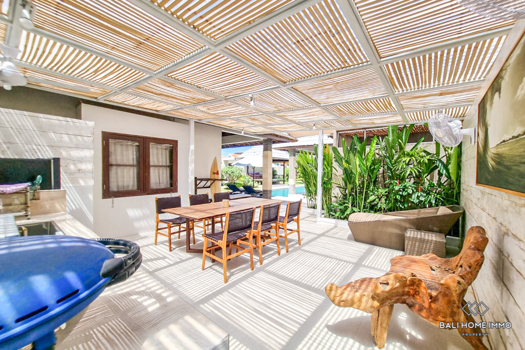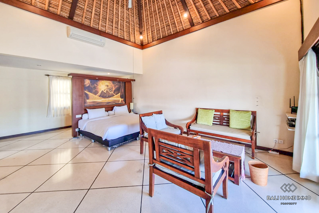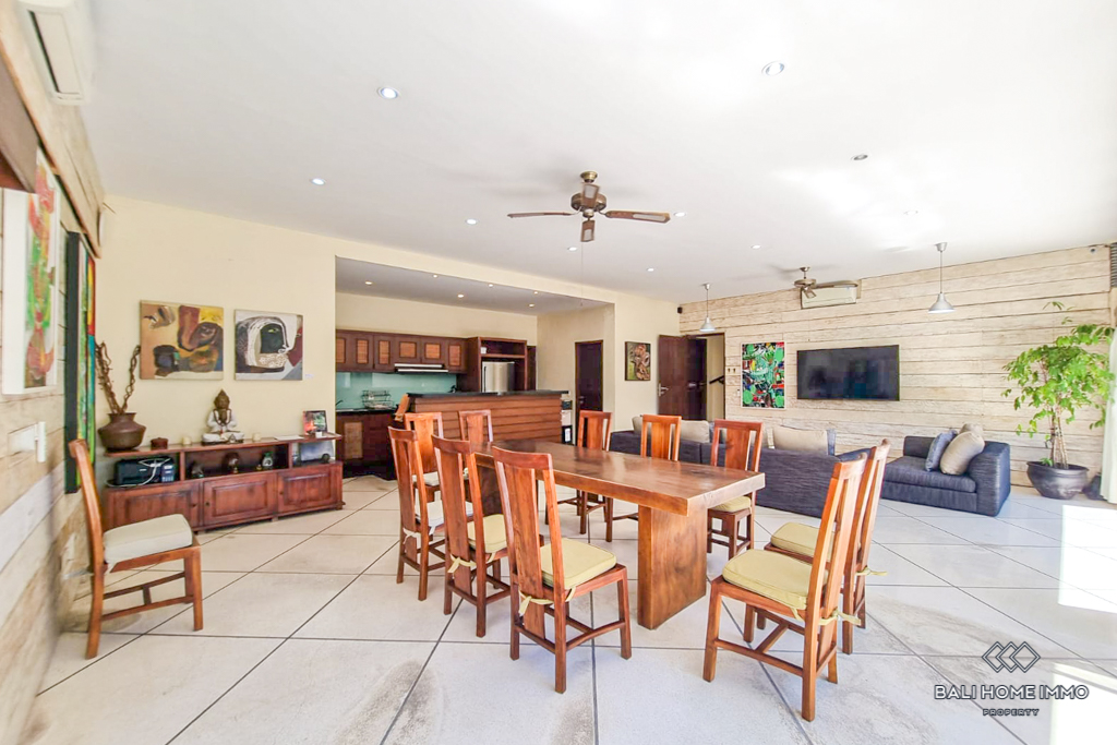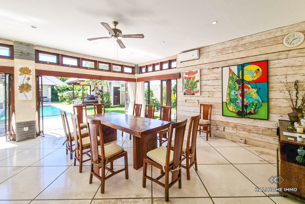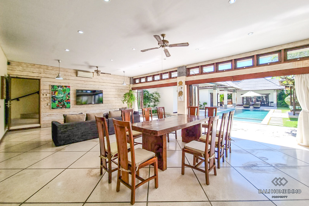 This charming five-bedroom villa in the sought-after Berawa area sits on a generous 700 sqm land with a spacious 508 sqm two-level building. Designed with a blend of traditional and tropical architecture, the villa exudes warmth and character. Three of the bedrooms are in separate buildings, each with its own ensuite bathroom, offering privacy and tranquility, while the other two bedrooms are on the second floor, sharing a well-appointed bathroom. Fully furnished with tasteful decor, the villa features an enclosed living area that provides comfort and seclusion while still maintaining a connection to the lush garden and large swimming pool, perfect for relaxing or entertaining. ย