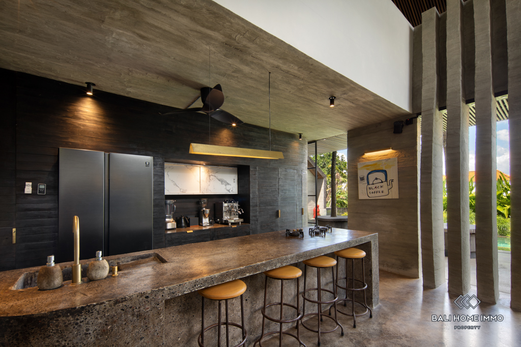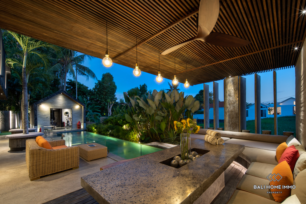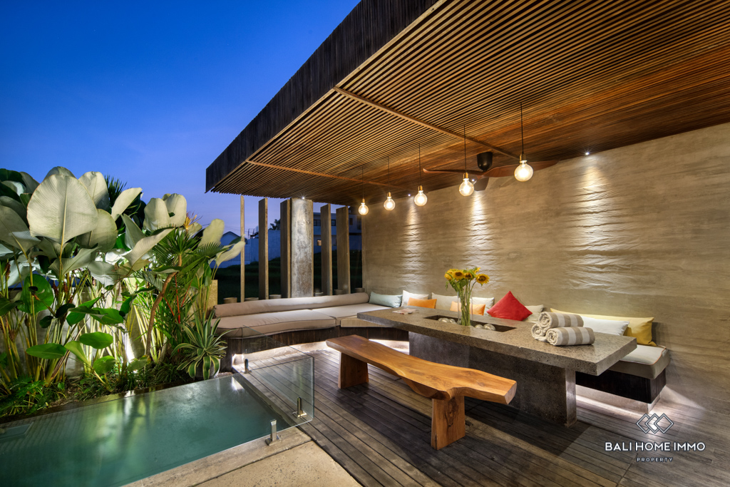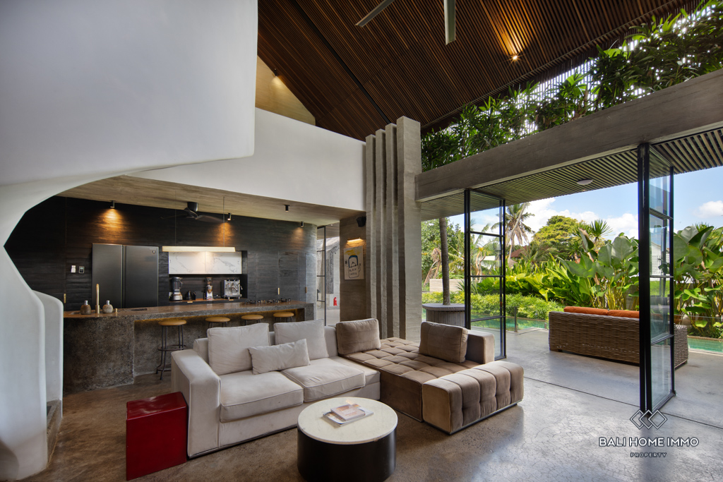 A stunning 3-bedroom villa designed with a sleek, modern style in the heart of Pererenan. The open yet flexible living spaces seamlessly blend indoors and outdoors, with a spacious lounge area, a fully equipped kitchen, and natural elements of wood and stone creating a luxurious atmosphere.