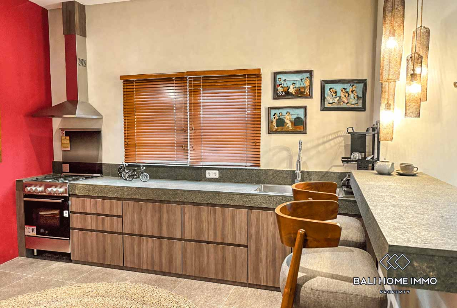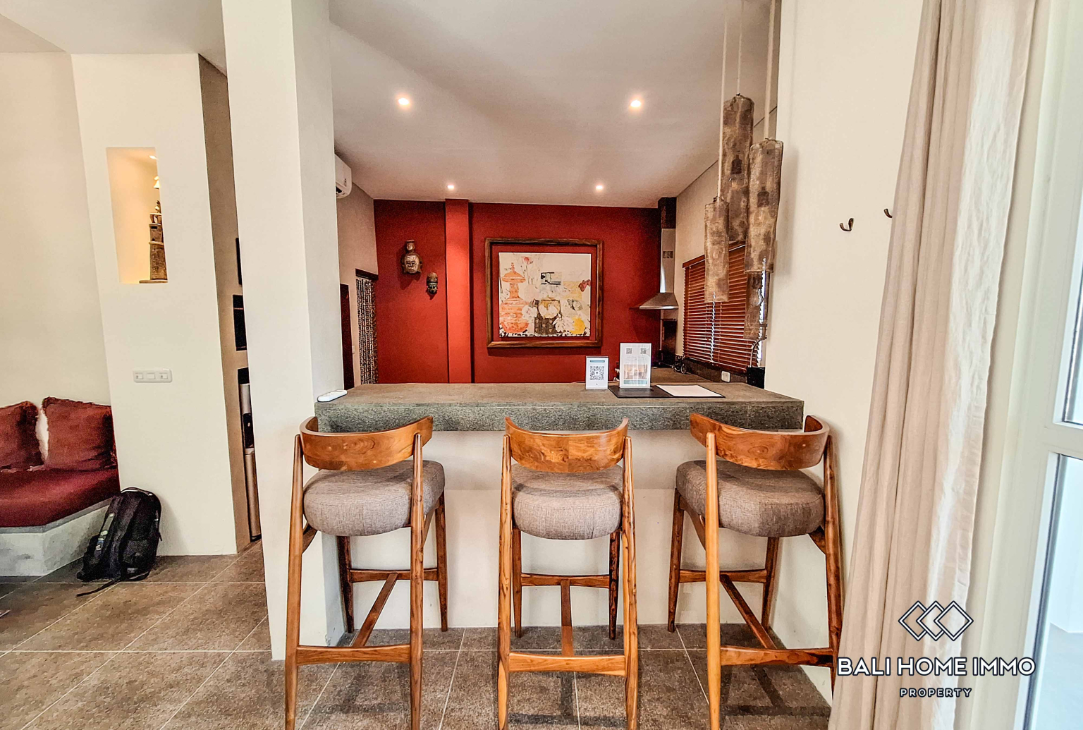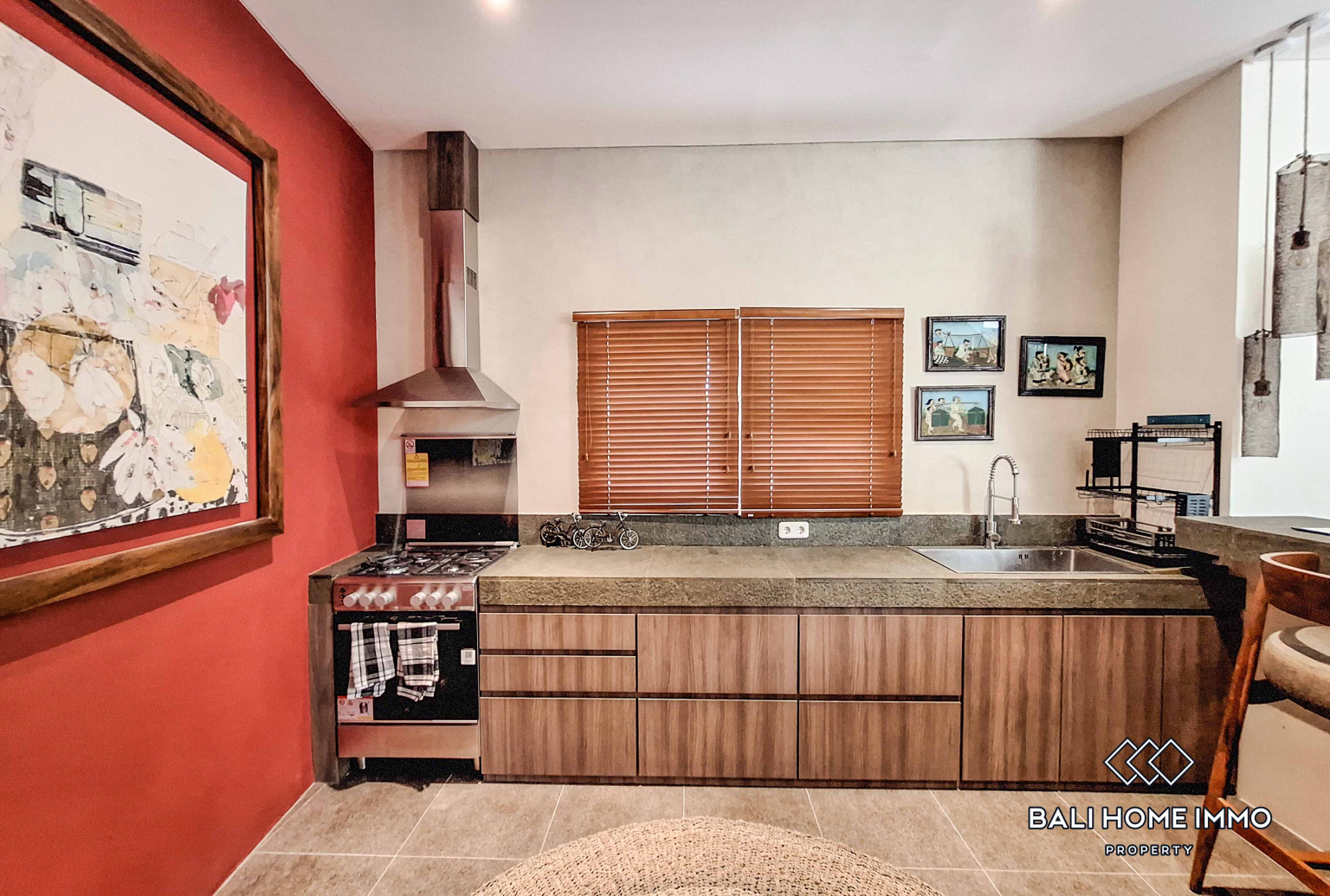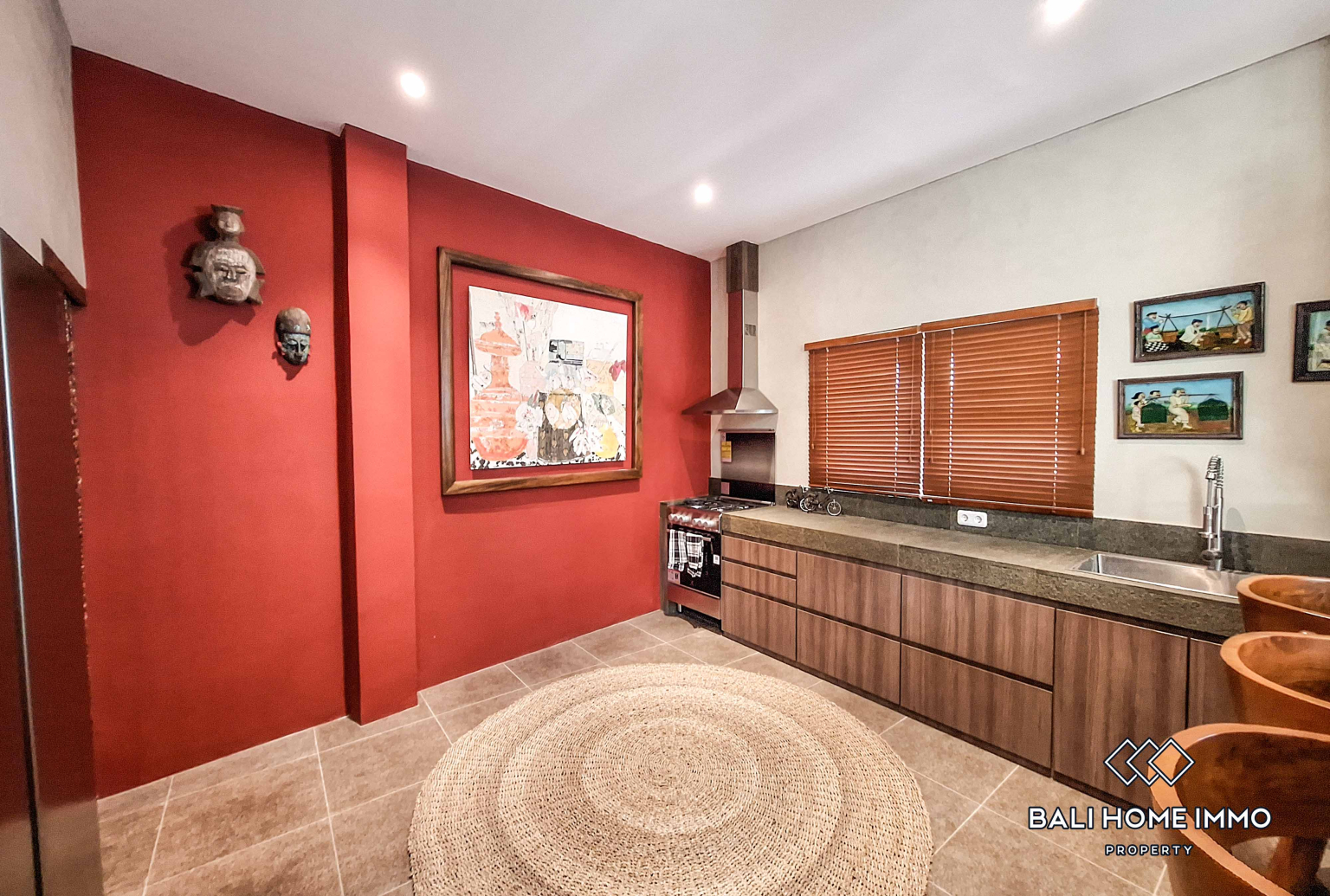 A bold burgundy kitchen serves as the heart of the homeโfully equipped and designed for both aesthetics and functionality. Whether preparing daily meals or hosting dinner parties, this vibrant space adds a touch of creativity and charm to the villaโs modern design.
