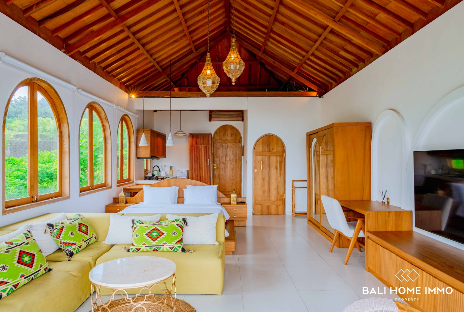 A beautifully styled 1-bedroom studio, complete with its own kitchen, cozy living area, and a private balcony overlooking the lush hillside of Bingin. The studioโs elegant bathroom features a stunning bath set beneath natural light, perfect for unwinding while taking in the serene surroundings, offers excellent flexibility ideal for hosting guests, generating rental income, or enjoying as a quiet personal retreat.