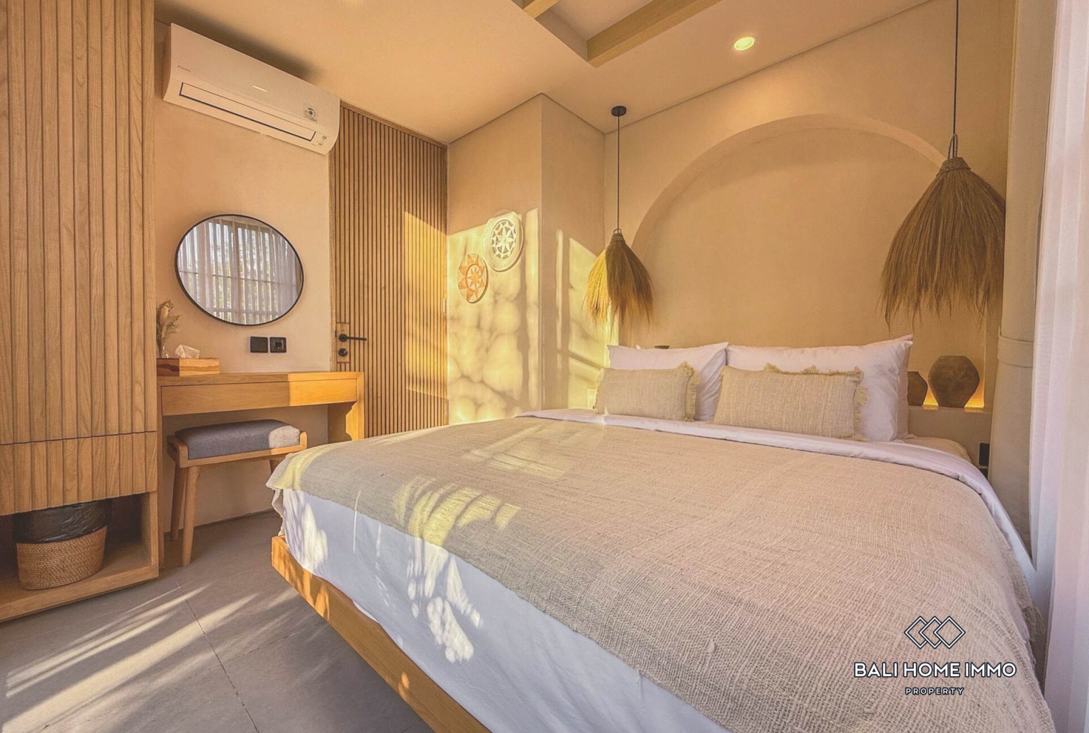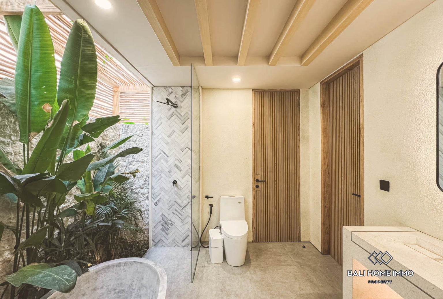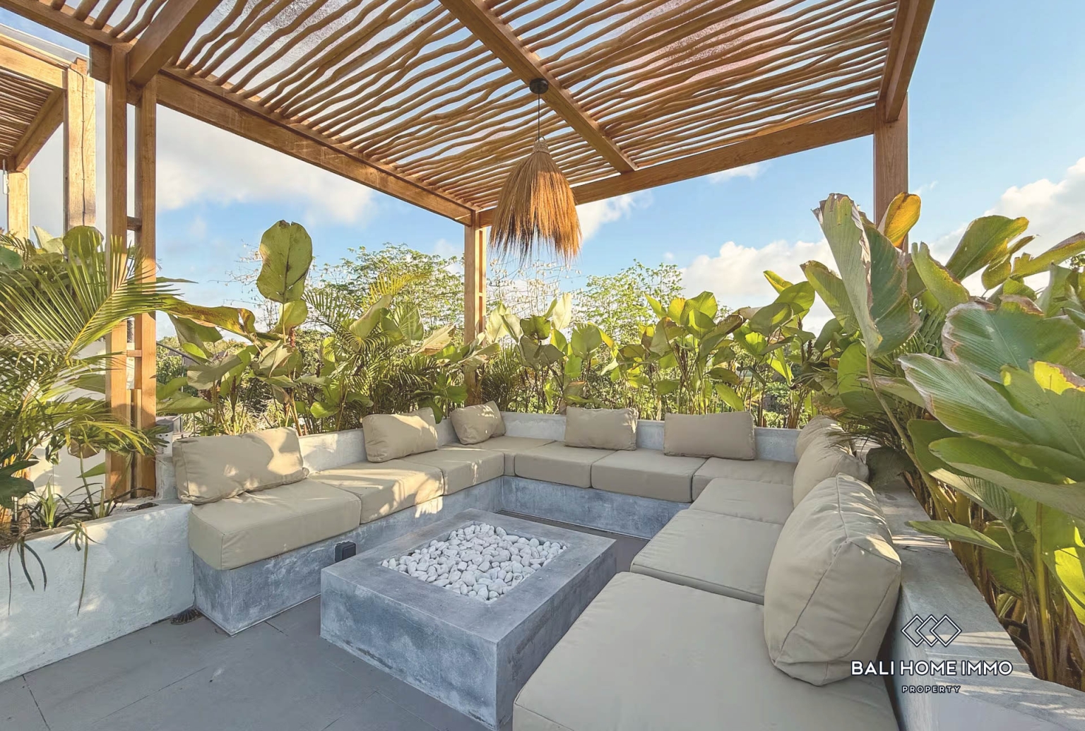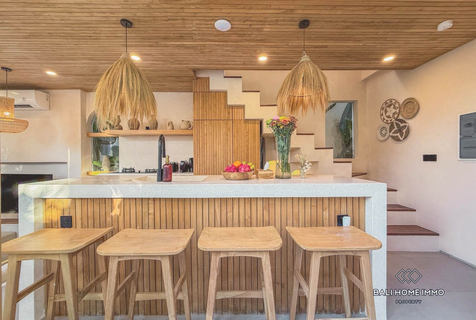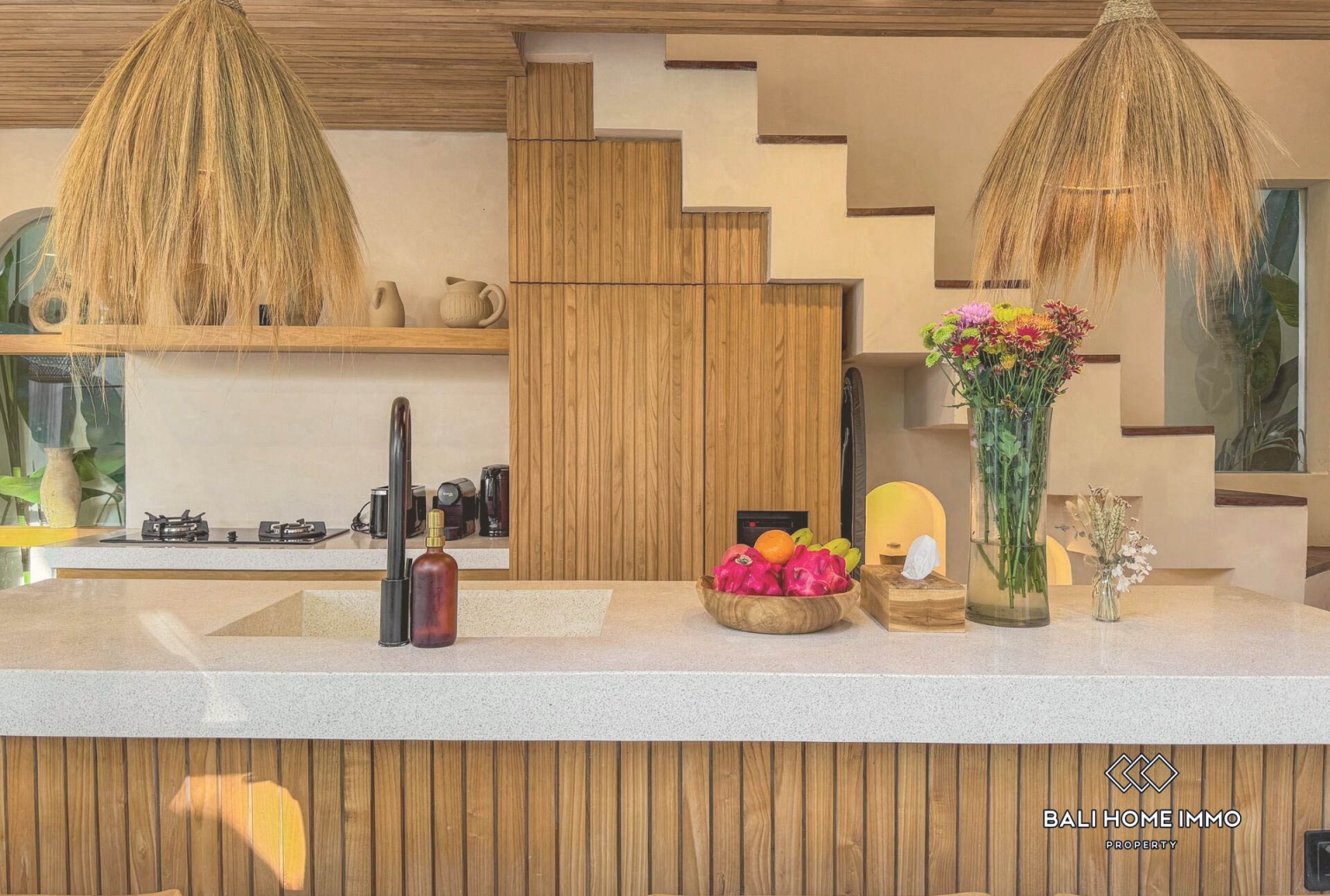 Experience elevated tropical living in this beautifully designed 3 bedrooms villa available for monthly rental in Uluwatu, Bali. Showcasing a modern tropical concept with warm natural finishes, the property features a private swimming pool framed by lush greenery, creating a peaceful and intimate retreat. The enclosed living area offers year round comfort and connects seamlessly to a fully equipped kitchen with elegant wooden details and a spacious island bar, perfect for entertaining guests or enjoying relaxed meals at home.