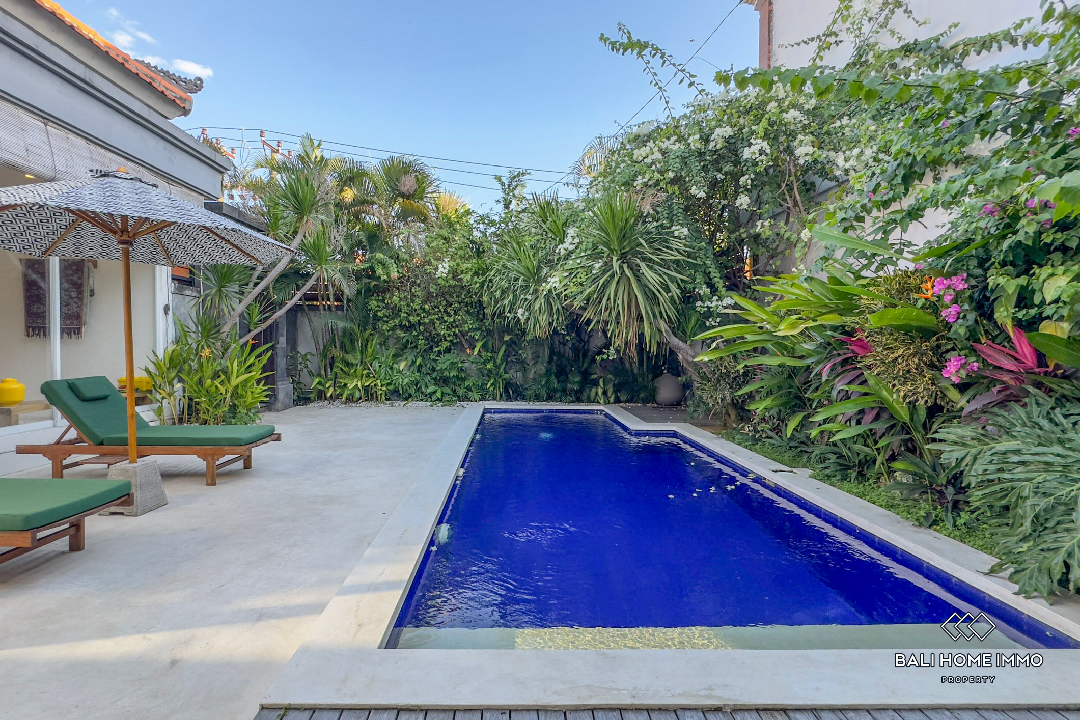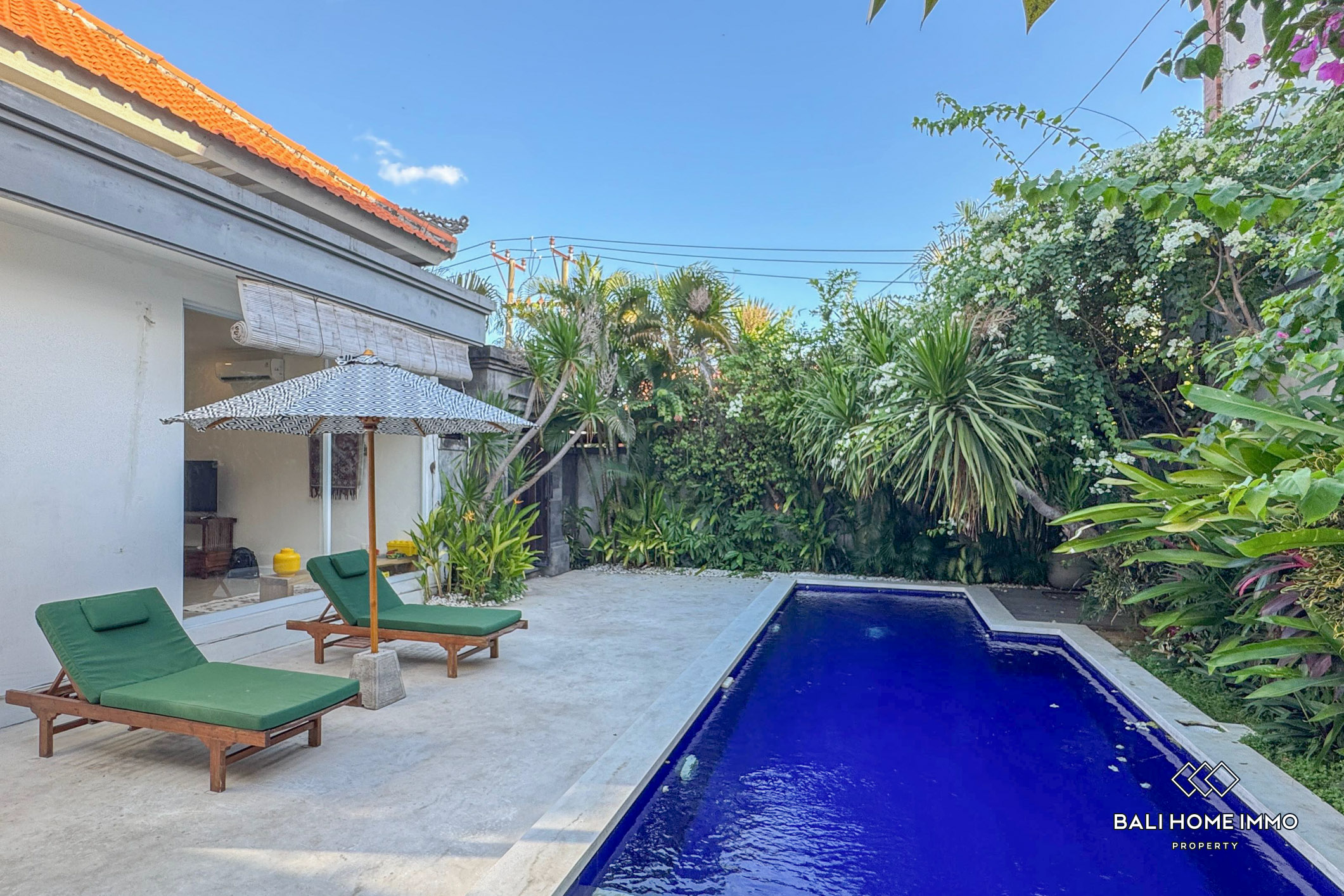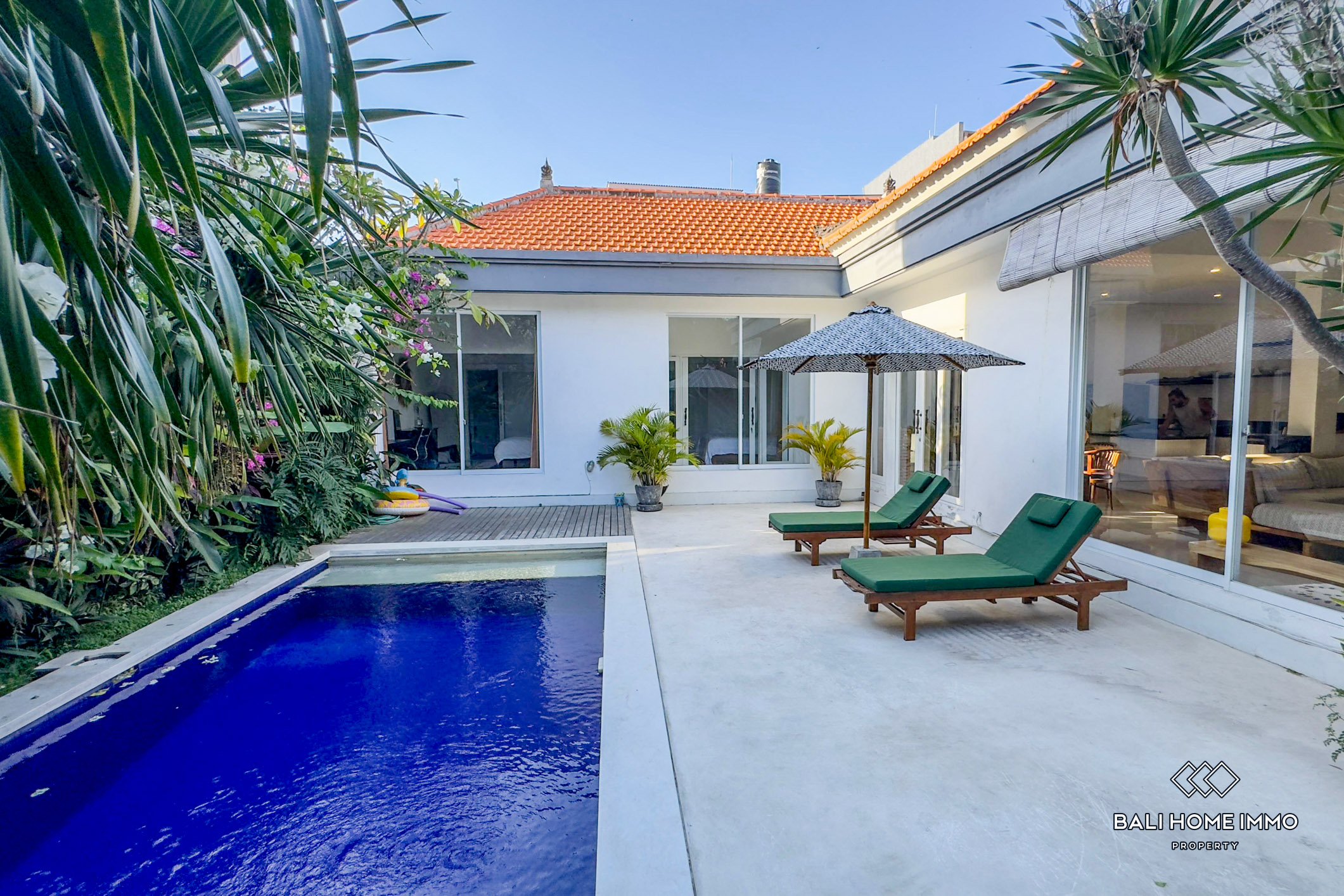 This stand-alone villa features three spacious bedrooms, each with its own ensuite bathroom and walk-in wardrobe, designed for comfort and privacy. The large private swimming pool is bordered by blooming bougainvillea, creating a beautiful and relaxing tropical backdrop. A cozy poolside terrace with sun umbrellas adds to the holiday vibe, making it perfect for lounging or entertaining. Inside, the villa boasts a modern design with freshly updated furniture in the living area, a clean and spacious fully equipped kitchen, and secure parking behind enclosed gates. Entry to the main villa is also fully enclosed, ensuring safety and peace of mind. Every detail of this property has been thoughtfully designed to cater to modern living while embracing Bali’s indoor–outdoor lifestyle.