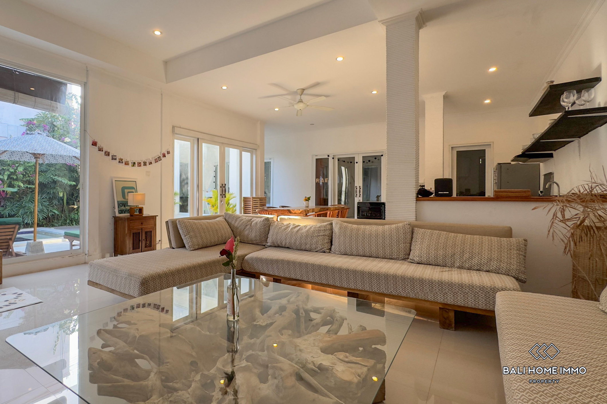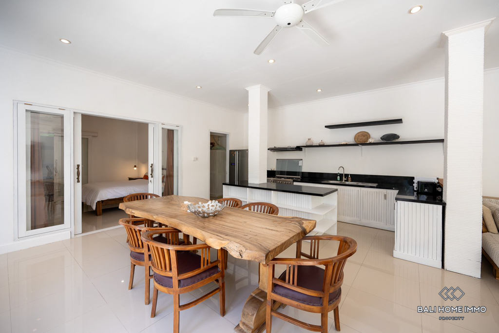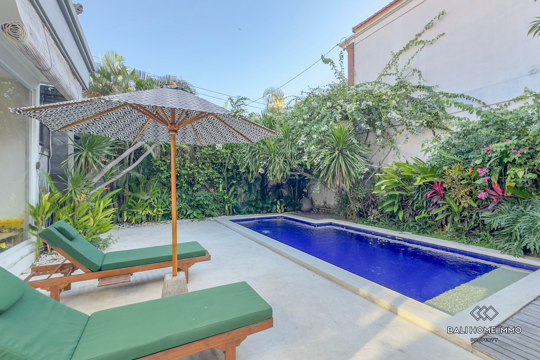 This stand-alone villa features three spacious bedrooms, each with its own ensuite bathroom and walk-in wardrobe, designed for comfort and privacy. The large private swimming pool is bordered by blooming bougainvillea, creating a beautiful and relaxing tropical backdrop. A cozy poolside terrace with sun umbrellas adds to the holiday vibe, making it perfect for lounging or entertaining. Inside, the villa boasts a modern design with freshly updated furniture in the living area, a clean and spacious fully equipped kitchen, and secure parking behind enclosed gates. Entry to the main villa is also fully enclosed, ensuring safety and peace of mind. Every detail of this property has been thoughtfully designed to cater to modern living while embracing Bali’s indoor–outdoor lifestyle.