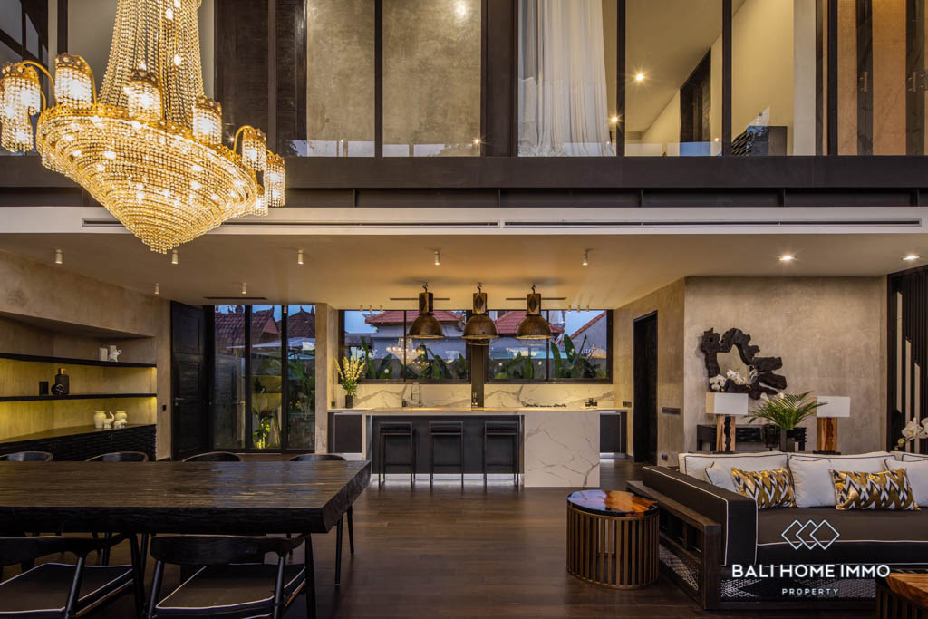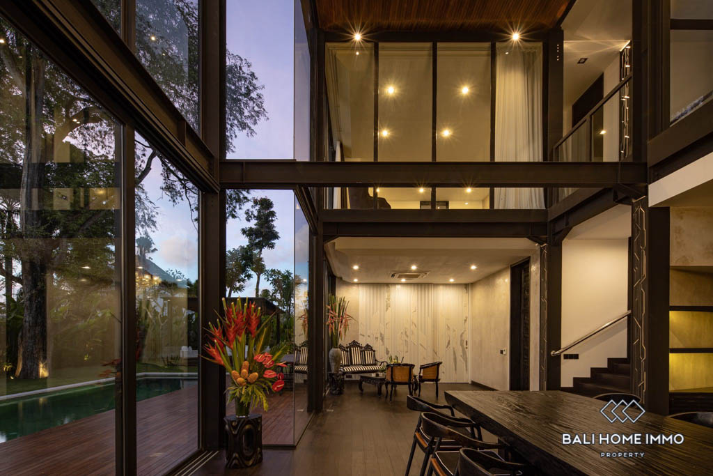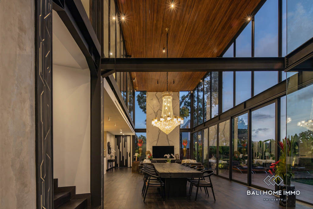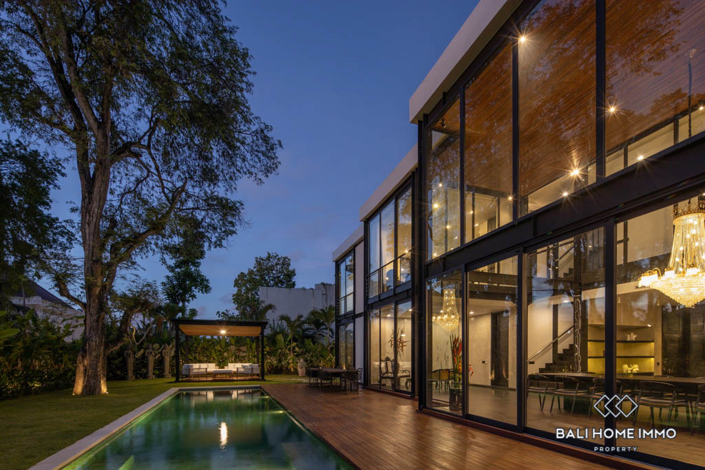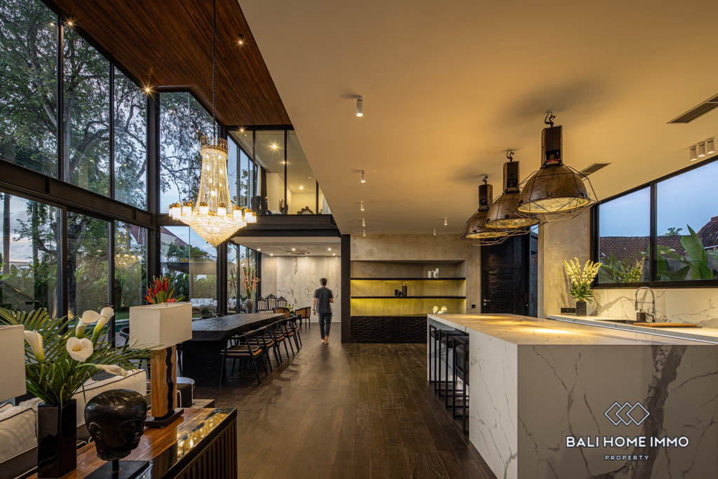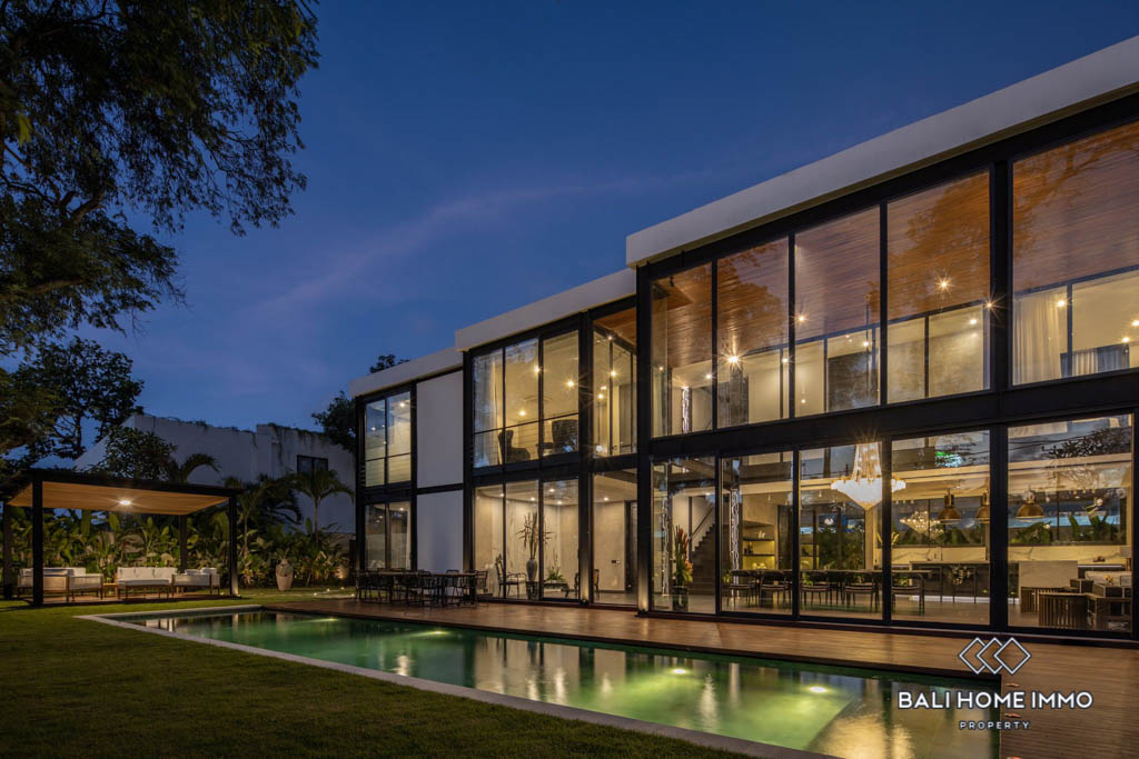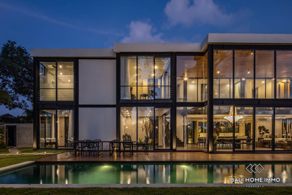 Located in the heart of Umalas, this luxurious modern estate boasts clean, minimal lines and spacious floor plans with ample natural light thanks to the glass facade. The ground floorโs open plan features a grand living and dining room under a double height ceiling as well as a fully equipped designer kitchen with marble benchtops and backsplash, both of which open up to a big landscaped yard with a 15 meter long swimming pool, an alfresco, and a covered terrace.