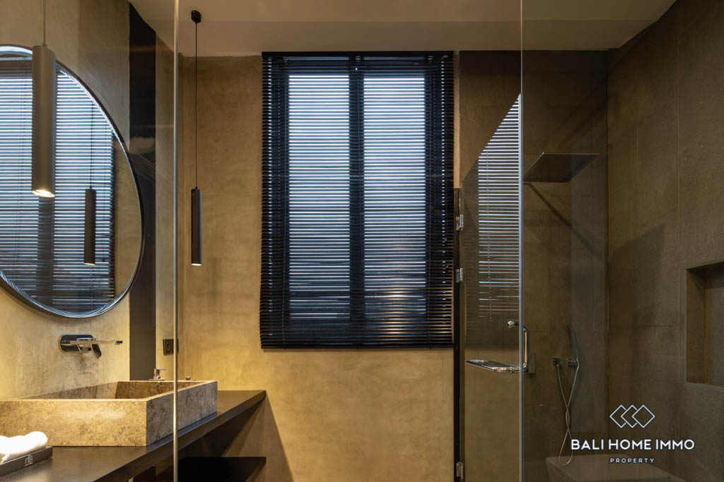 All 5 bedrooms are virtually identical and each comes with a gorgeous ensuite equipped with modern rainshower and bespoke double basin vanity. The villa also has a dedicated study, storage room, laundry room, and private parking for 2 cars. Built with a unique design, high grade materials and amenities, as well as top notch finishes, this one-of-a kind property is perfect for investment and private residence due to its strategic location very close to both Canggu and Seminyak.