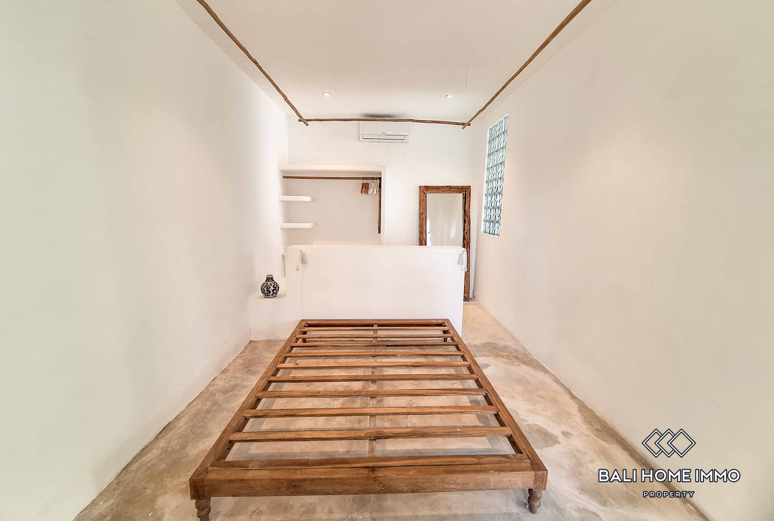 Designed with modern simplicity and a touch of Bali’s tropical essence, the villa offers a spacious bedroom complete with an open-concept ensuite bathroom. Here, natural light flows in and the tropical air creates a refreshing ambiance, blending the indoors with the island’s lush environment. The enclosed kitchen and living room provide a cozy and practical space—whether you’re preparing a meal, enjoying a quiet evening, or working from home.