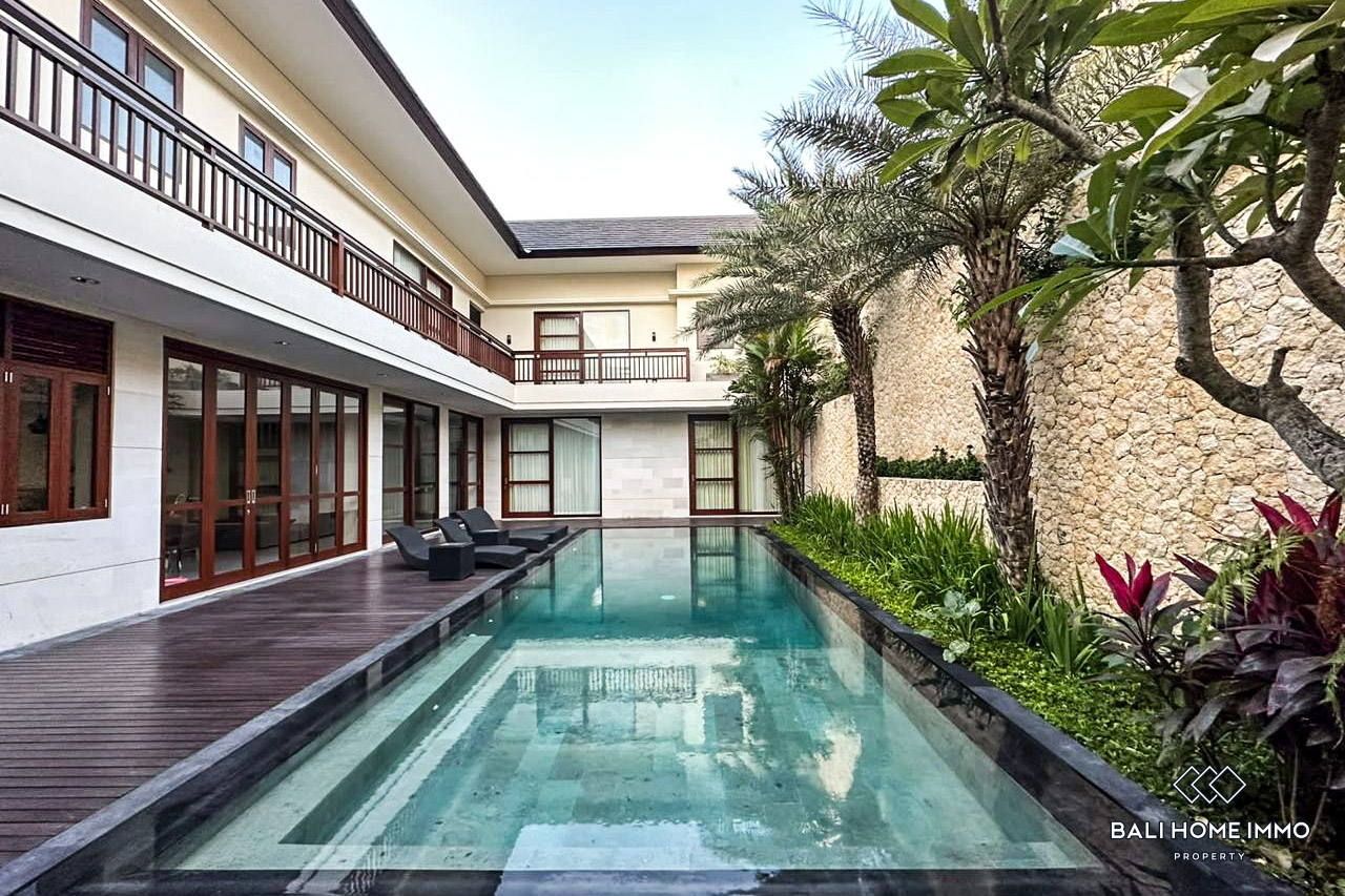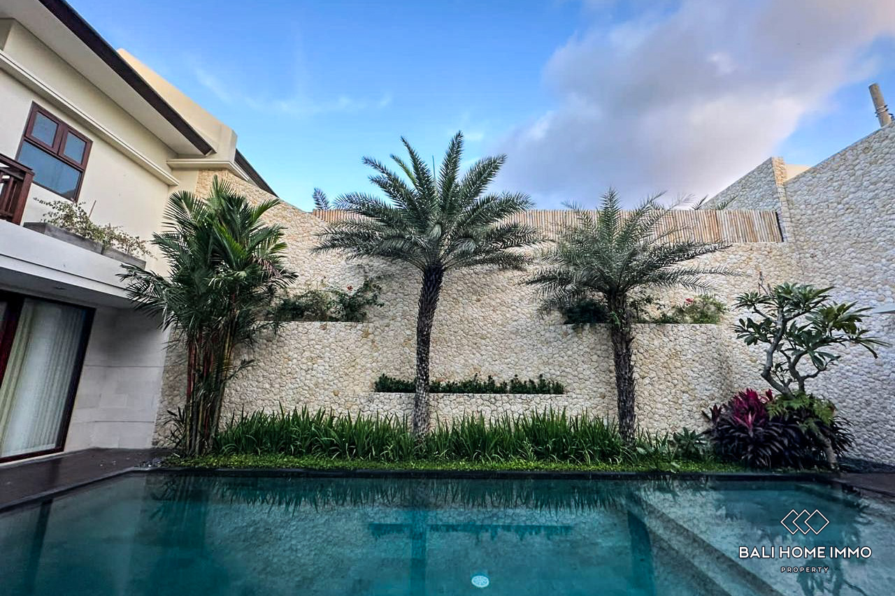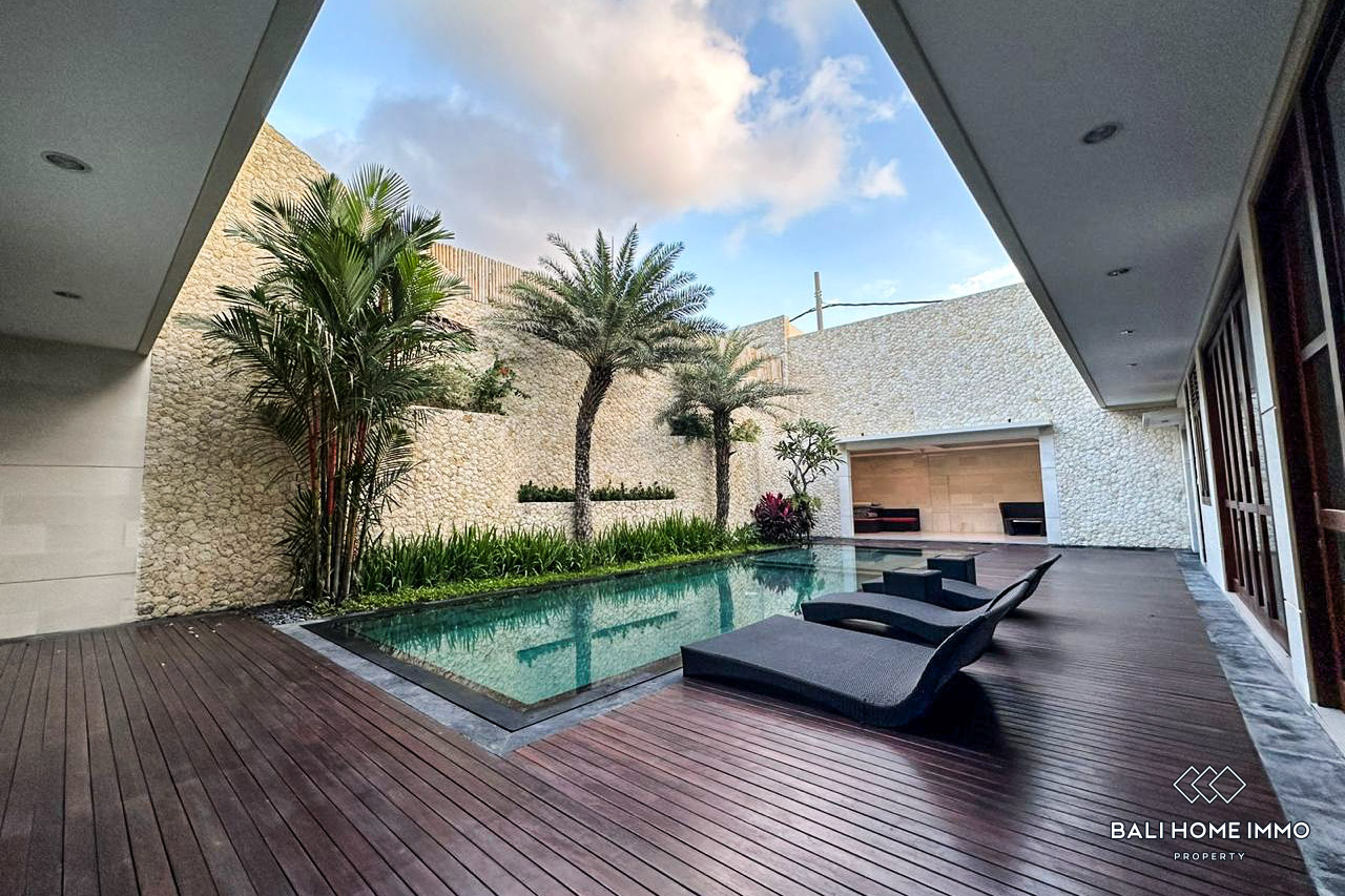 A modern villa with four bedrooms, including three staff rooms, is located in a serene residential area in Canggu Batu Bolong. This spacious villa allows pets and is just 9 minutes from Batu Bolong Beach. It also offers proximity to numerous restaurants, making it a convenient choice for dining and leisure.