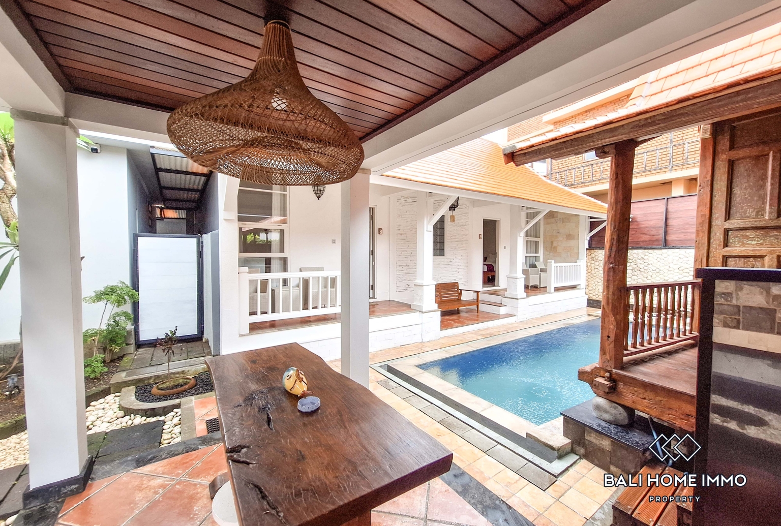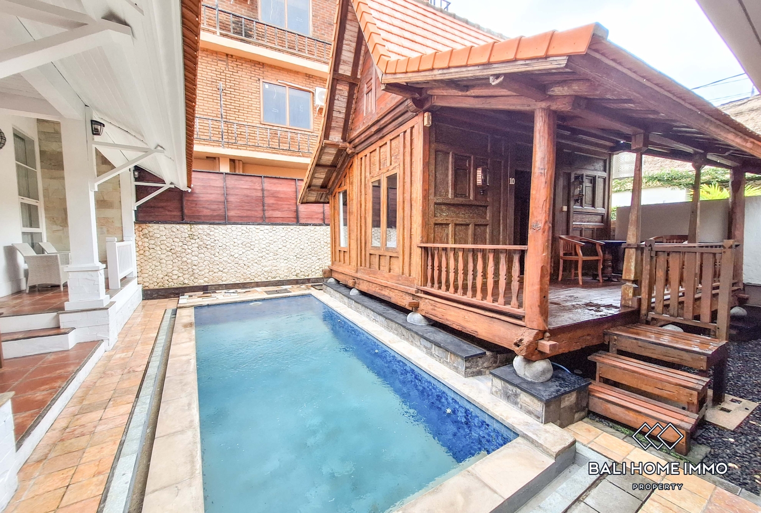 Outdoor living is a key highlight of the villa. A private swimming pool is complemented by a surrounding terrace, offering a pleasant space to relax, entertain, or enjoy sunny afternoons. The open layout between the buildings creates a peaceful atmosphere with a strong sense of privacy.