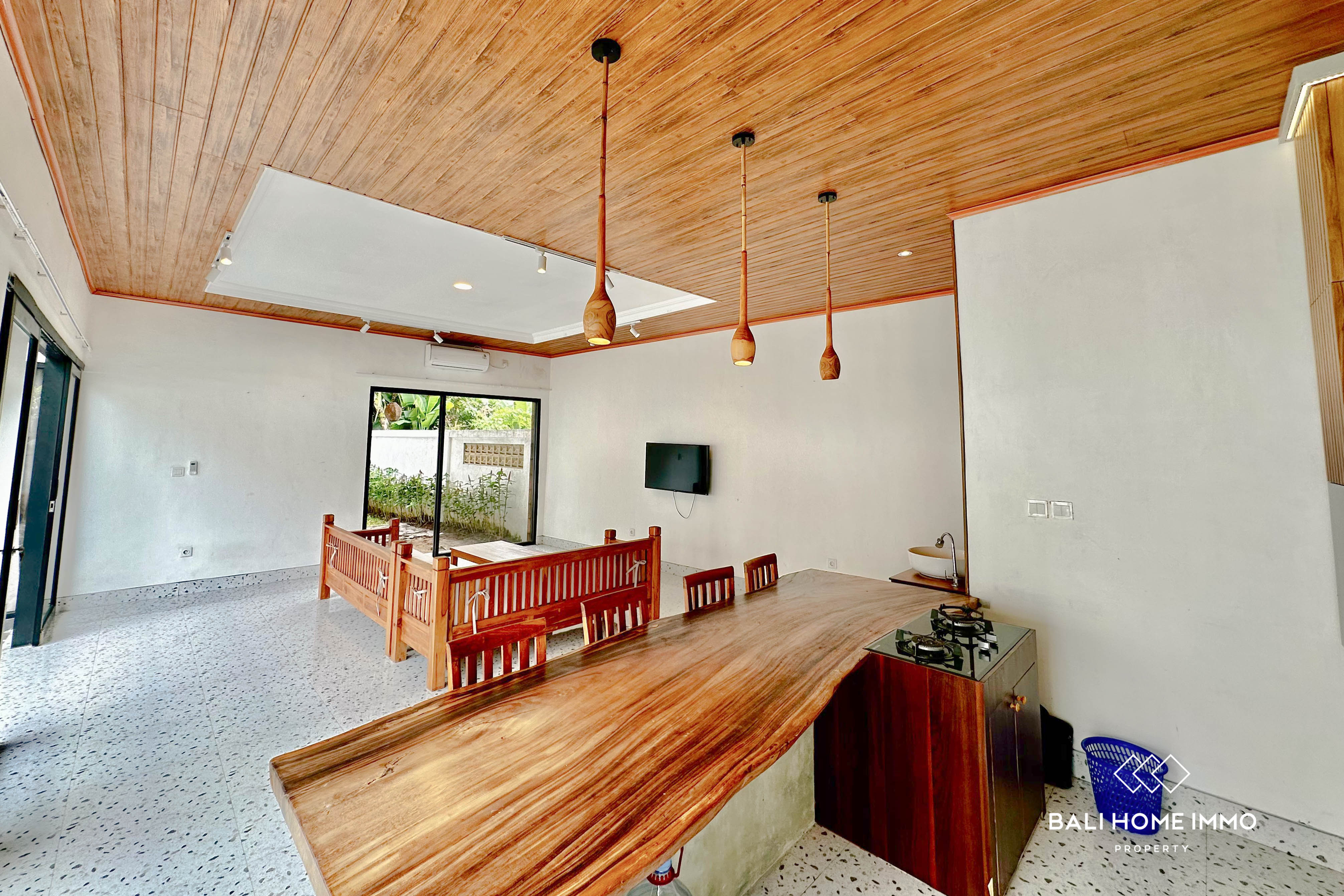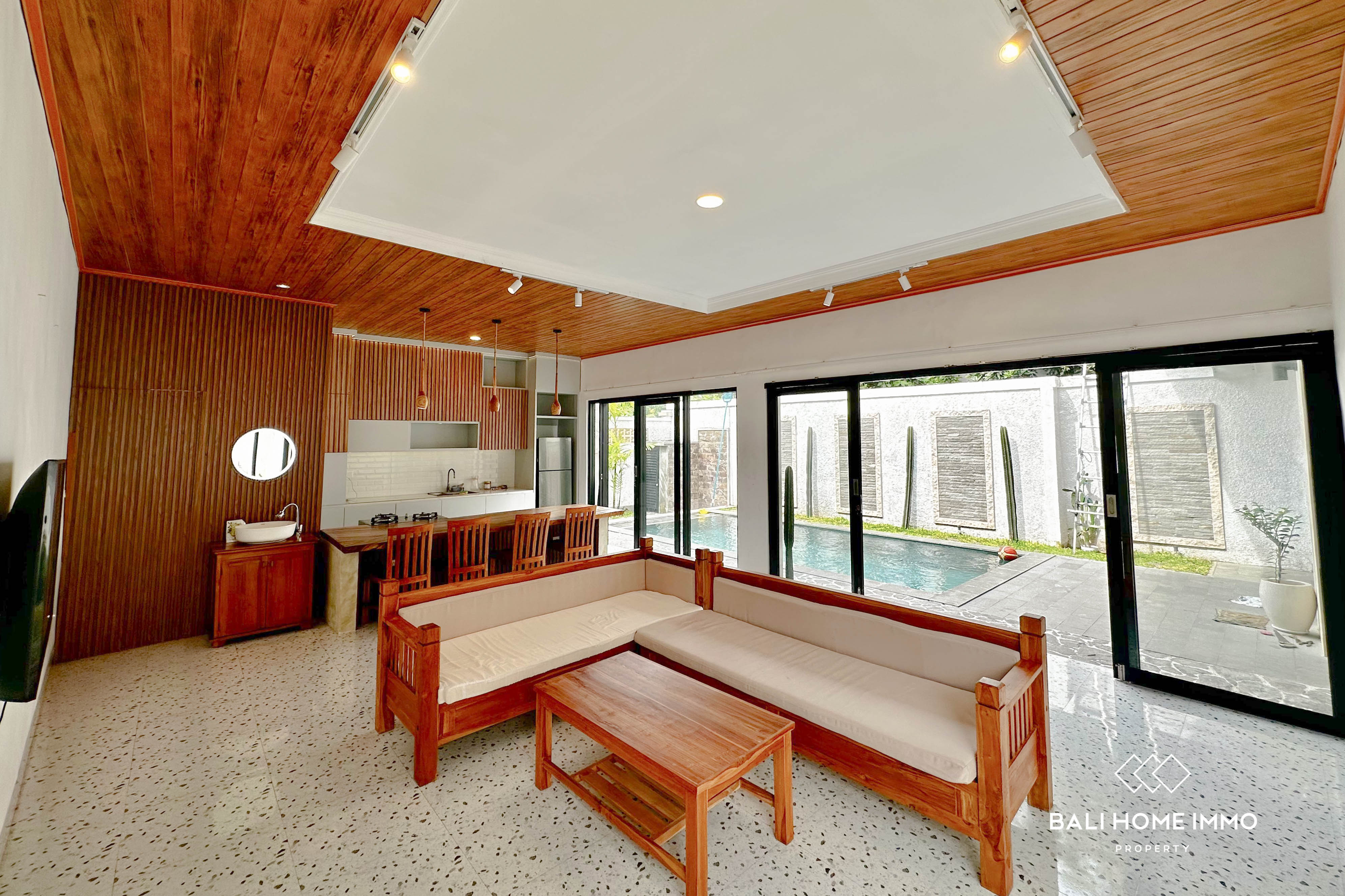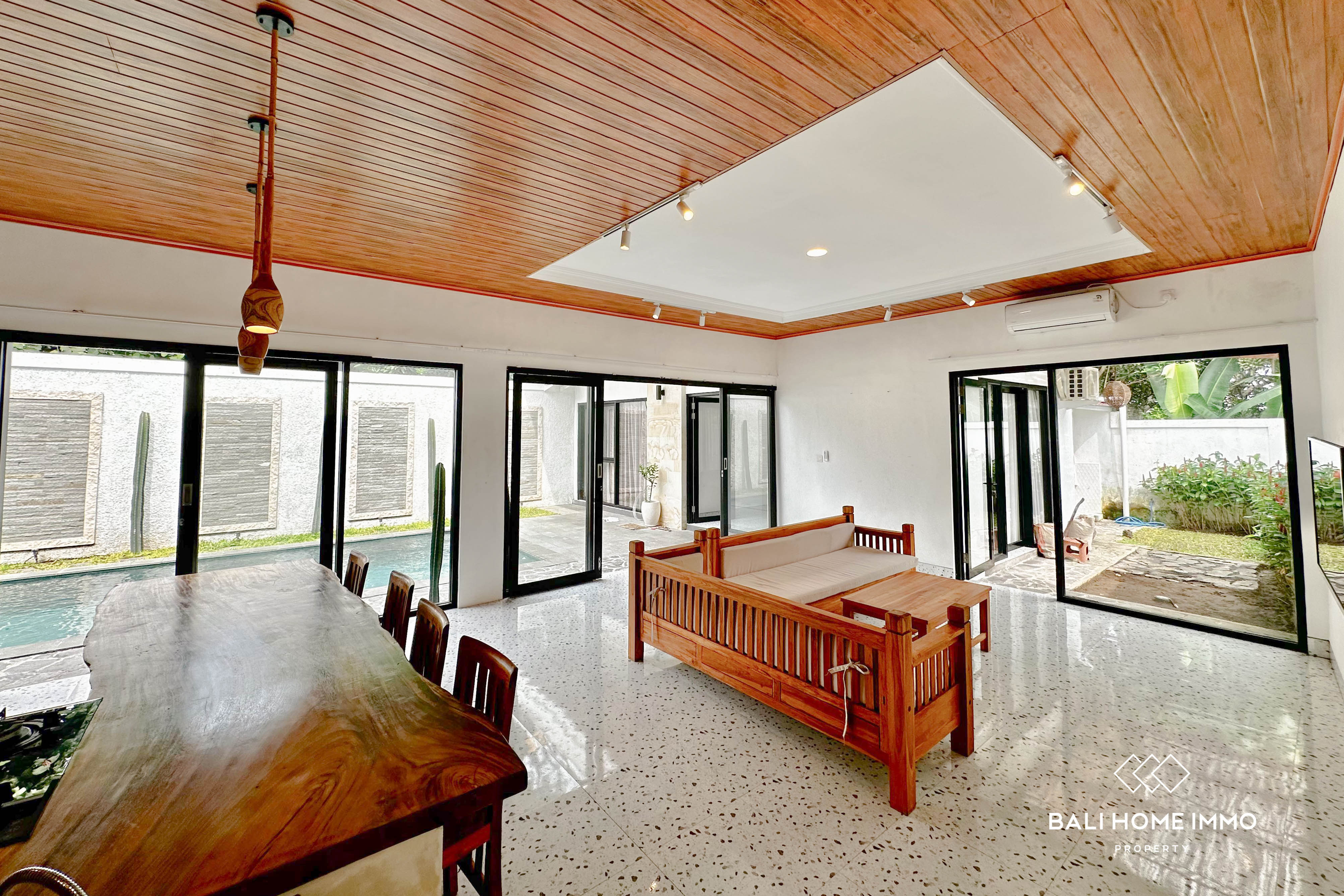 The villa sits on 250 sqm of land, offering a spacious layout that includes a large pool and a beautifully landscaped garden, perfect for relaxation or entertaining. The modern, open-concept design seamlessly connects the living, dining, and kitchen areas, creating a bright and airy space. You can choose to enjoy the comfort of the AC with the glass doors closed or open the area to let the fresh breeze flow straight into the villa while overlooking the pool.