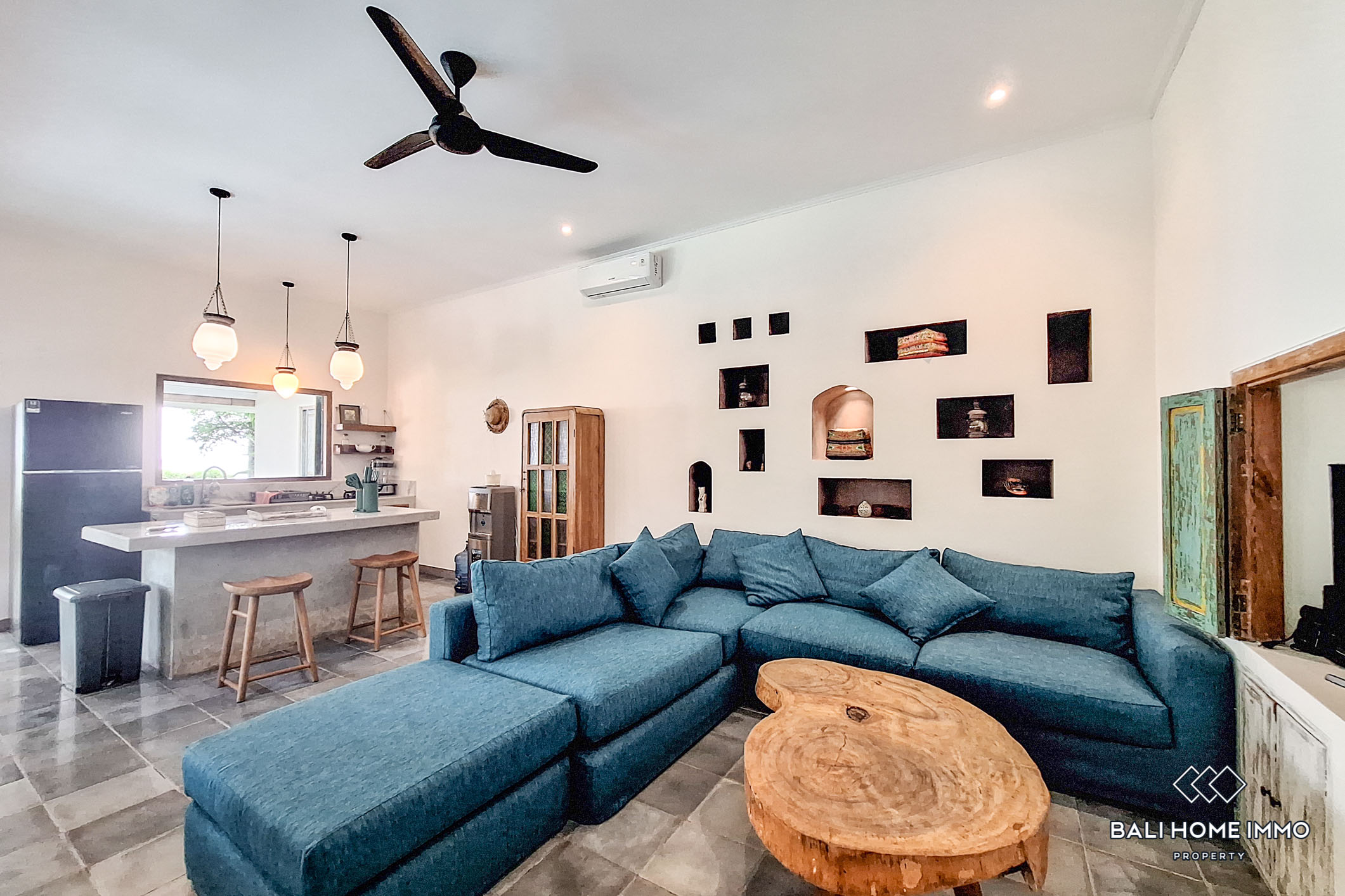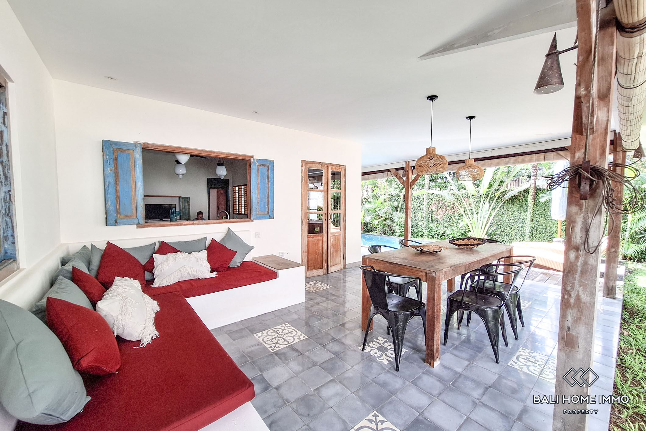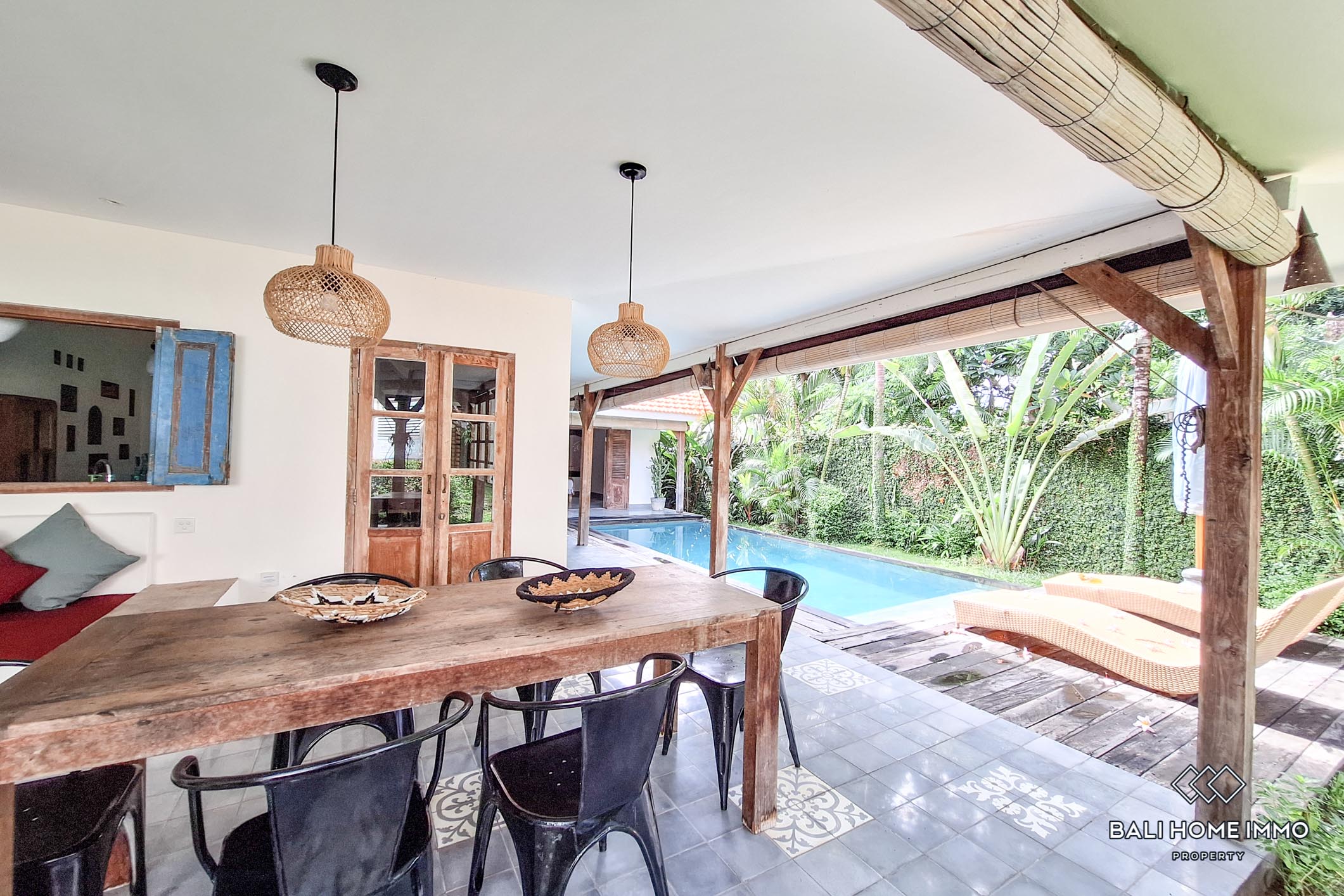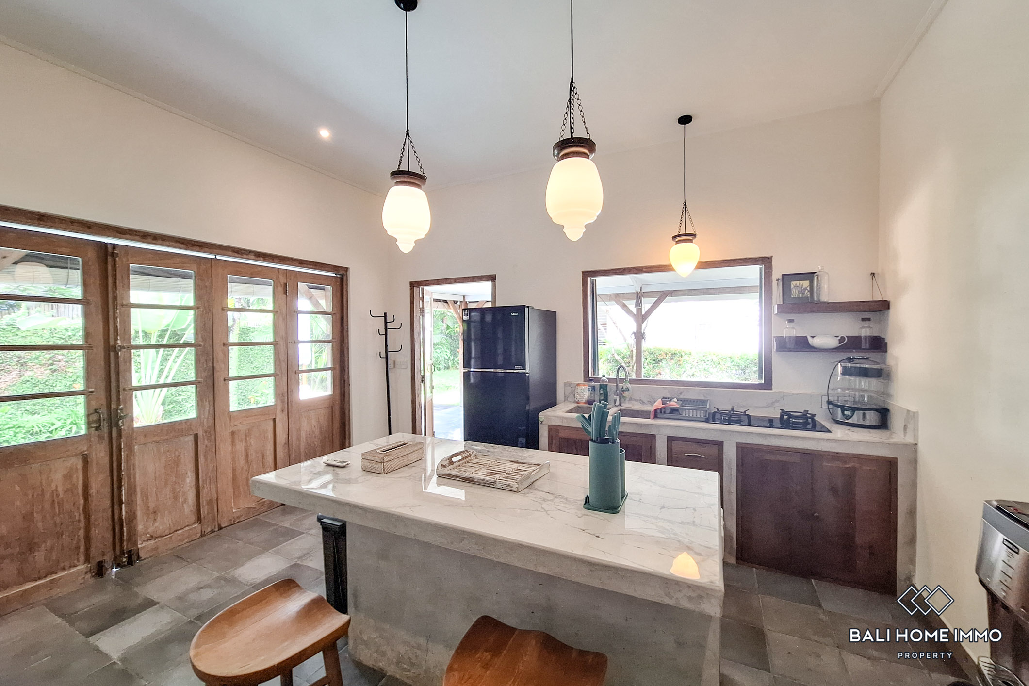 This newly renovated 3-bedroom Joglo-style villa blends modern comfort with traditional Indonesian architecture. The enclosed living and dining spaces feature a seamless mix of rustic charm and contemporary elegance. Large open shelves, natural wood furnishings, and cozy seating areas give a warm, homey atmosphere. A spacious kitchen with sleek countertops and built-in appliances adds a modern touch while ensuring functionality.