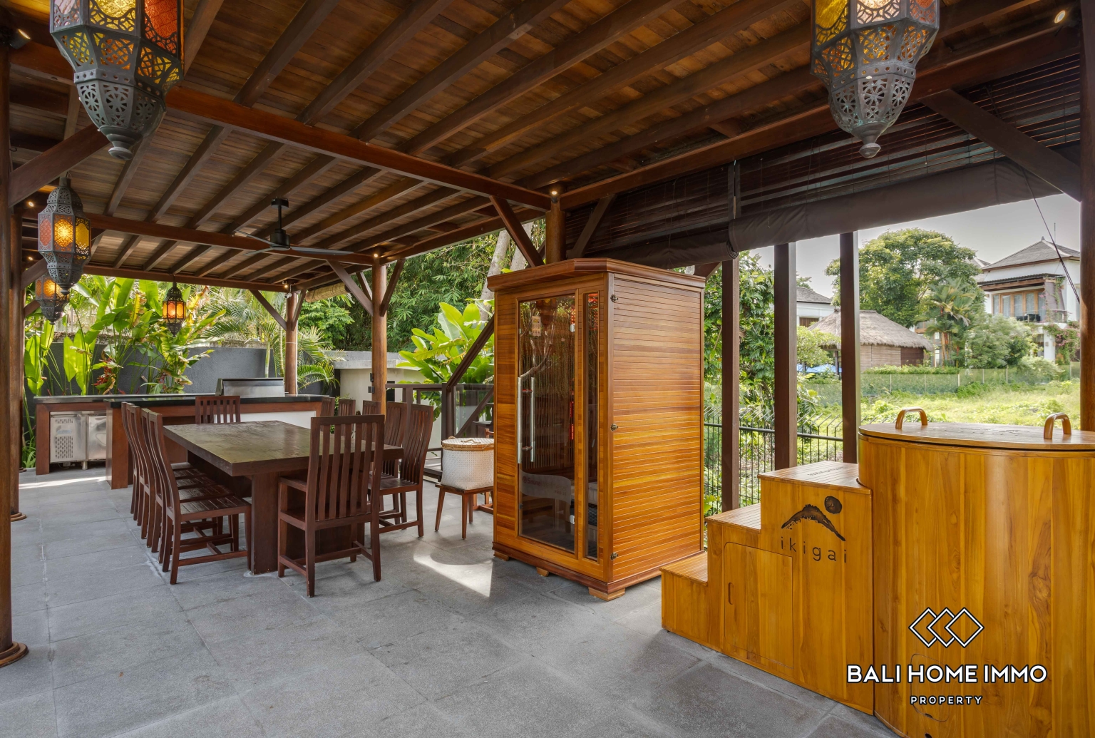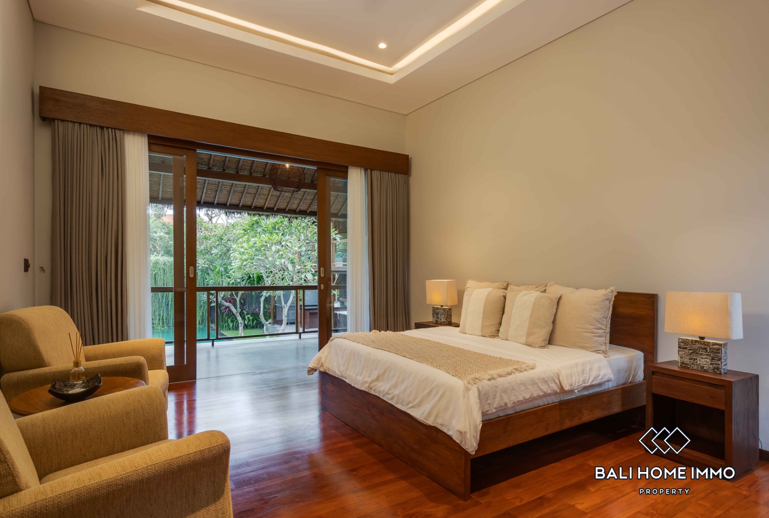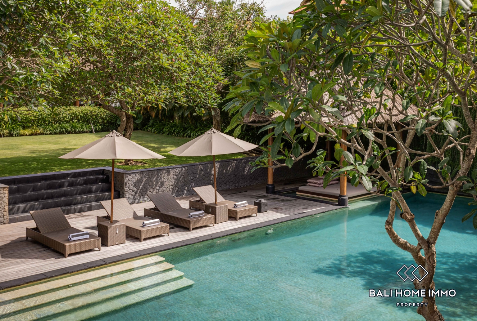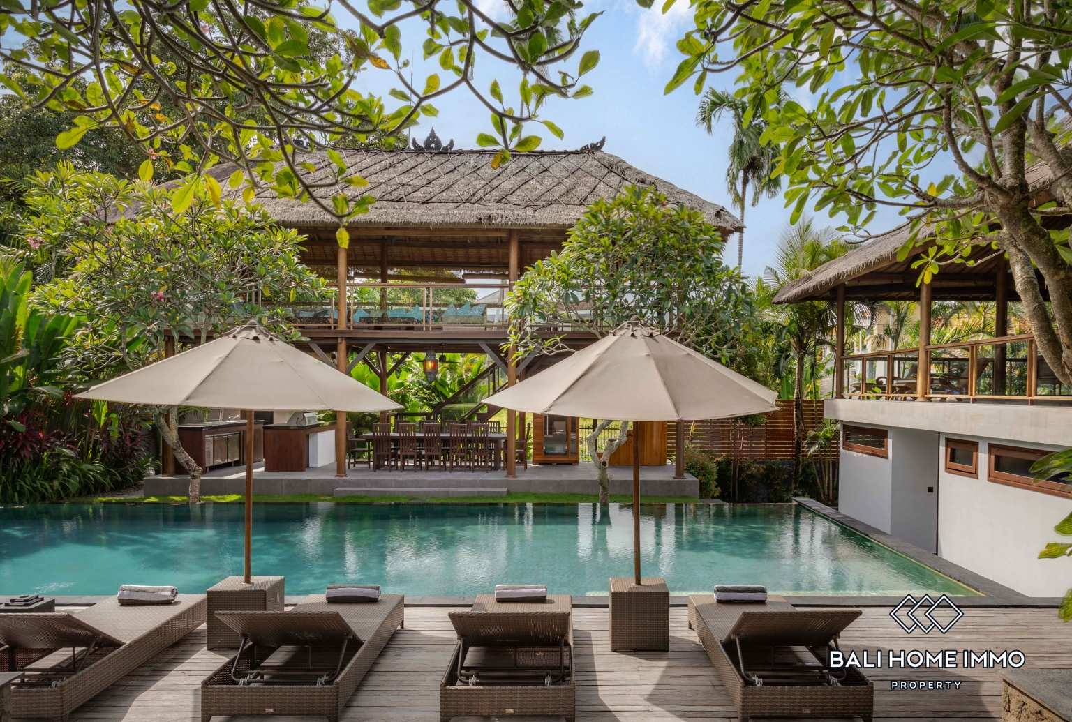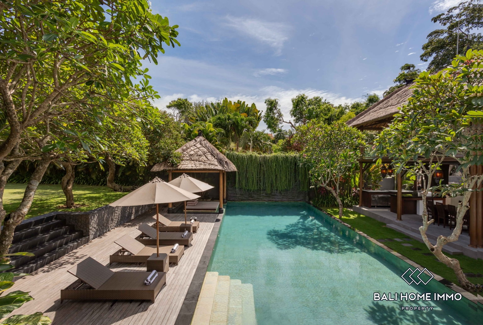 The outdoor area is equally impressive, with a spacious tropical garden and generous living spaces that enhance the sense of openness and privacy. A large private swimming pool becomes the focal point of the villa, complemented by a terrace where you can unwind, host sunset gatherings, or enjoy peaceful mornings surrounded by greenery.