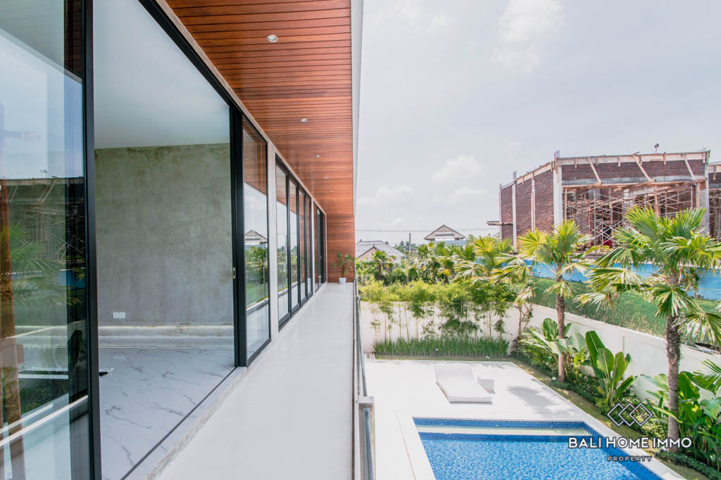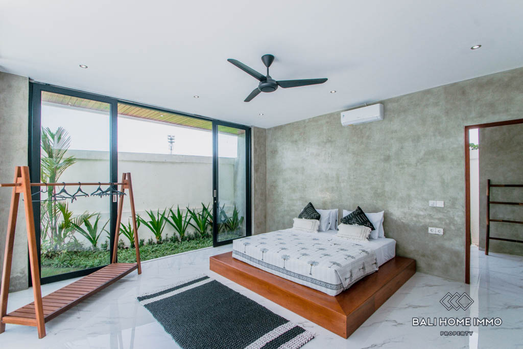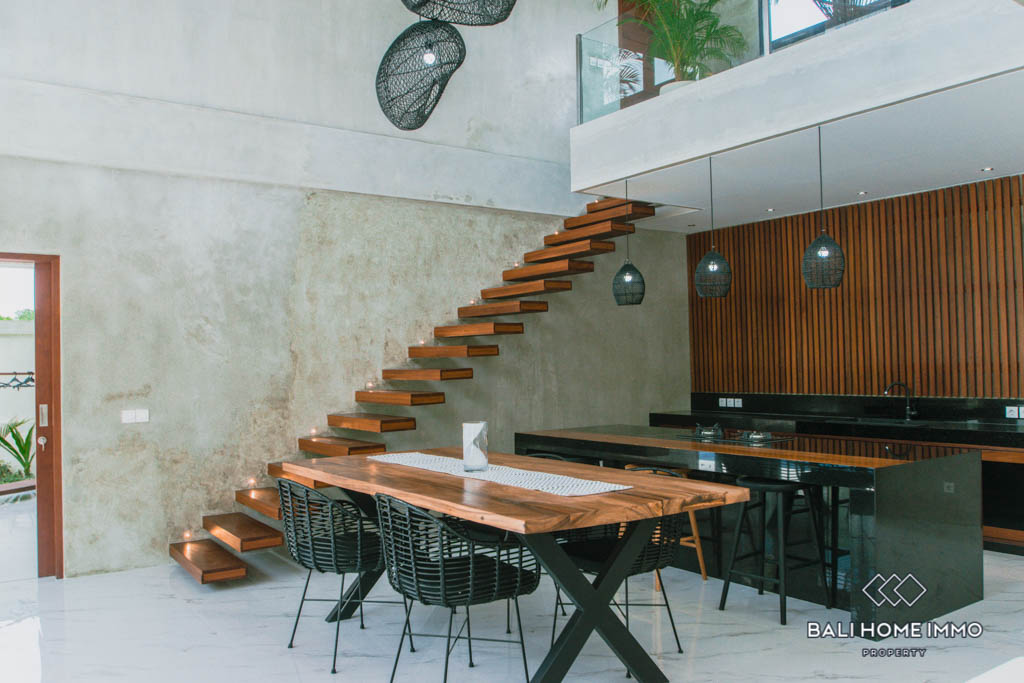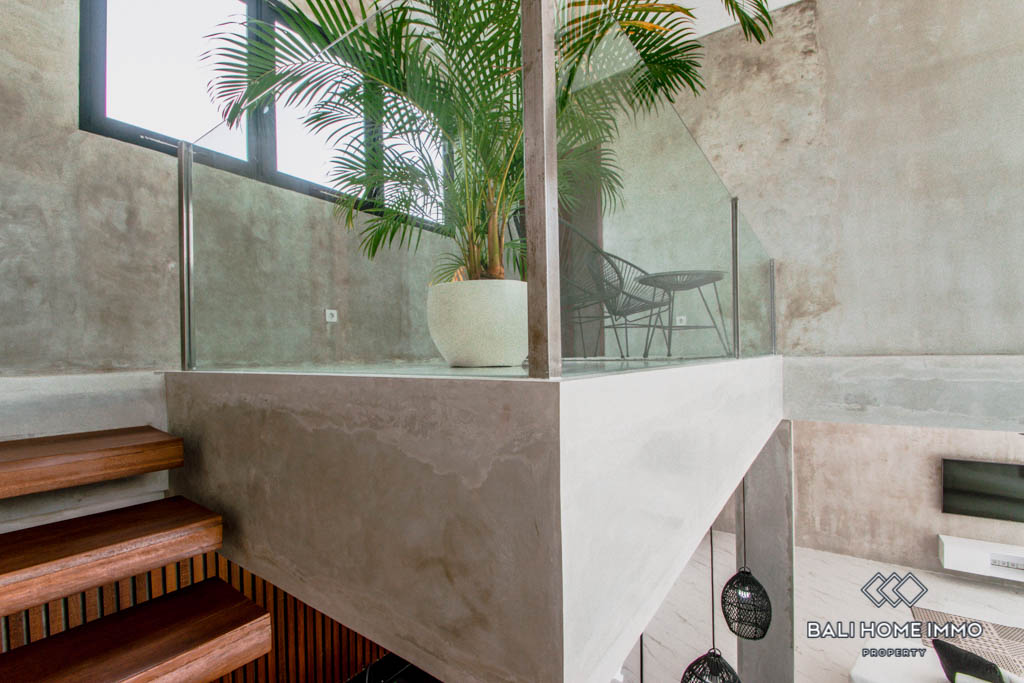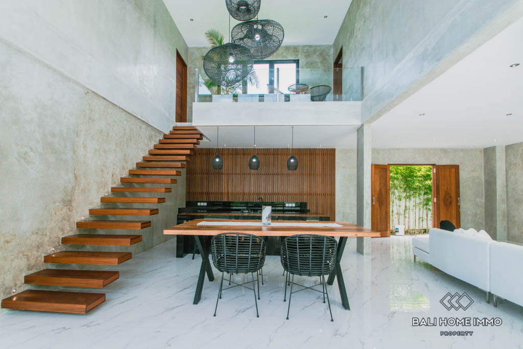 This brand new villa is located in Buduk, a largely pristine and quiet region perfect if you don’t want the hustle and bustle of Canggu yet still want to stay close to it. It boasts a spacious open plan with an enclosed living room, a large kitchen equipped with a gas cooktop and oven, and a mezzanine overlooking the backyard from inside. In the back, you will find a 10-meter long swimming pool surrounded by lush tropical plants grown along the exterior wall.