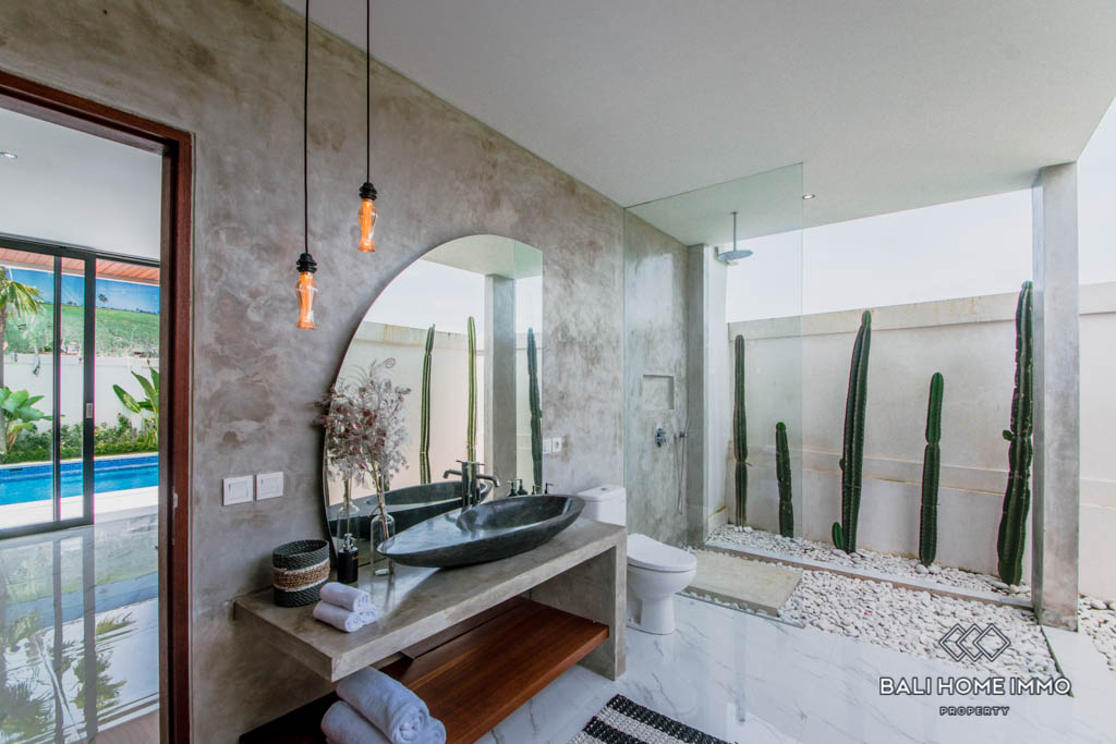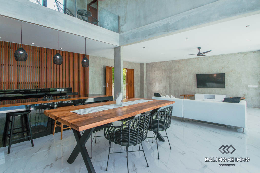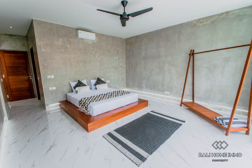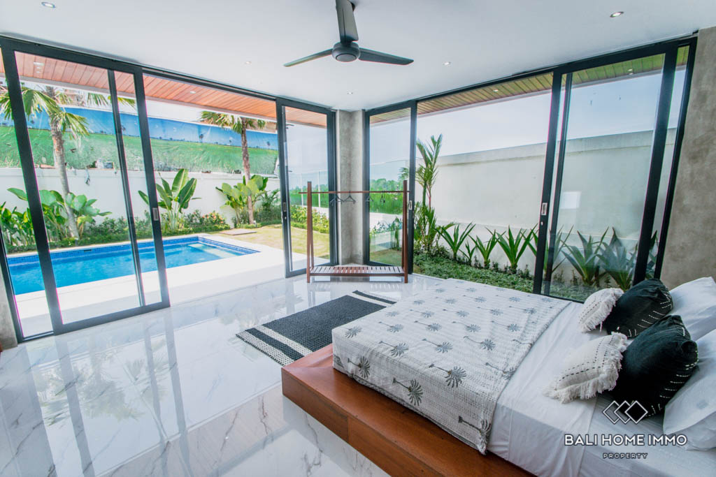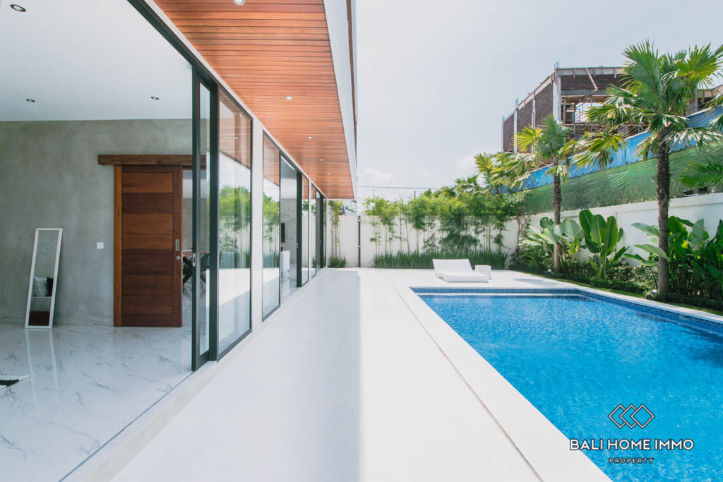 This brand new villa is located in Buduk, a largely pristine and quiet region perfect if you don’t want the hustle and bustle of Canggu yet still want to stay close to it. It boasts a spacious open plan with an enclosed living room, a large kitchen equipped with a gas cooktop and oven, and a mezzanine overlooking the backyard from inside. In the back, you will find a 10-meter long swimming pool surrounded by lush tropical plants grown along the exterior wall.