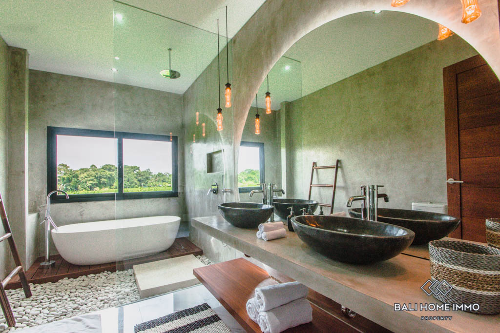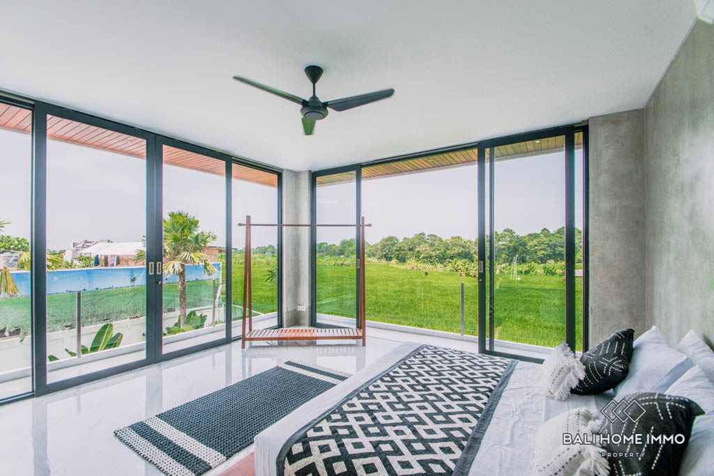 All 3 bedrooms are nearly identical, each featuring an ensuite bathroom and fitted with sliding glass doors that allow ample natural lighting. From the first floor and balcony, you can enjoy a tranquil view of the vast paddy fields surrounding the villa. Its laid back ambience, spacious living area and backyard, as well as proximity to Pererenan and Canggu makes this villa a great vacation home.