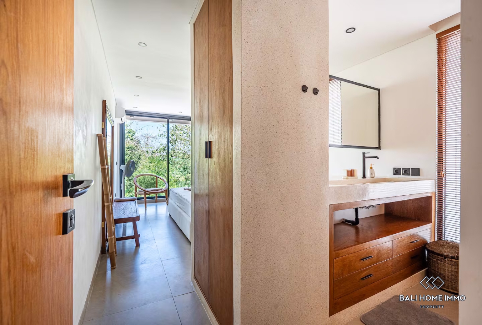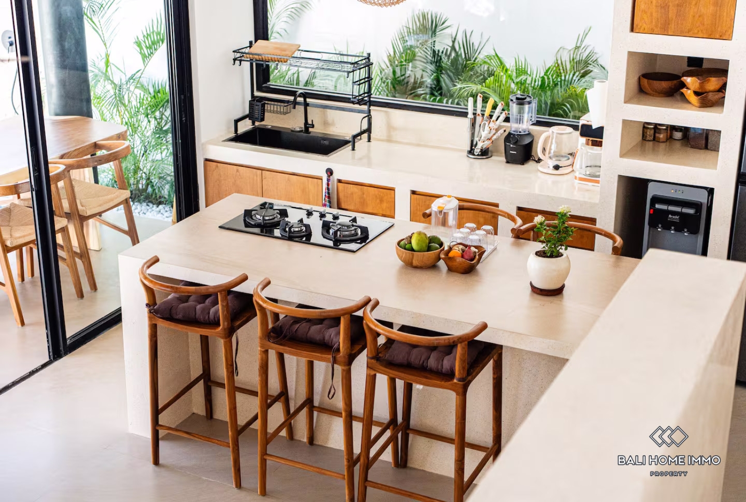 The villa offers an enclosed living room that ensures comfort and privacy, seamlessly connected to a fully equipped kitchen and dining area. The interiors showcase a harmonious combination of natural materials, warm wooden finishes, and large glass doors that allow plenty of natural light to flow throughout the space. Each bedroom is well appointed, providing a cozy and tranquil retreat.