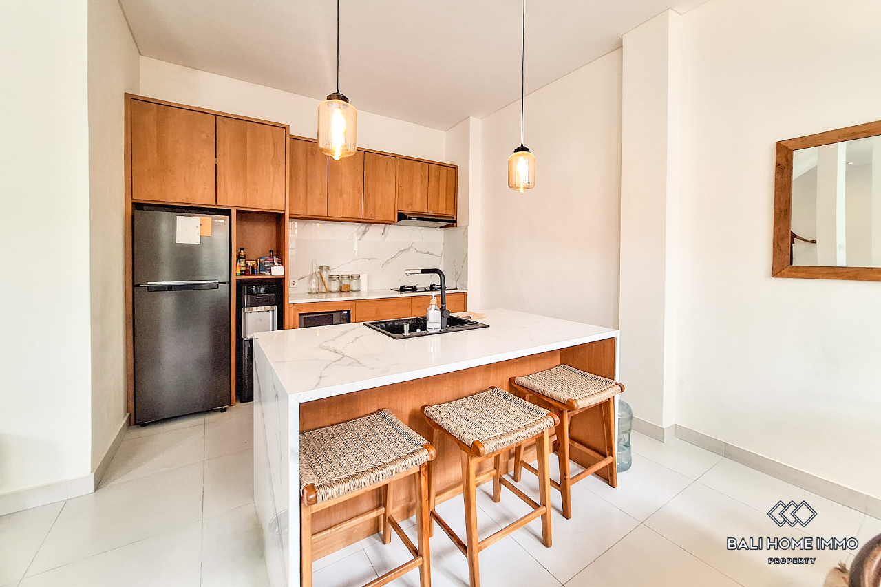 Nestled in the serene residential area of Umalas, this elegant 2-bedroom townhouse villa offers a perfect blend of modern minimalist design and tropical comfort. Featuring clean architectural lines, expansive black-framed windows, and an inviting open layout, this villa is designed to provide a bright and airy living experience. ย