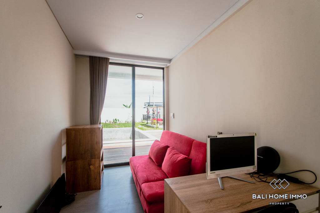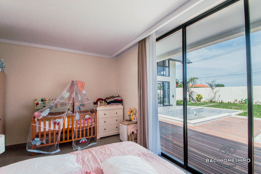 The enclosed living room area provides a very spacious atmosphere. The kitchen is another highlight of this well-designed villa, providing expensive and imported furniture and plenty of space for a real cooking experience. It provides beautiful and custom built-in drawers, cupboards, an oven. The villa is built throughout with the best building materials and appliances available in Bali.