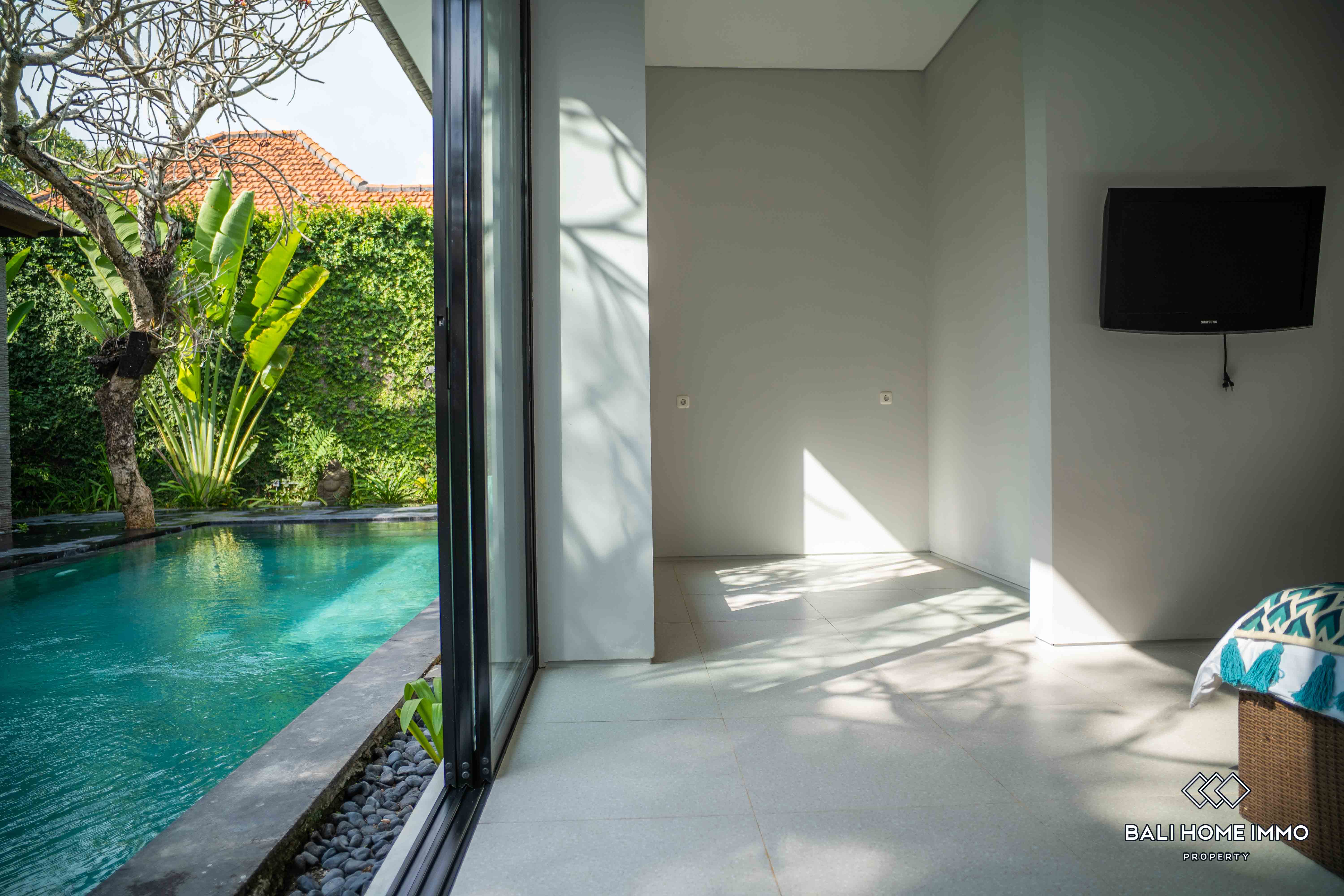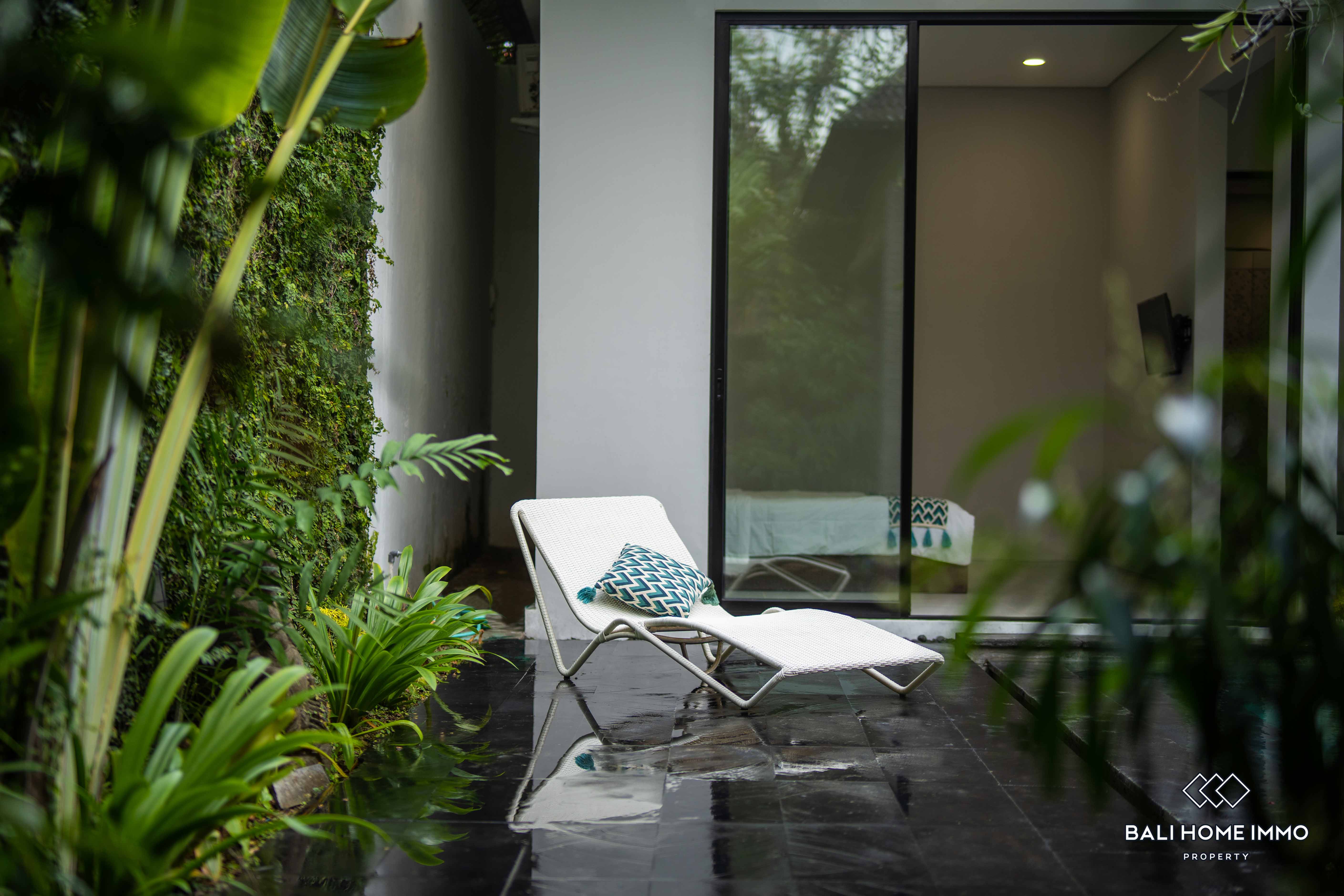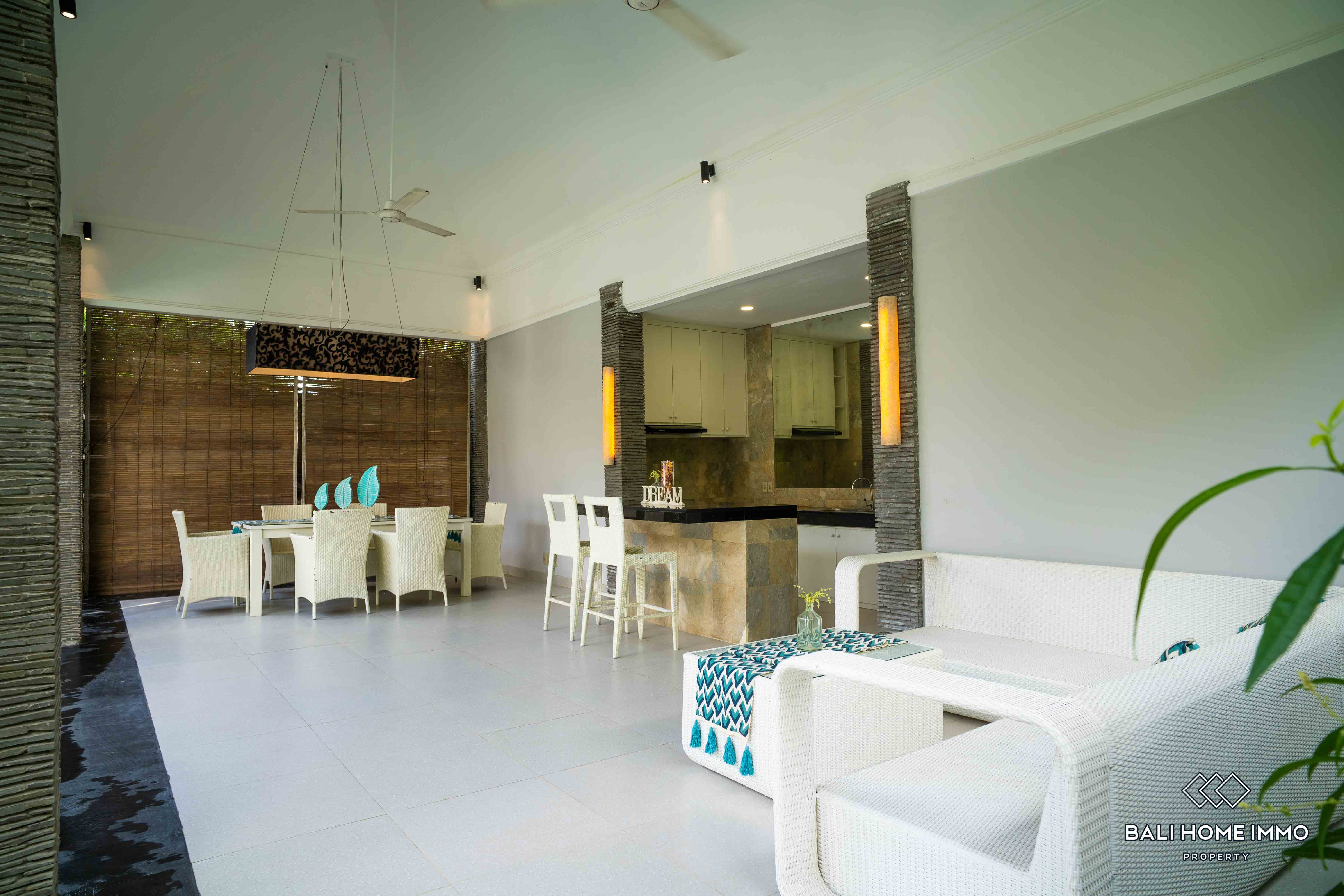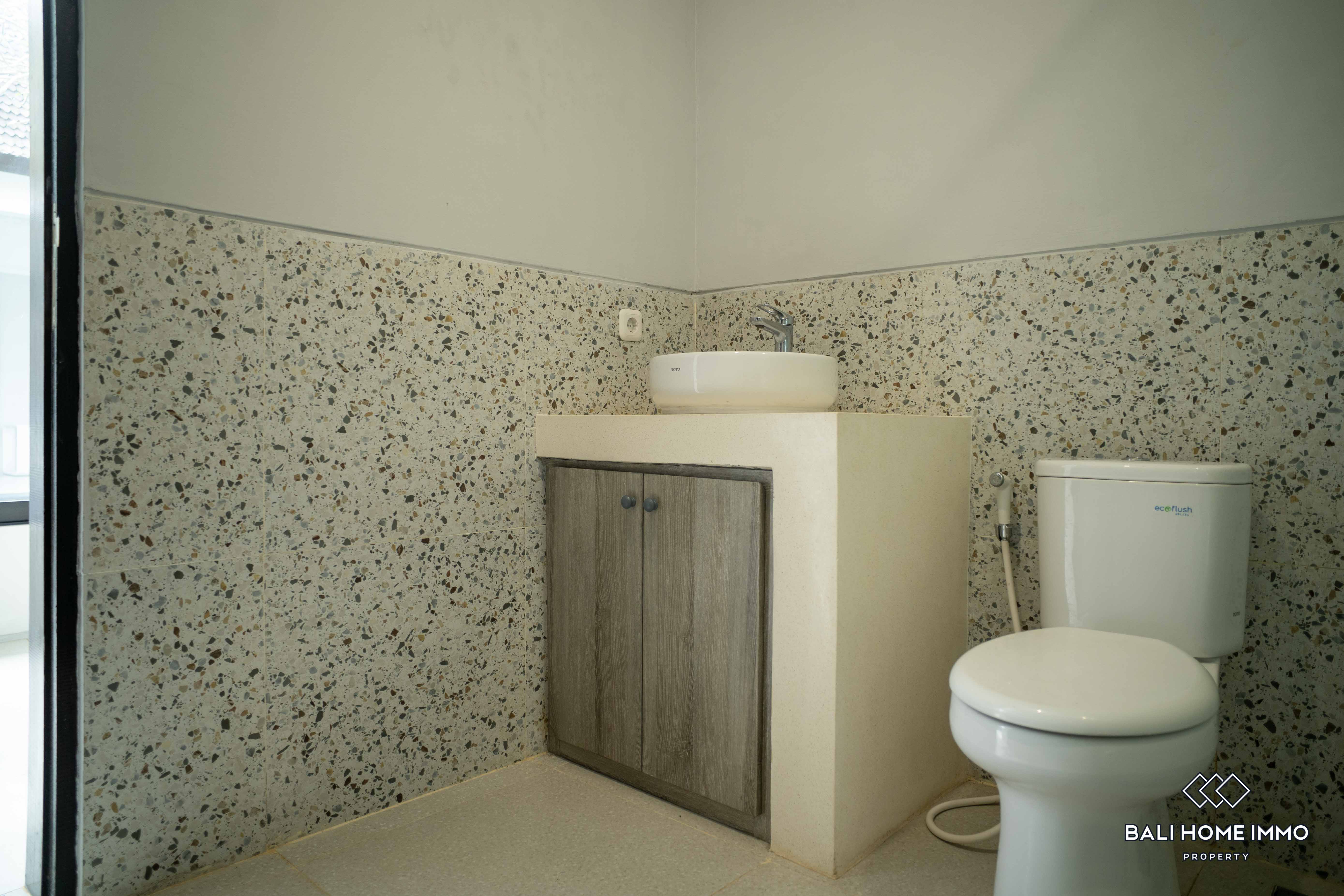 Additionally, there are two ensuite bathrooms for added convenience and privacy, along with storage space to cater to practical needs. The outdoor area features a swimming pool, perfect for enjoying refreshing dips on warm Bali days. Furnished with tasteful furniture, the property ensures immediate comfort and convenience for its occupants.