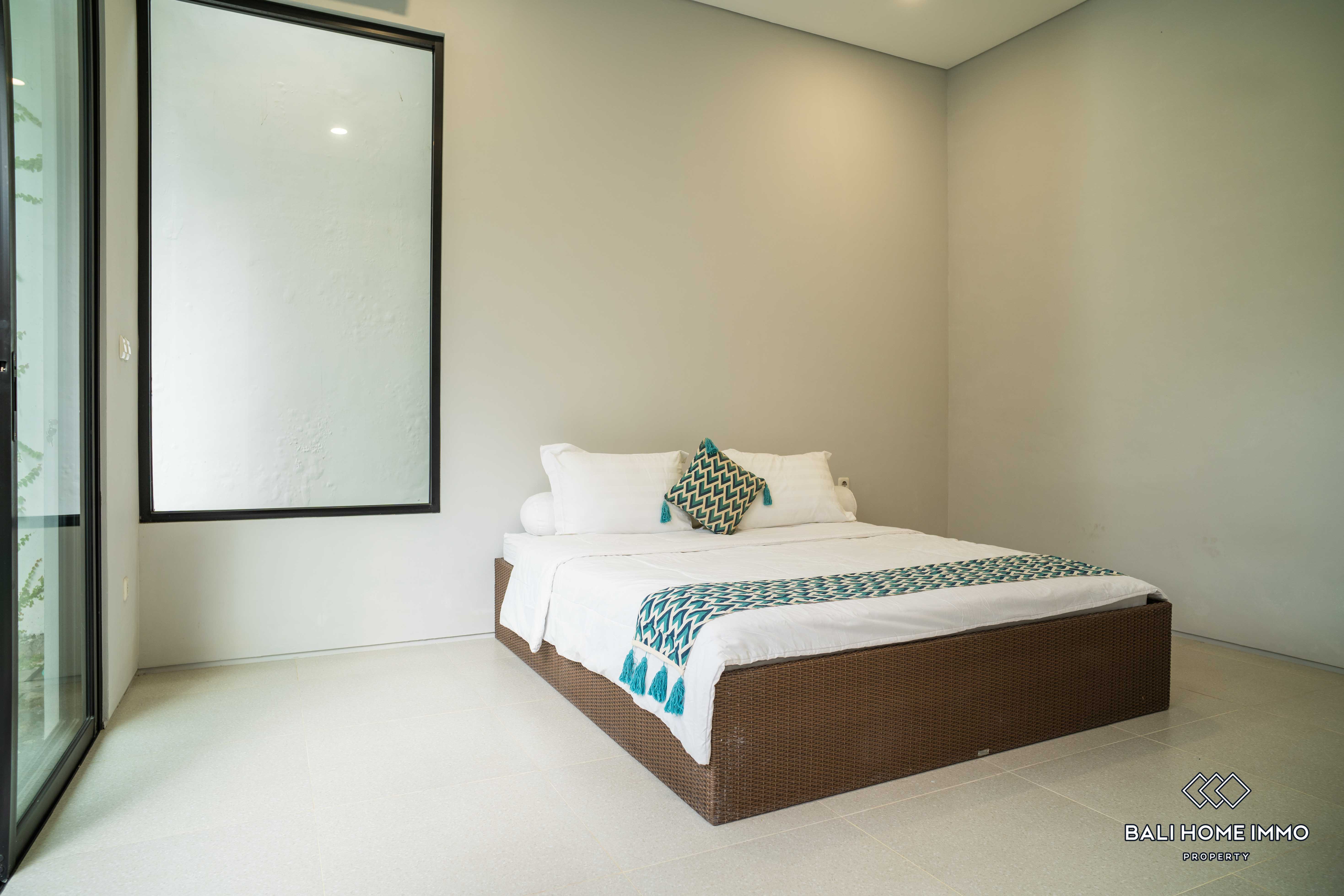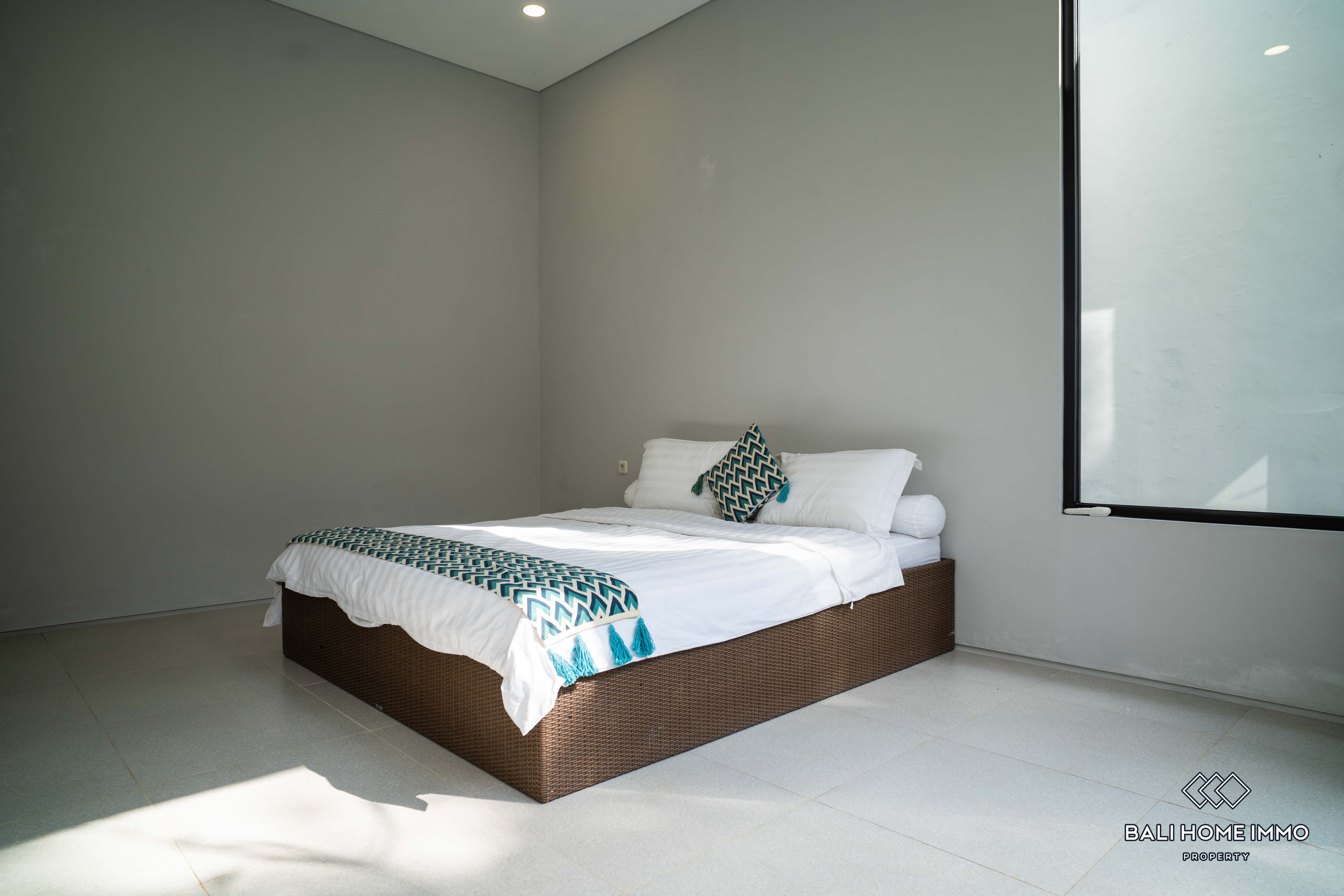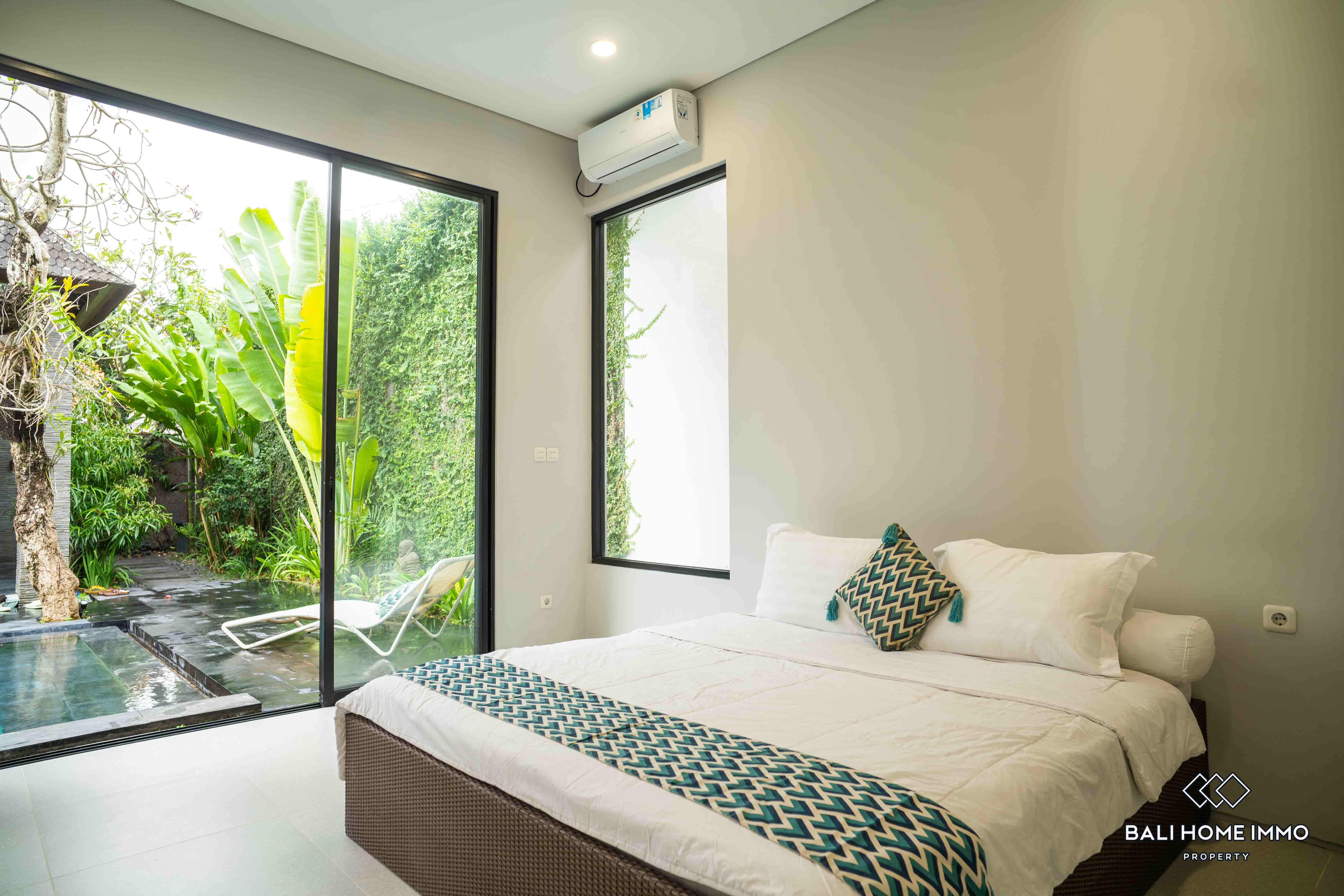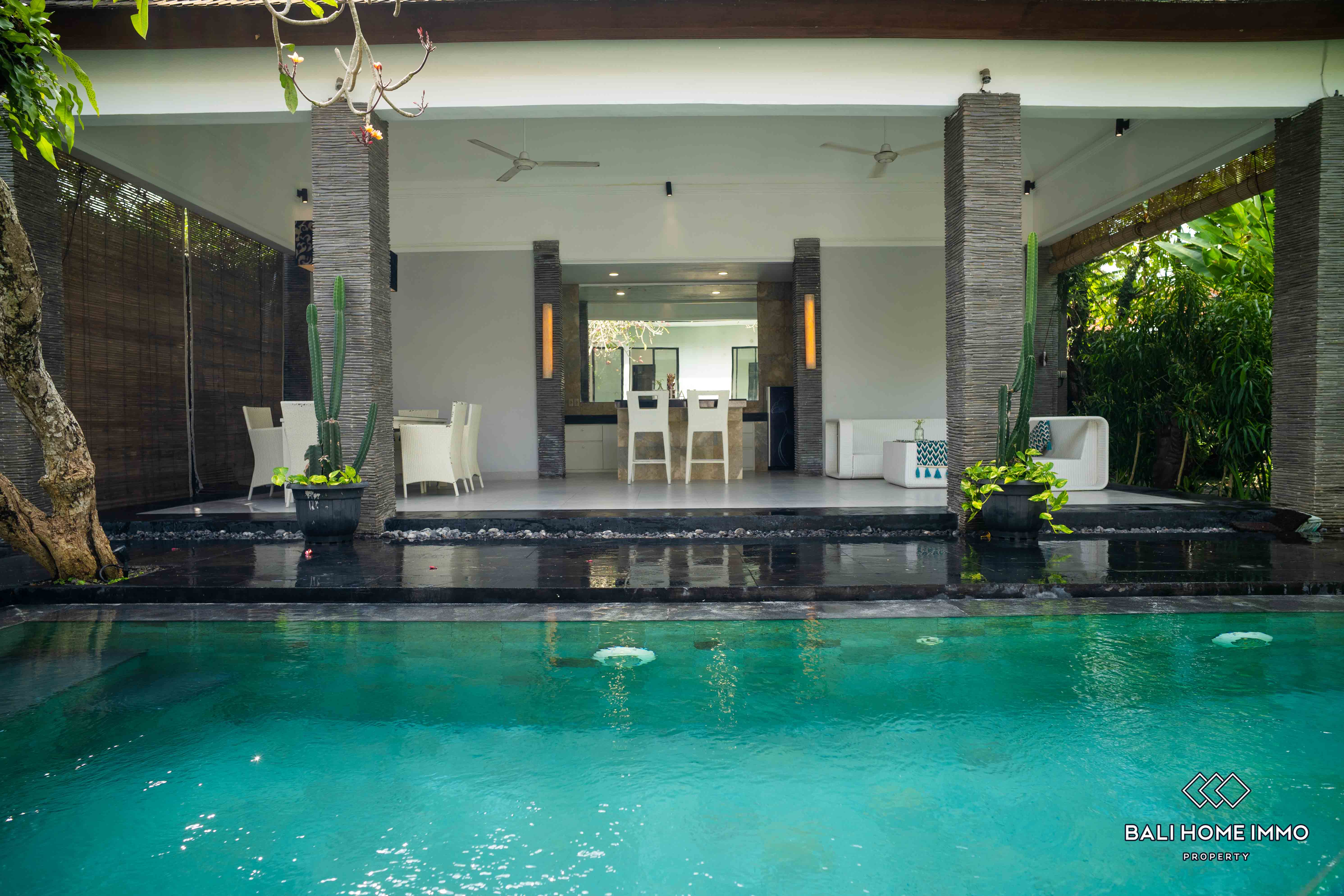 Additionally, there are two ensuite bathrooms for added convenience and privacy, along with storage space to cater to practical needs. The outdoor area features a swimming pool, perfect for enjoying refreshing dips on warm Bali days. Furnished with tasteful furniture, the property ensures immediate comfort and convenience for its occupants.