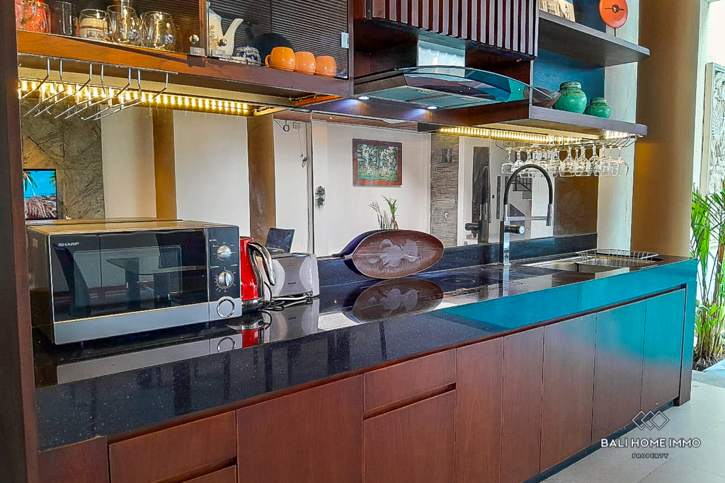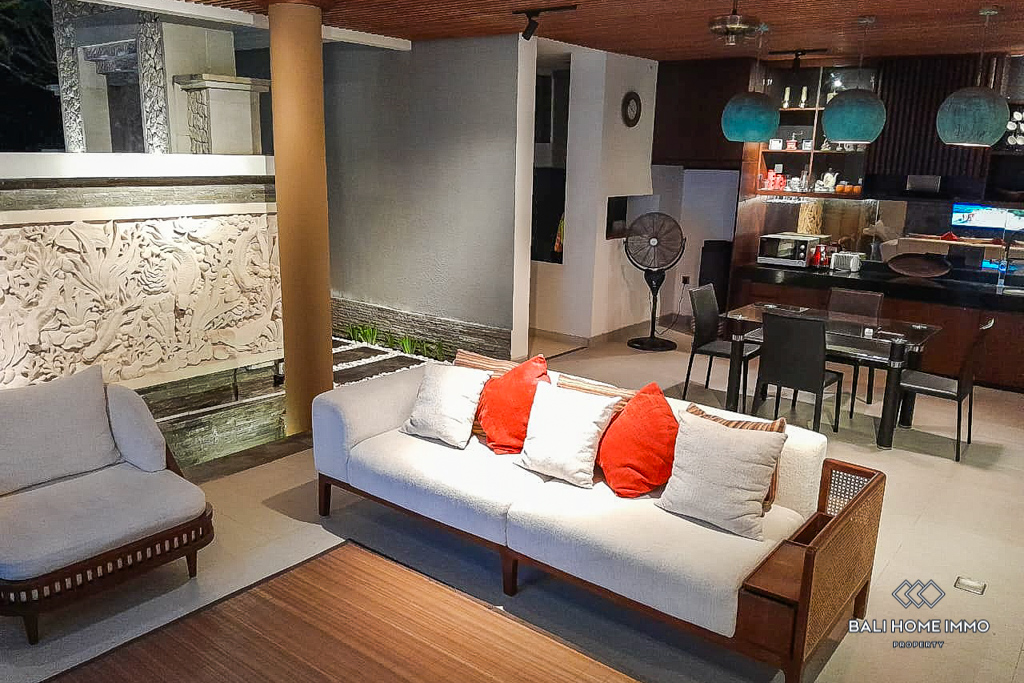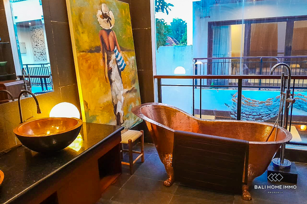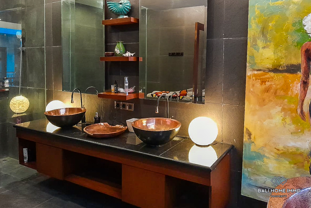 The living room, dining area, and kitchen flow seamlessly toward the inviting waters of the pool. Notably, the living room features a captivating Balinese wall relief, infusing the space with cultural flair. With a total of three bedrooms, each with an en-suite, that offer both comfort and convenience. The master en-suite represents a pinnacle of relaxation space, boasting lavish copper double sinks and a copper tub. A guest toilet and a balcony enhance the practicality of this abode, while tasteful furnishings elevate your living experience.