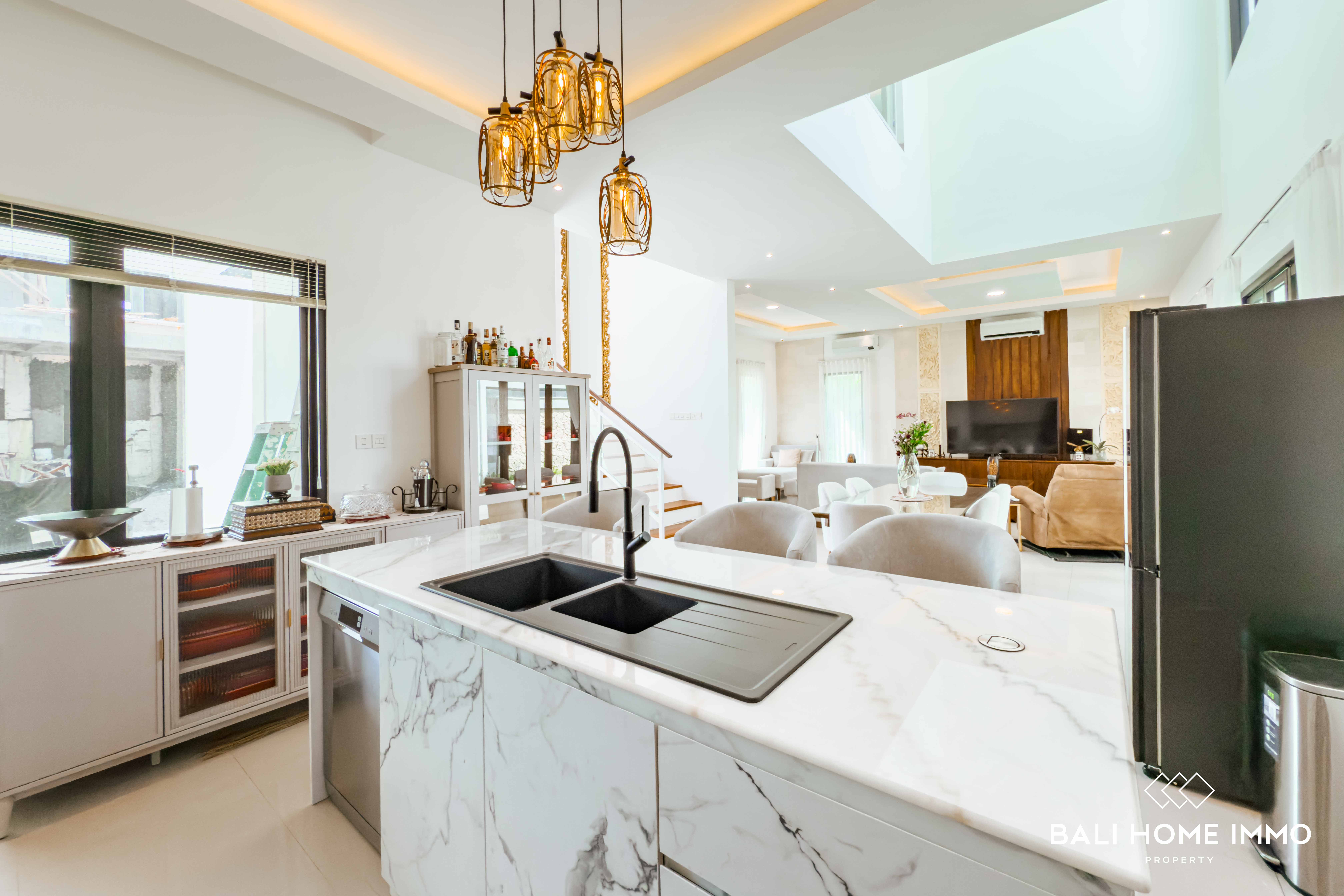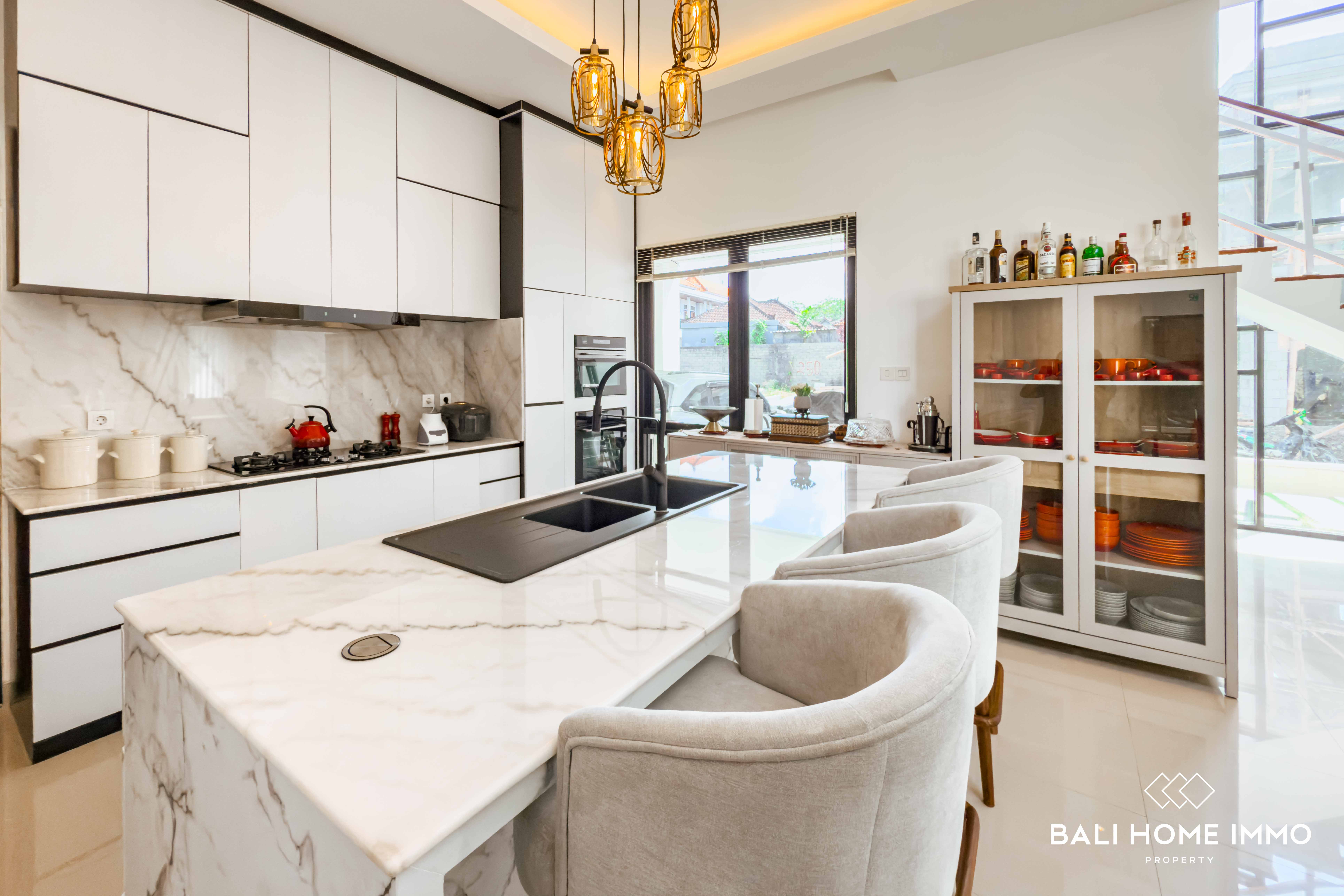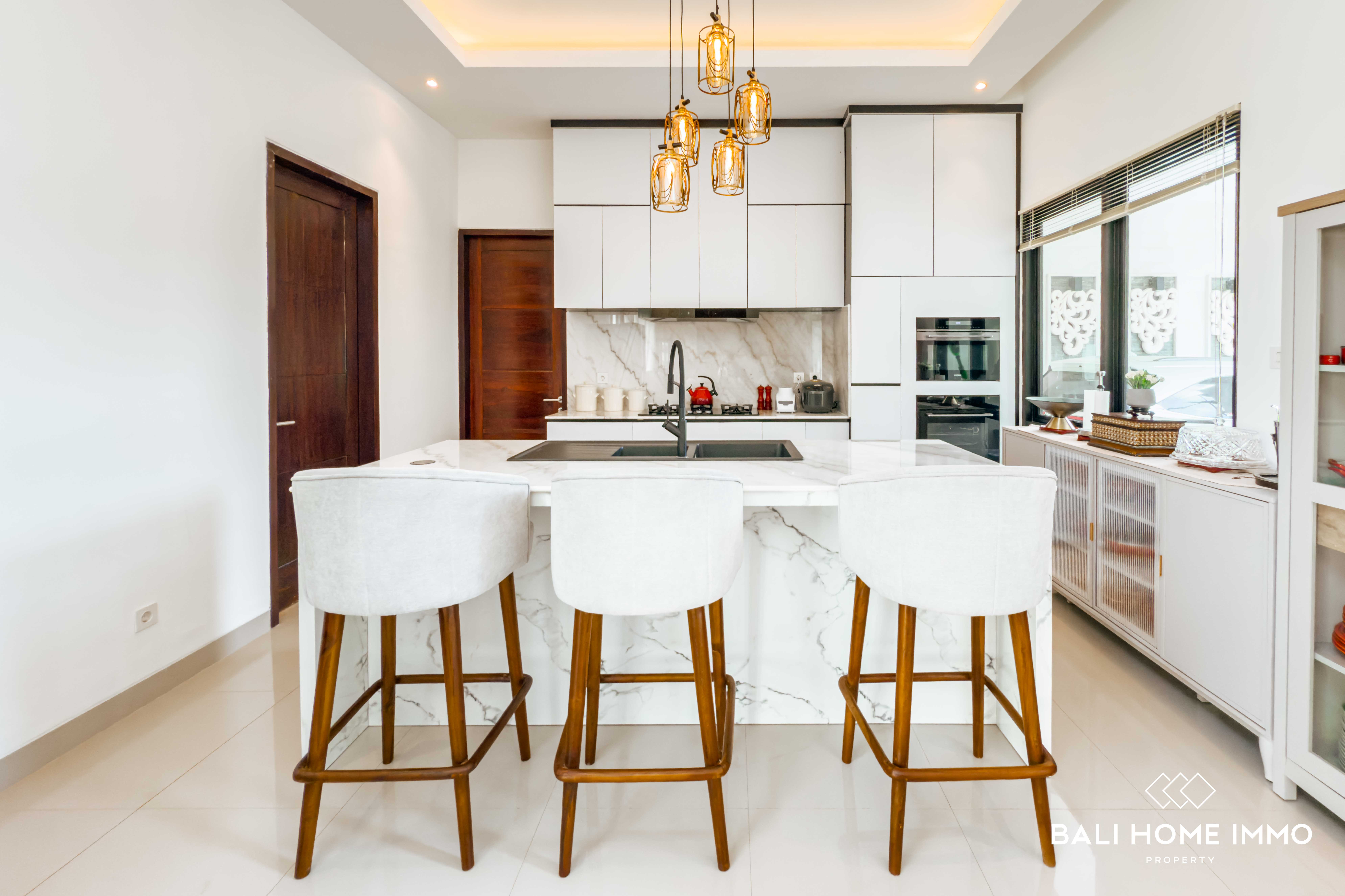Step inside and be welcomed by spacious interiors, including three generously sized bedrooms, each with its own ensuite bathroom for maximum privacy and convenience. The villa is built with high-quality materials and furnished with tasteful, durable pieces that reflect a contemporary yet warm aesthetic. The expansive living room and kitchen area boast high ceilings with stylish recessed lighting, creating a bright, open, and airy ambiance thatโs ideal for both relaxation and entertaining.