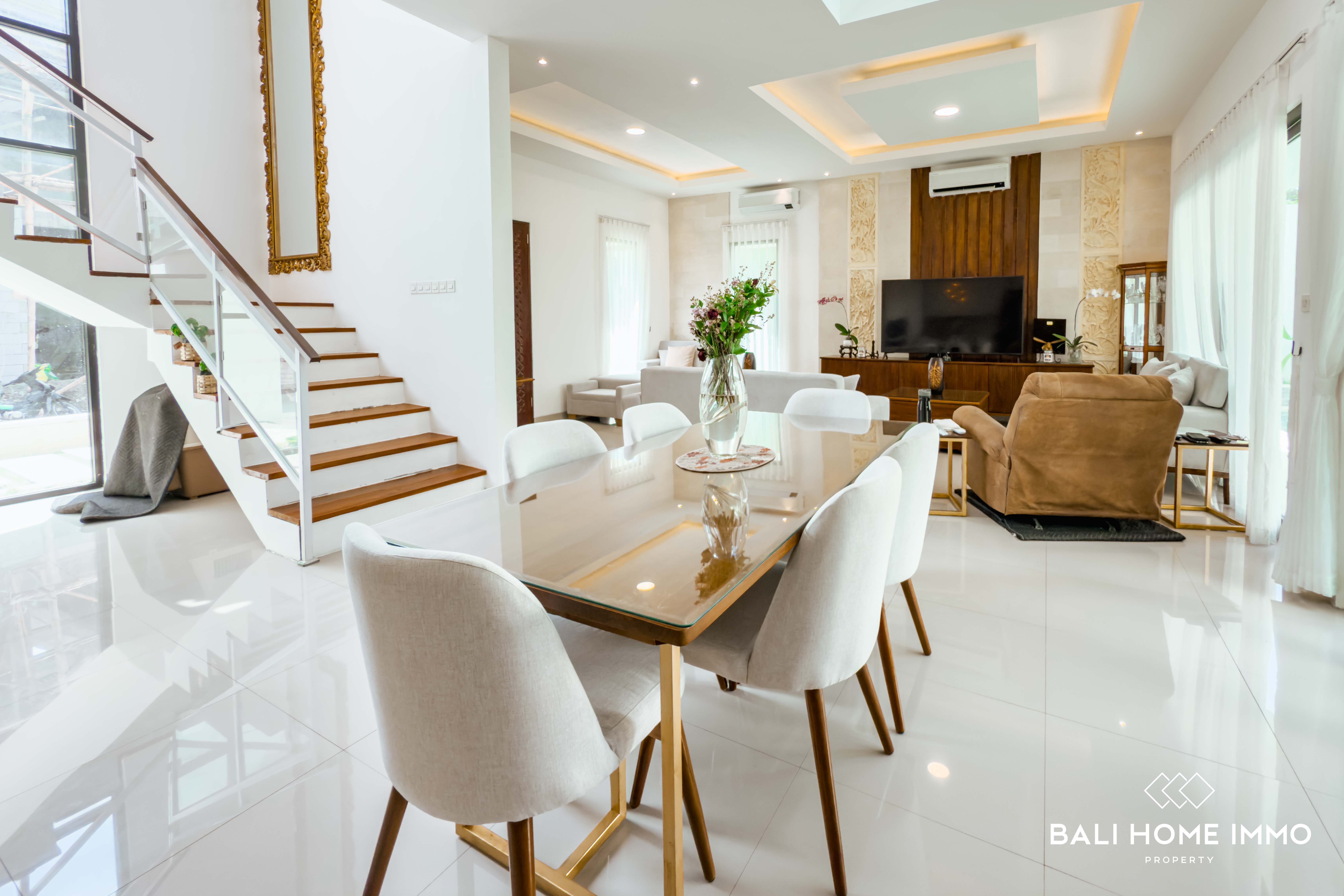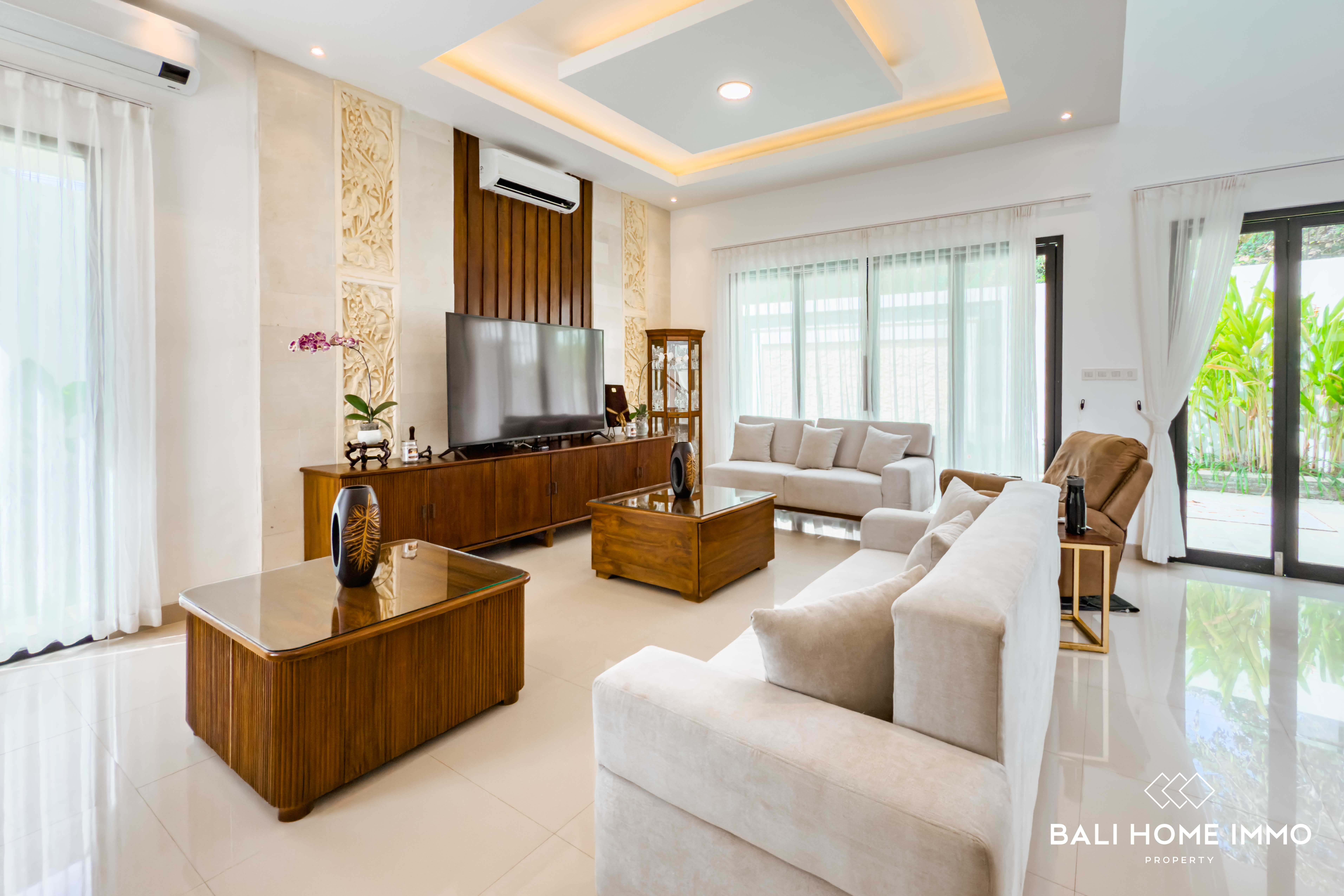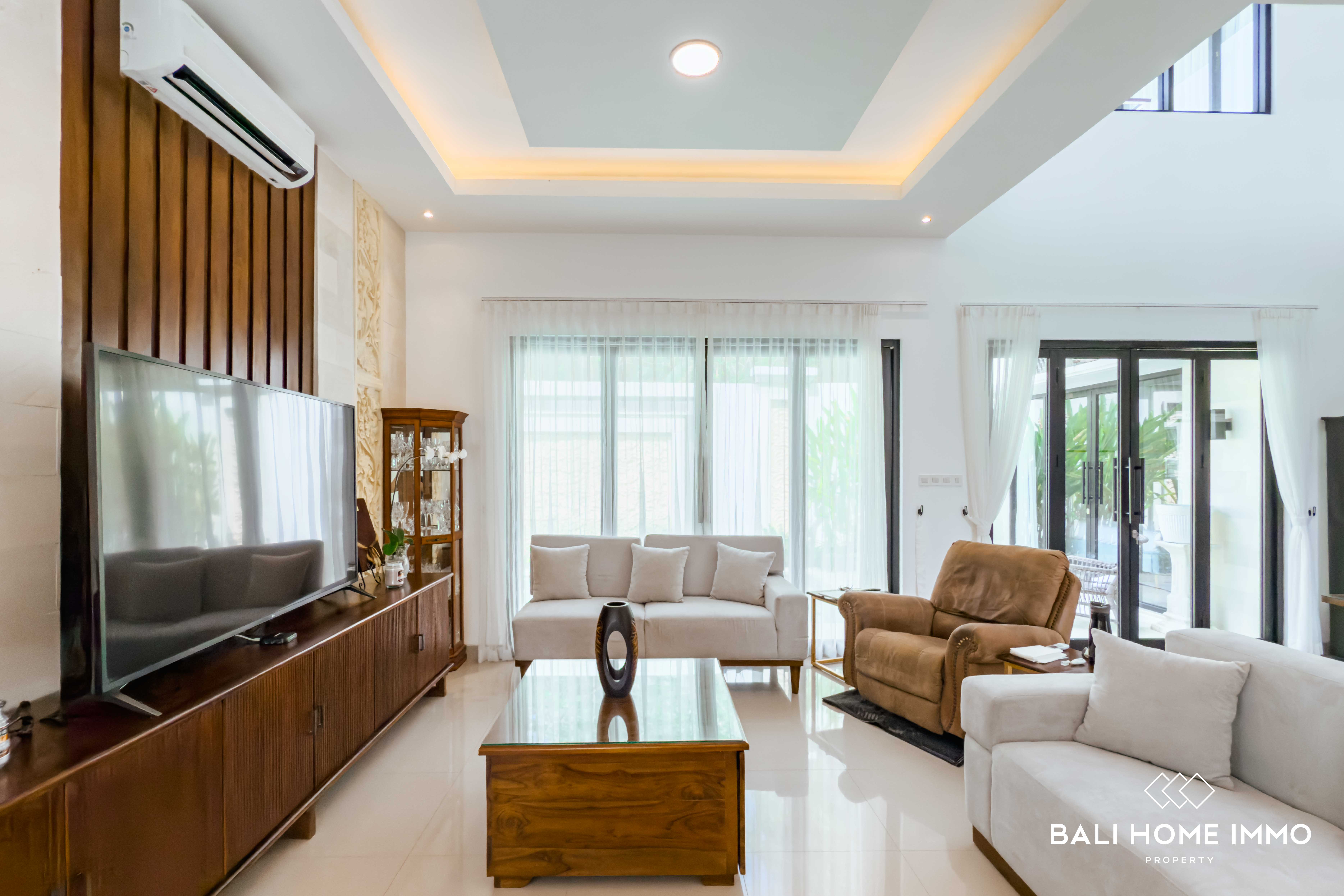 The outdoor area is equally impressive, featuring a lush garden and a spacious swimming poolโperfect for enjoying Baliโs year-round sunshine. A dedicated maid's room with its own bathroom ensures comfort and practicality for daily living. The property is securely located within a one-gate system, offering peace of mind and a sense of community.