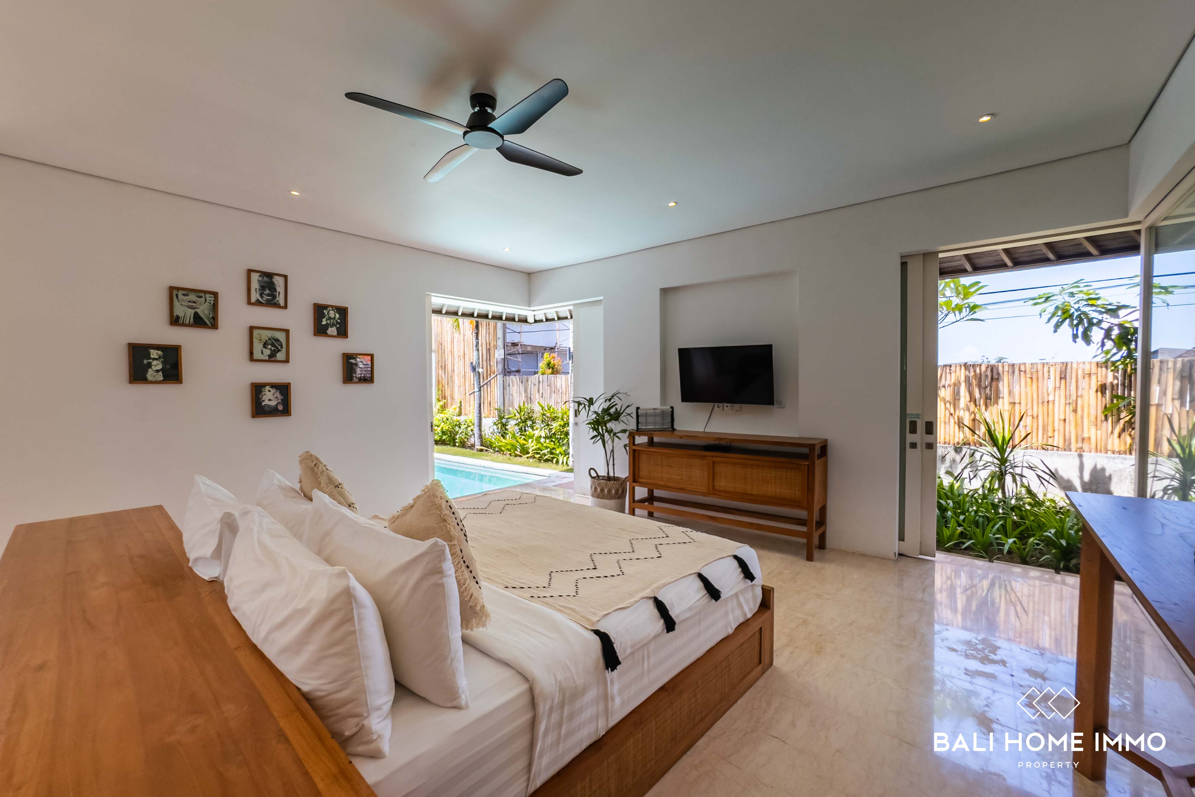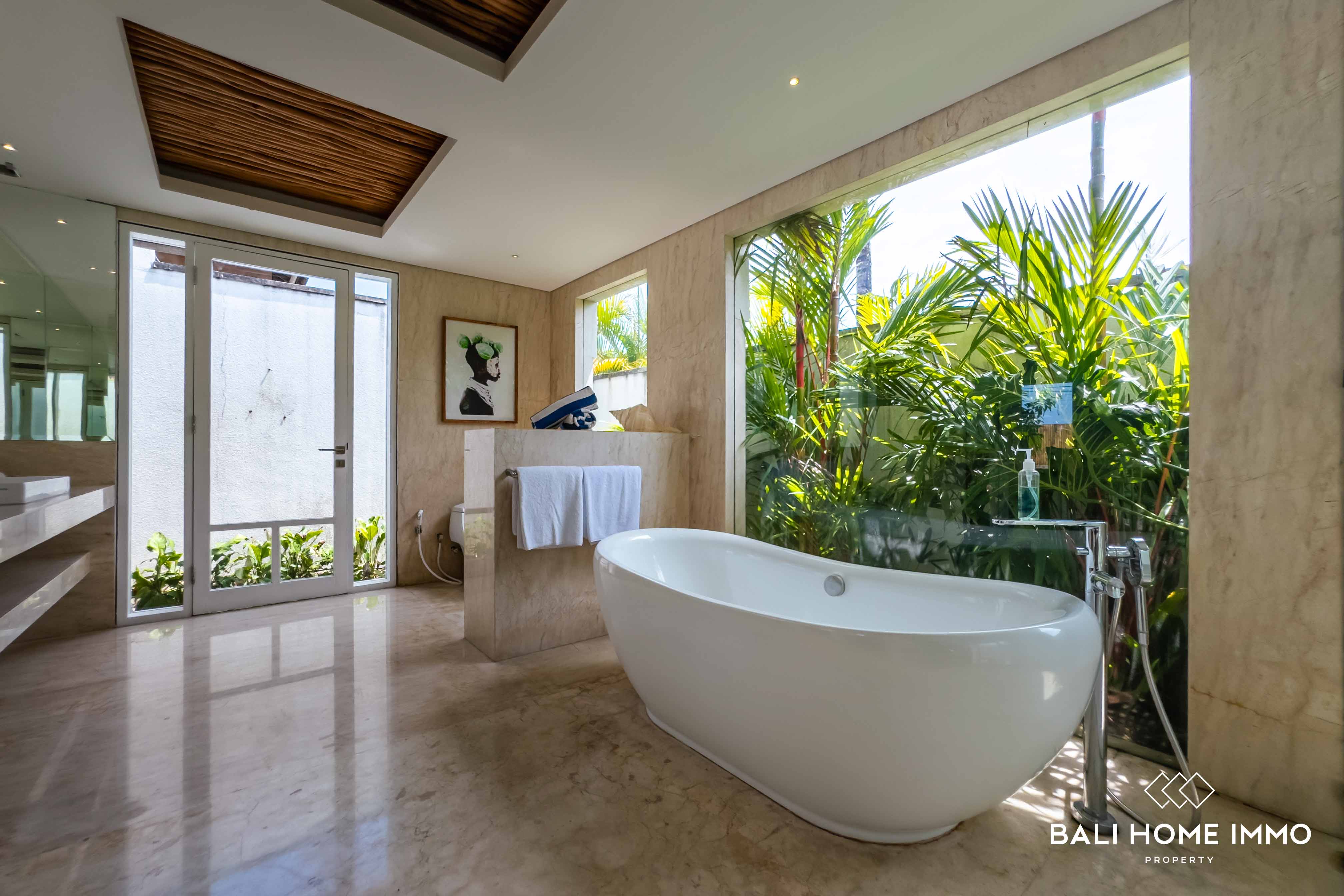 The luxurious bathroom comes complete with a freestanding bathtub, perfect for unwinding after a long day. Outside, the villa continues to impress with its expansive garden, sparkling pool, and a charming gazebo โ an ideal spot for al fresco dining or simply enjoying Baliโs beautiful weather. With its strategic location, spacious design, and exclusive amenities, this villa is a fantastic opportunity for those looking for a chic and peaceful Bali retreat.