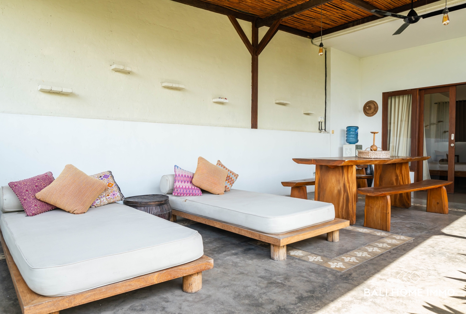 Upstairs, two ensuite bedrooms enjoy their own private balconies, complemented by a cozy open lounge beneath a pergola — a lovely spot for morning coffee or quiet afternoons under the sun.