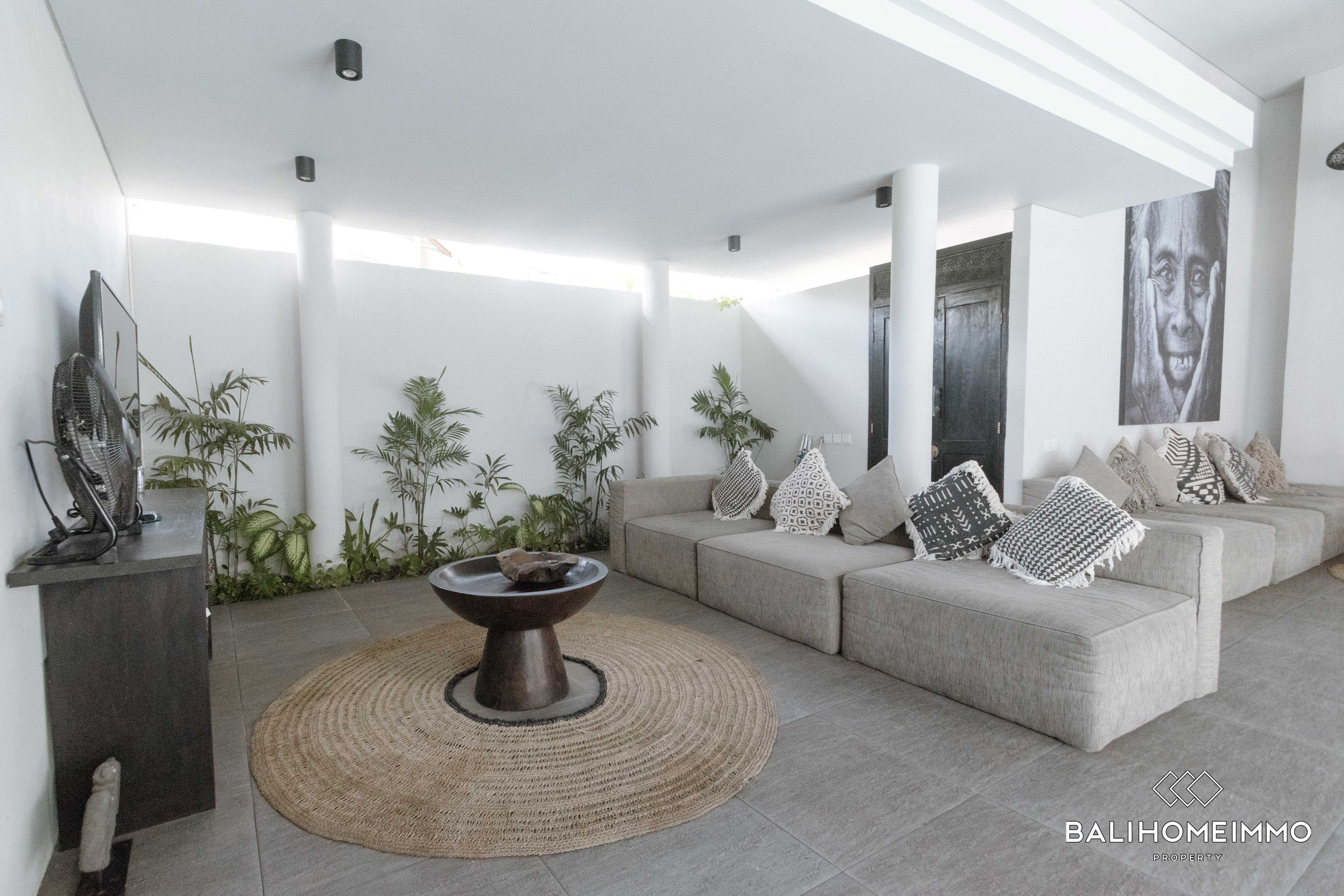 Constructed in 2020, the two-story building showcases a modern design that seamlessly integrates with the surrounding environment. The living room, opened to embrace the tropical atmosphere, serves as the perfect gathering space, allowing residents to enjoy the balmy Canggu weather.