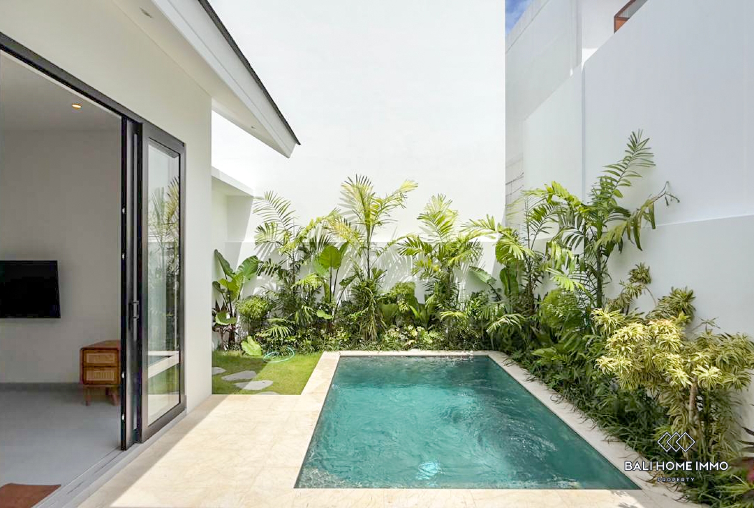 Built on 135 sqm of land, this one-bedroom villa was completed in early 2026 and designed with a refined modern tropical white concept that feels bright, elegant, and inviting. The villa sits within a complex of brand-new properties and benefits from car access with its own private parking space. Inside, the enclosed living area with large glass doors opens beautifully toward the private swimming pool and small garden, creating a seamless connection between indoor comfort and outdoor relaxation. The villa is fully furnished with high-quality teakwood and custom-made furniture, giving the space a warm and sophisticated character. The modern kitchen is fully equipped with quality appliances, complemented by a stylish Quadra dining table, known for its elegant appearance and durable anti-scratch surface.