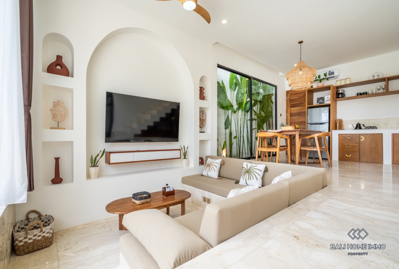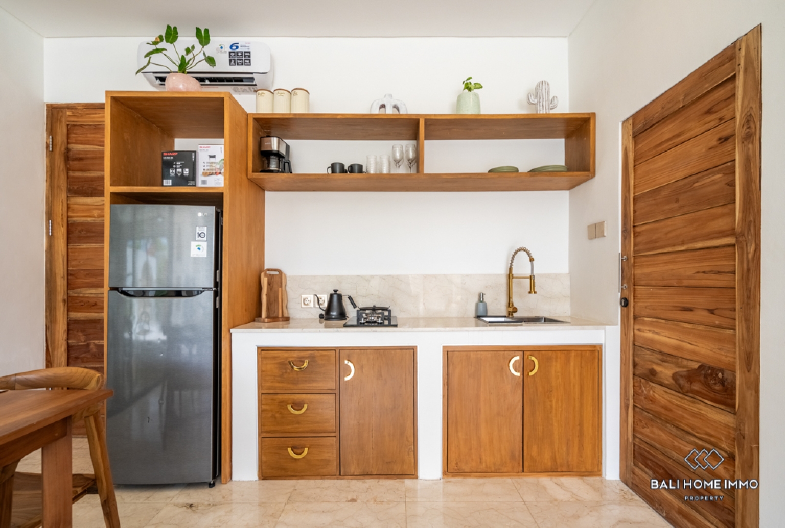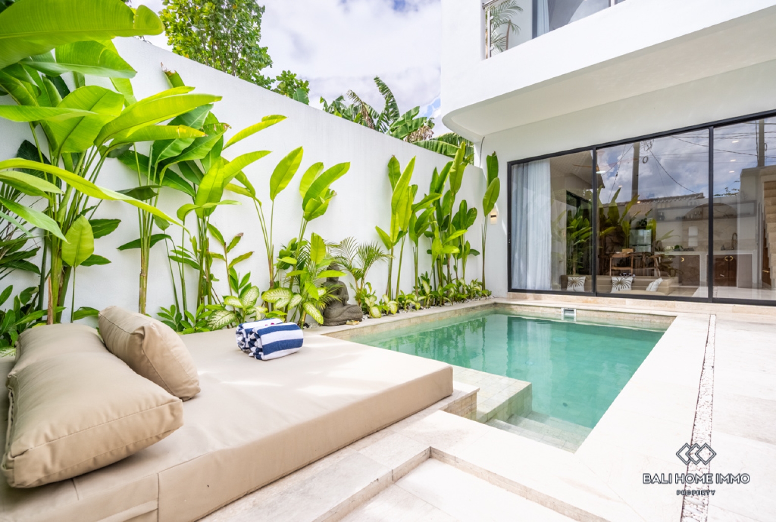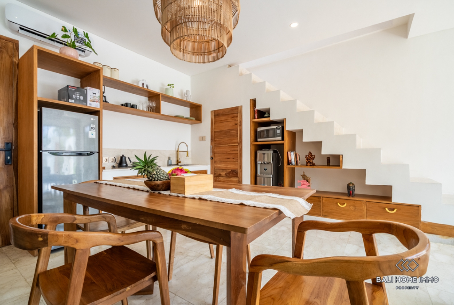 This beautifully designed one-bedroom villa in Berawa offers a perfect blend of comfort and modern living. Set across two levels, the property features a sleek, contemporary design with high-quality furnishings throughout. The spacious bedroom includes an ensuite bathroom, creating a private and relaxing retreat. Large windows invite natural light into the enclosed living and kitchen area, enhancing the open yet cozy atmosphere. The fully equipped kitchen seamlessly connects to the living space, making it ideal for both daily living and entertaining.